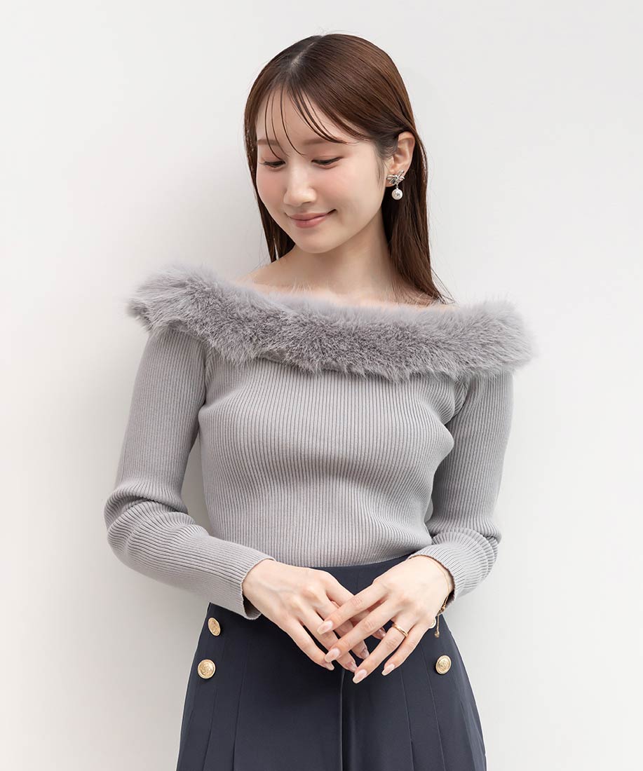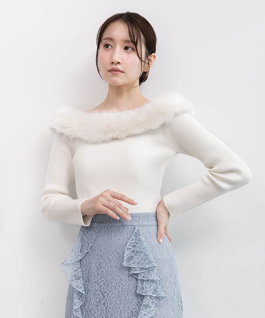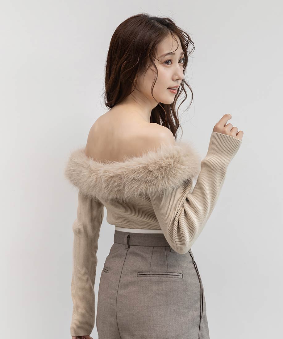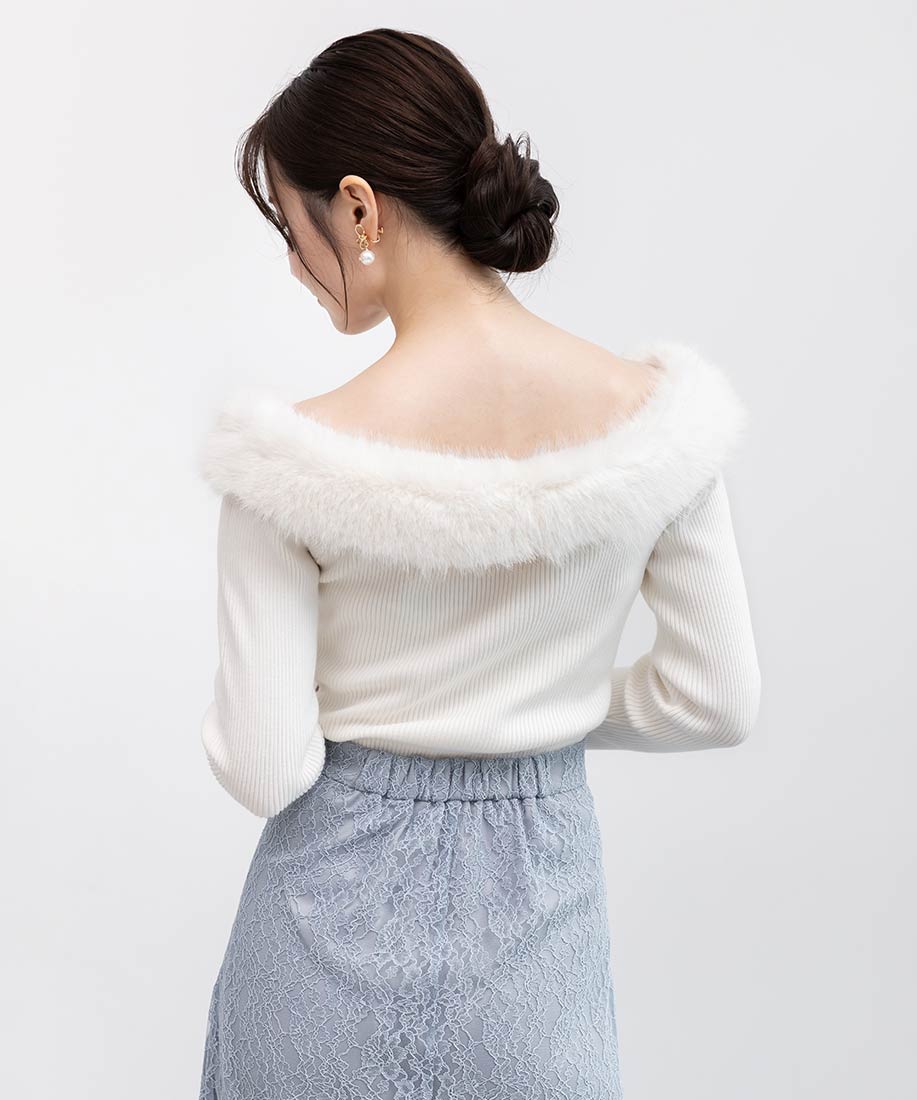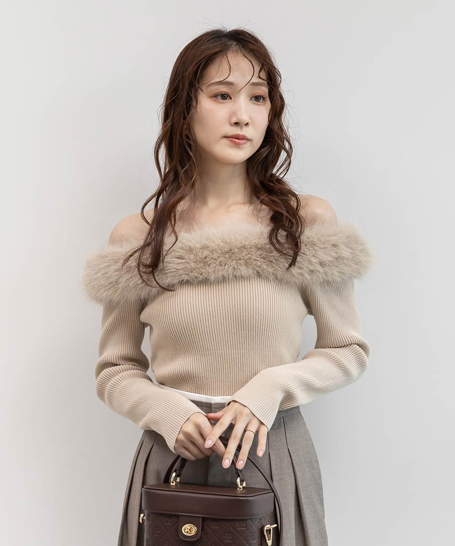 デコルテにふわふわのファーをあしらったオフショルニットトップス。