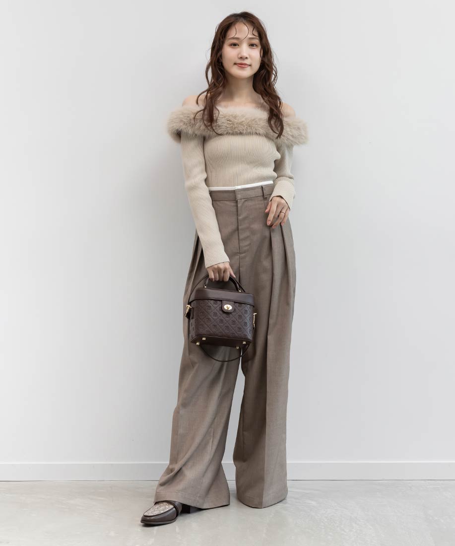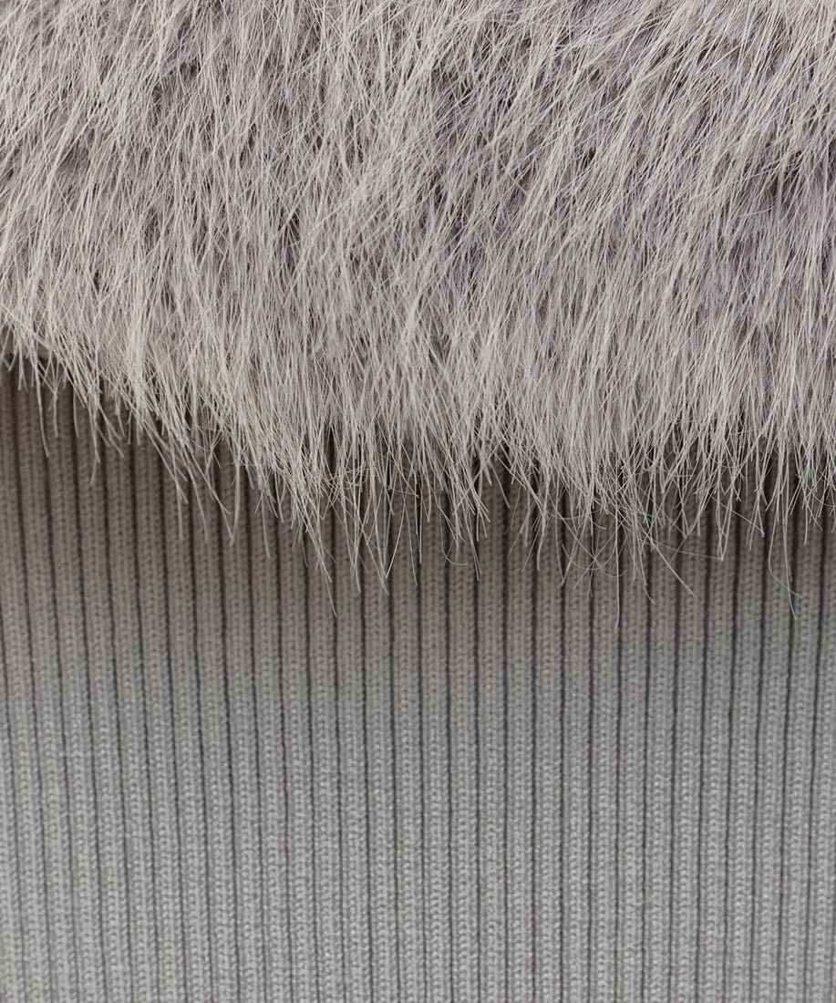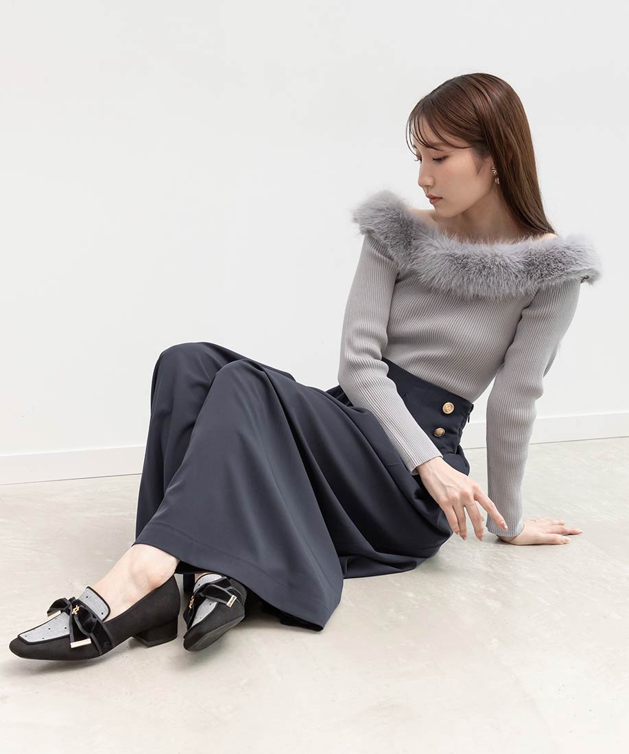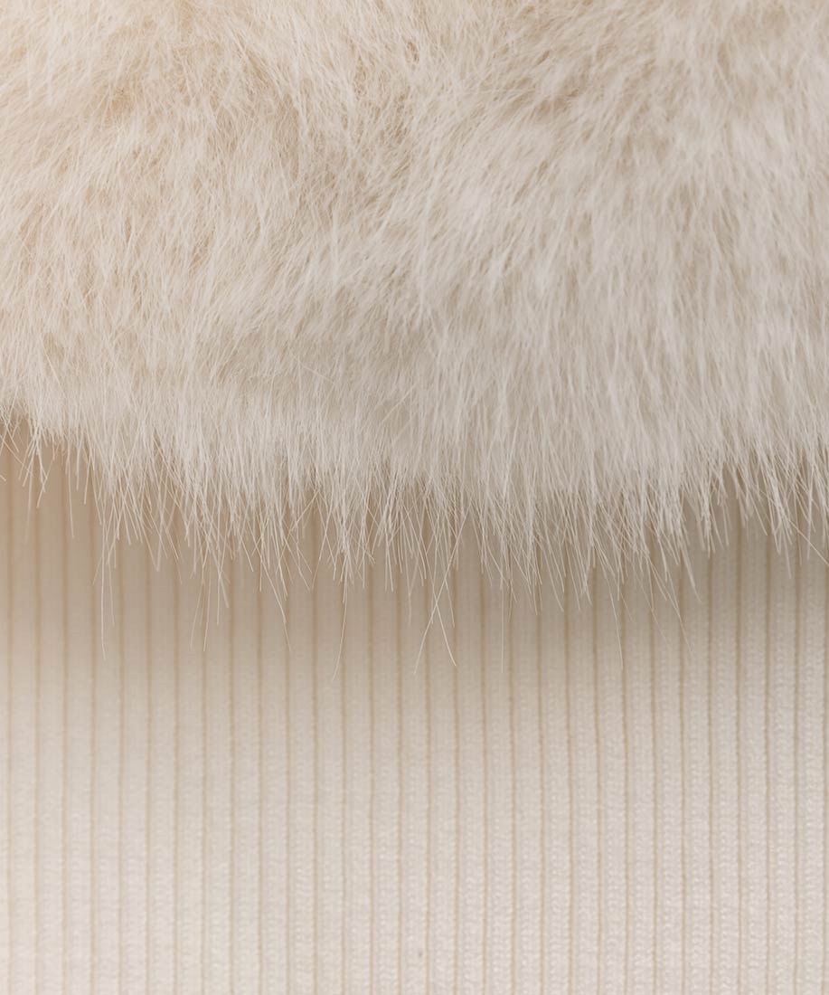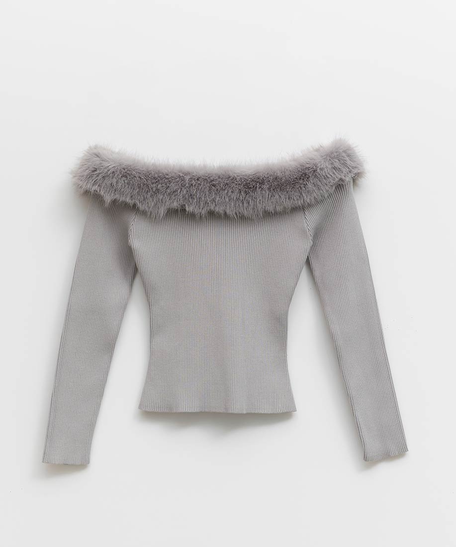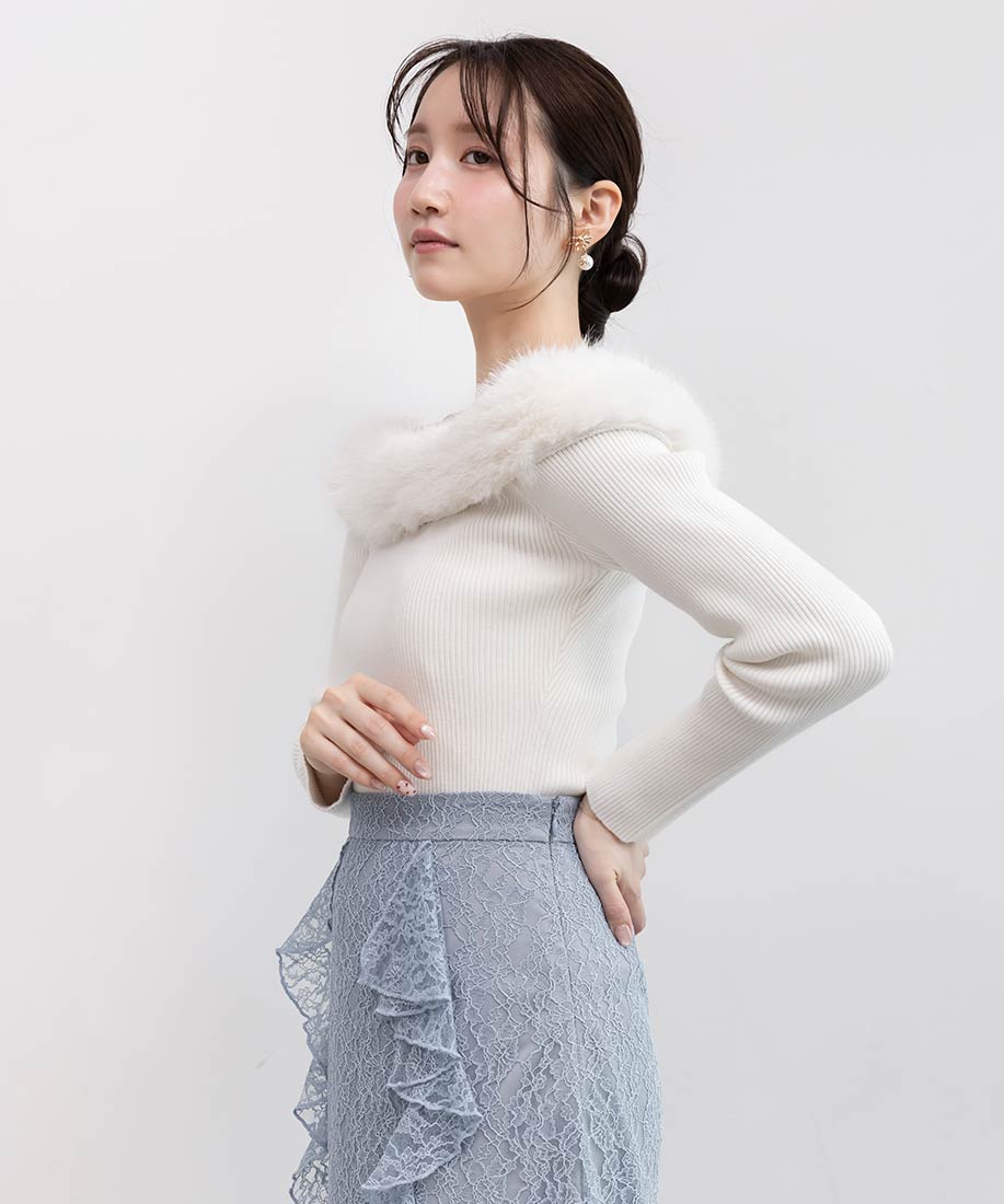 デコルテにふわふわのファーをあしらったオフショルニットトップス。