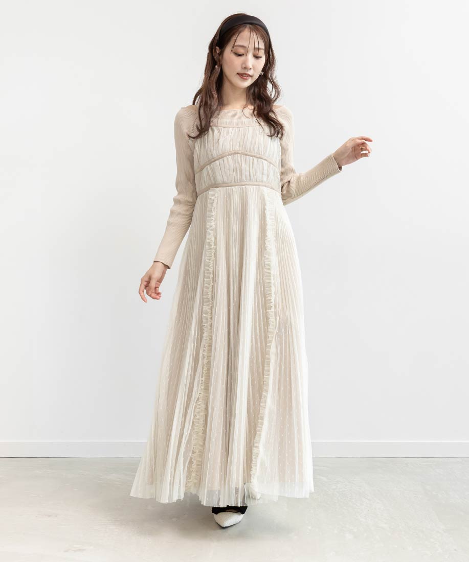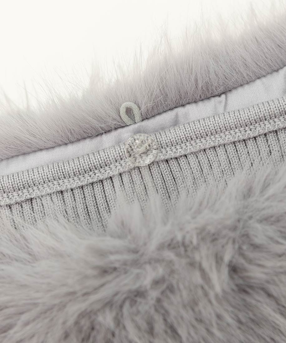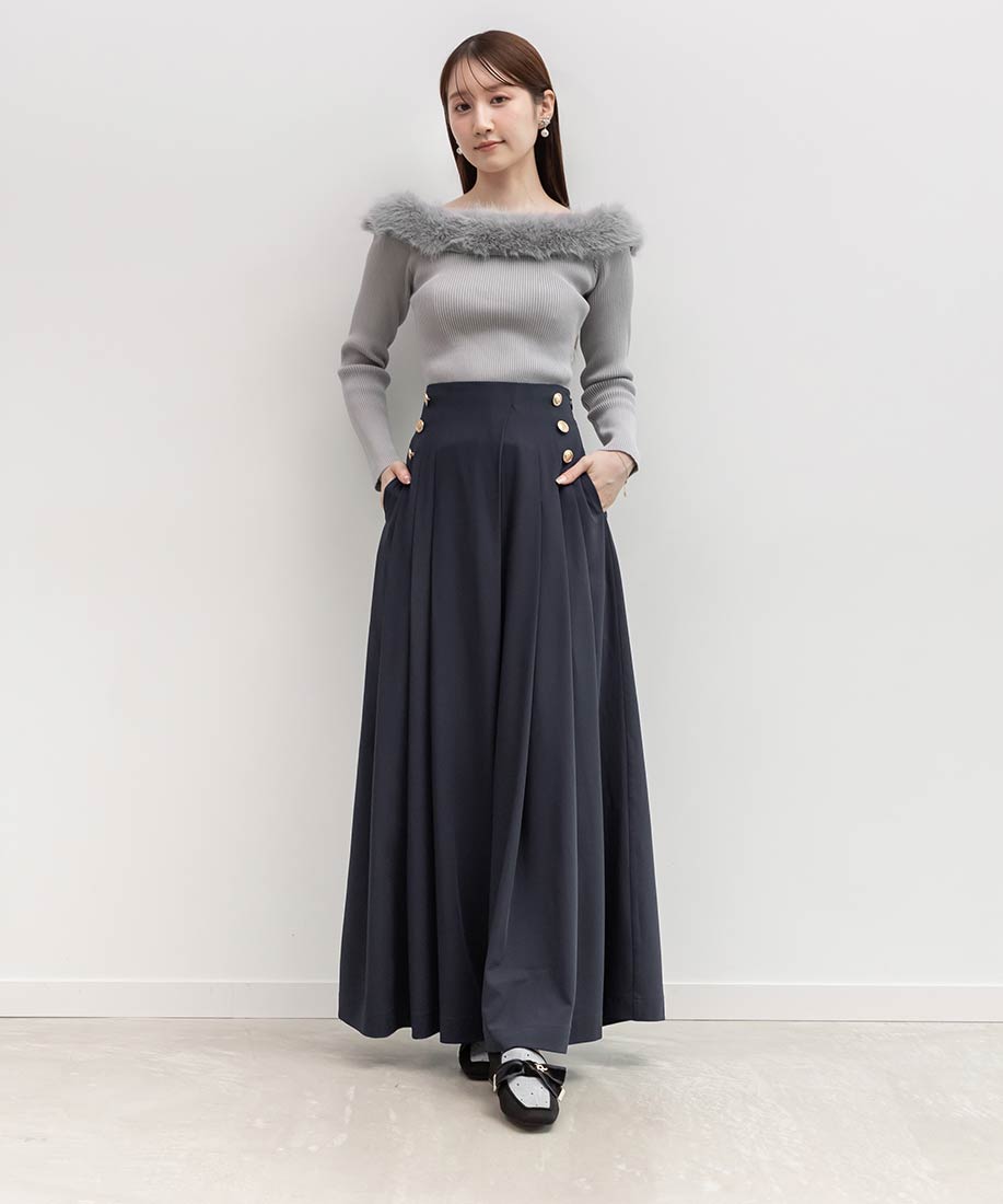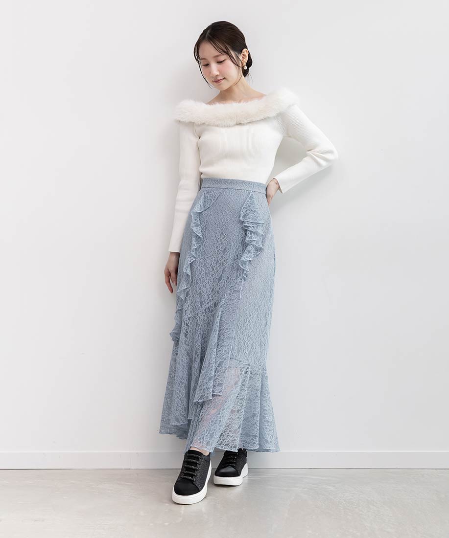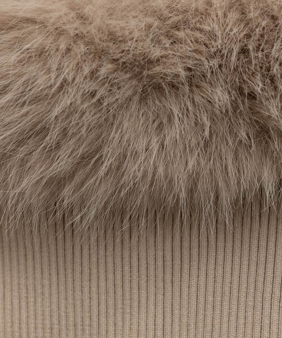 デコルテにふわふわのファーをあしらったオフショルニットトップス。