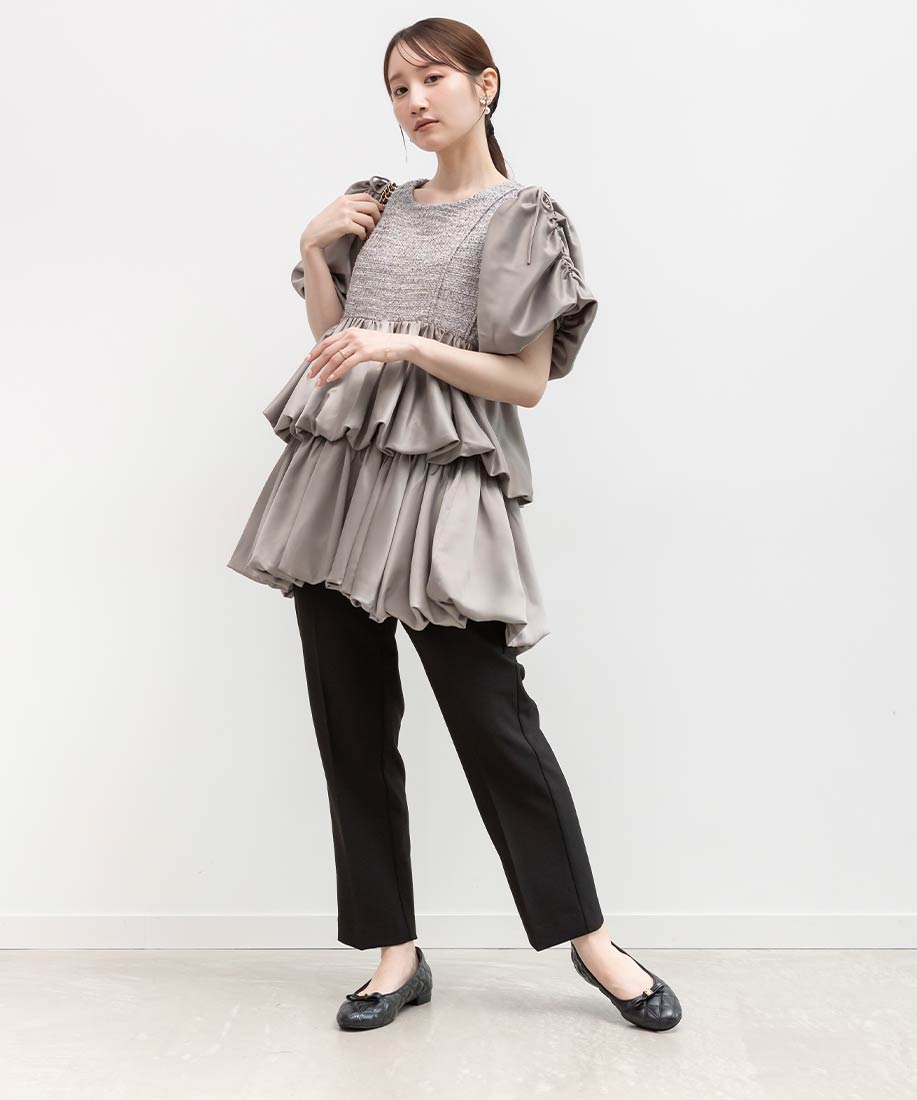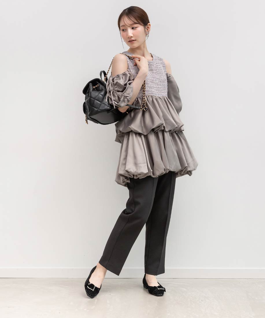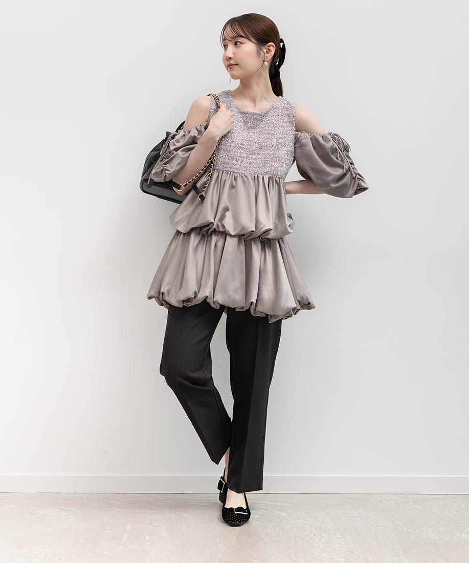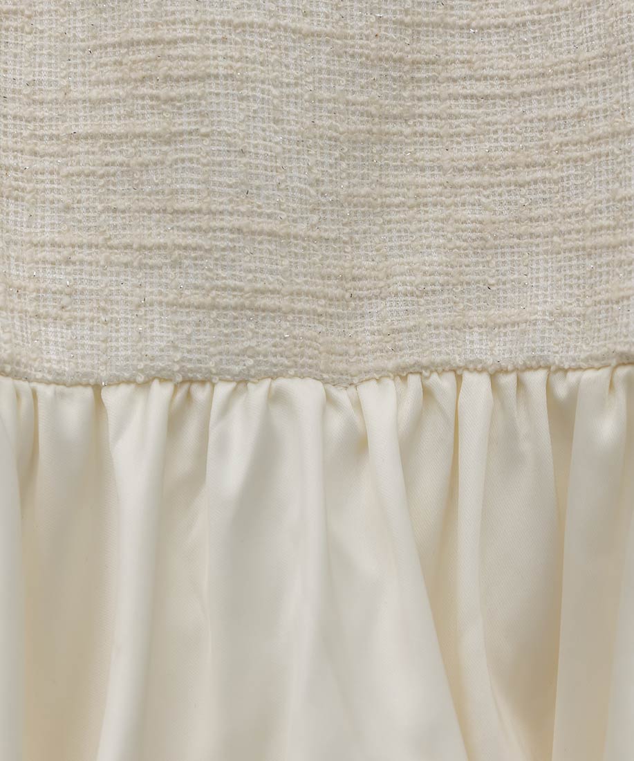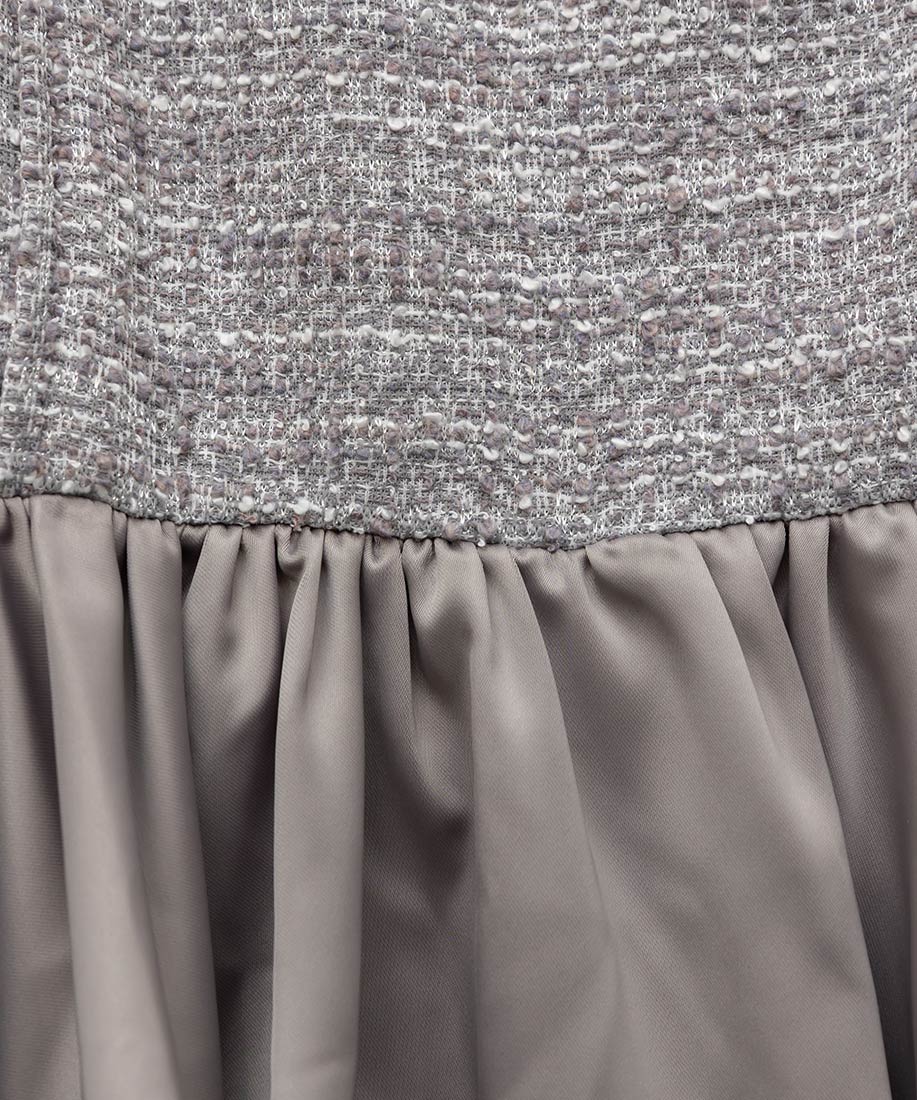 ブラック・グレージュ⇒(表地)ポリエステル70%、レーヨン15%、綿13%、ポリウレタン2%(スリット糸使用)(別布)ポリエステル100%(裏地)ポリエステル95%、ポリウレタン5%ホワイト⇒(表地)ポリエステル71%、綿24%、ポリウレタン5%(スリット糸使用)(別布)ポリエステル100%(裏地)ポリエステル95%、ポリウレタン5%