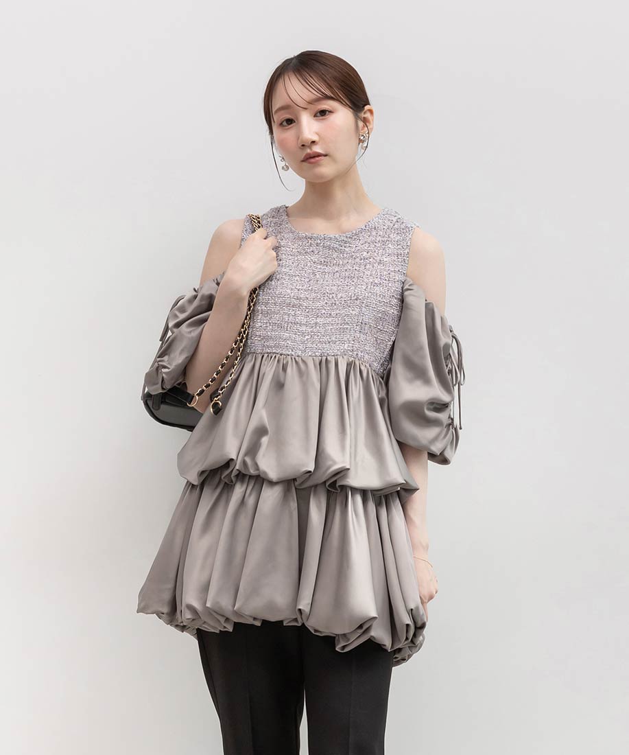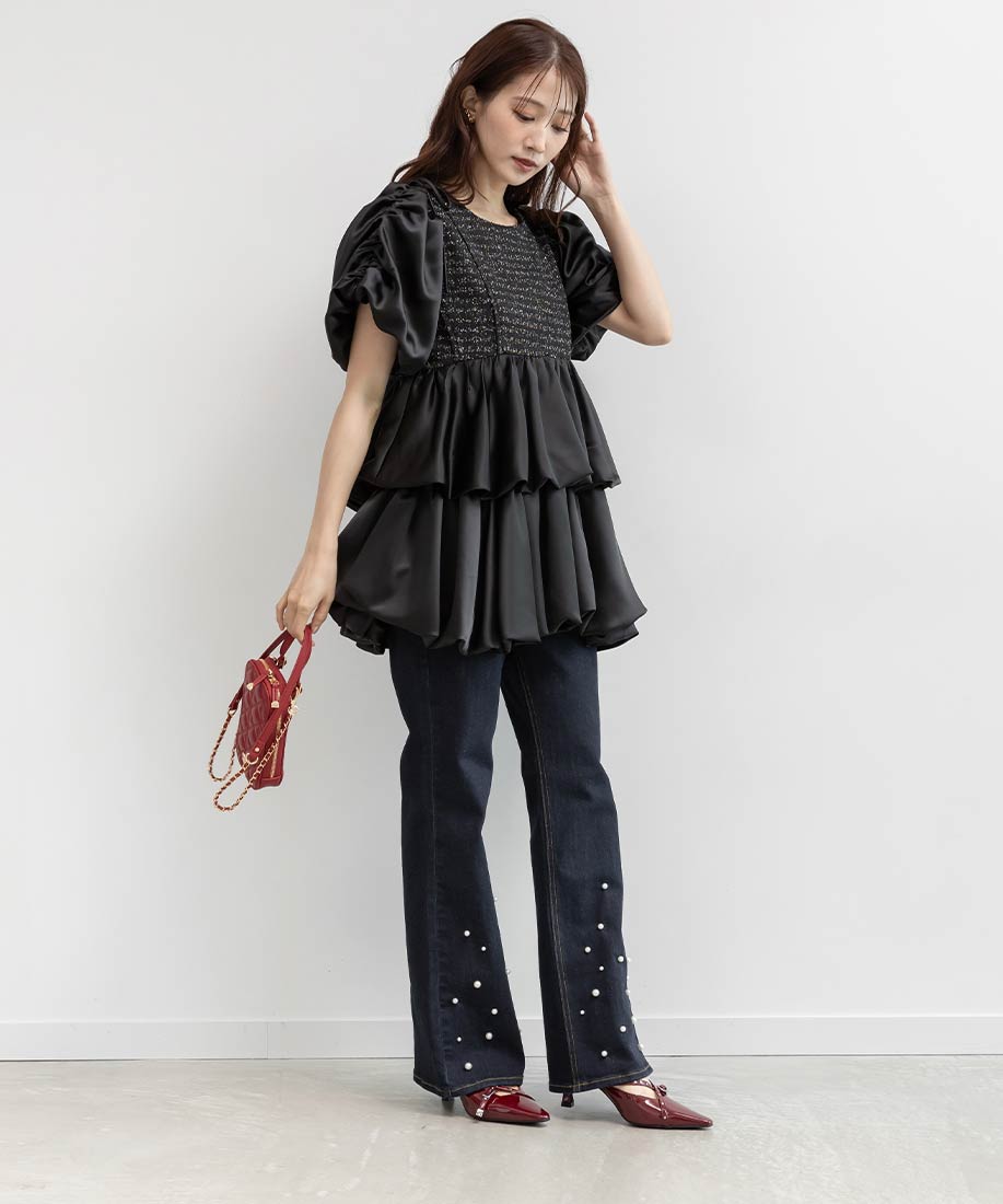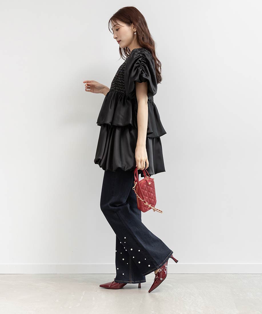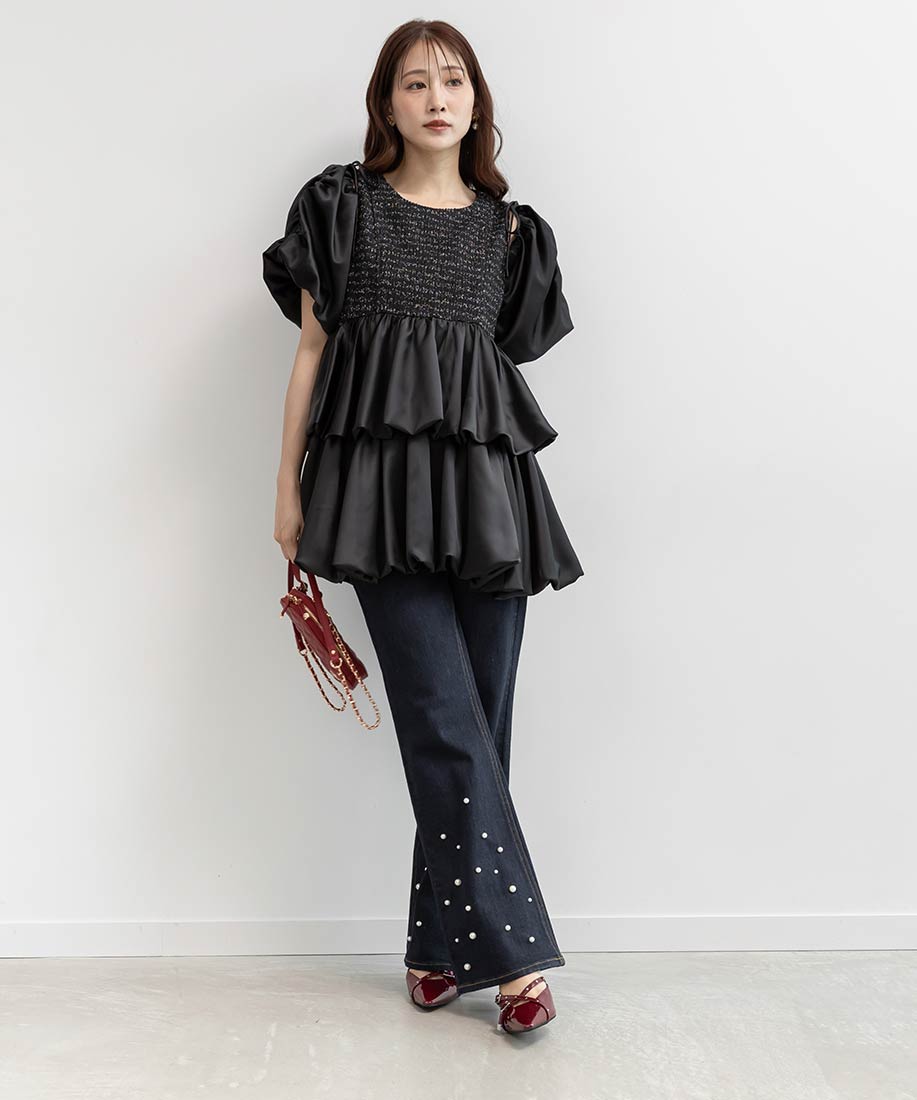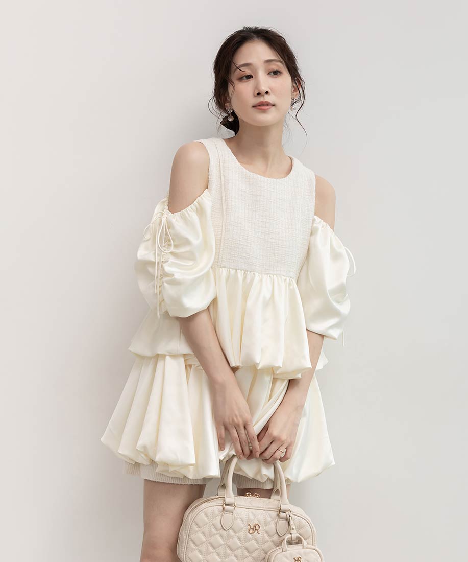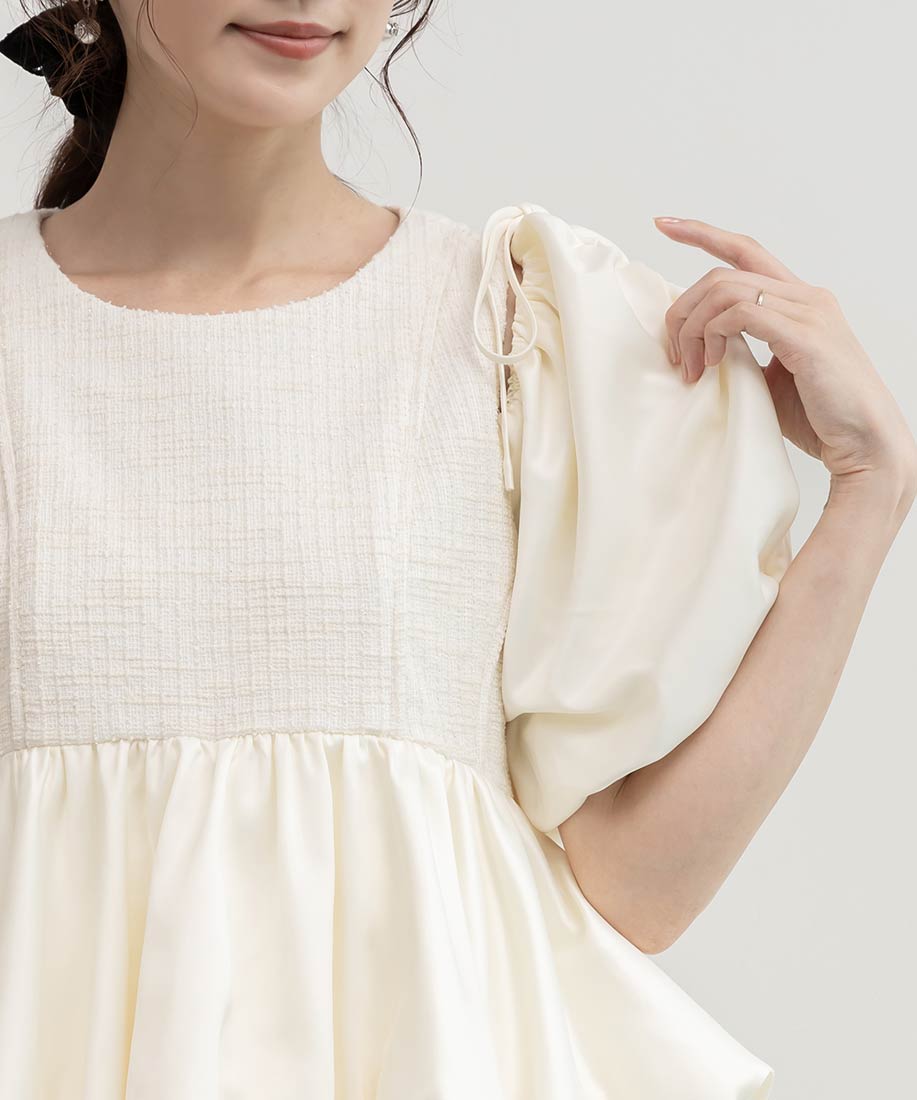 ブラック・グレージュ⇒(表地)ポリエステル70%、レーヨン15%、綿13%、ポリウレタン2%(スリット糸使用)(別布)ポリエステル100%(裏地)ポリエステル95%、ポリウレタン5%ホワイト⇒(表地)ポリエステル71%、綿24%、ポリウレタン5%(スリット糸使用)(別布)ポリエステル100%(裏地)ポリエステル95%、ポリウレタン5%