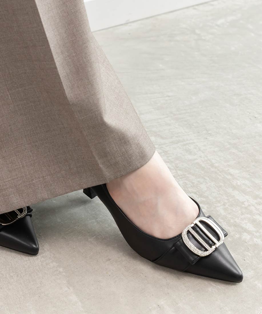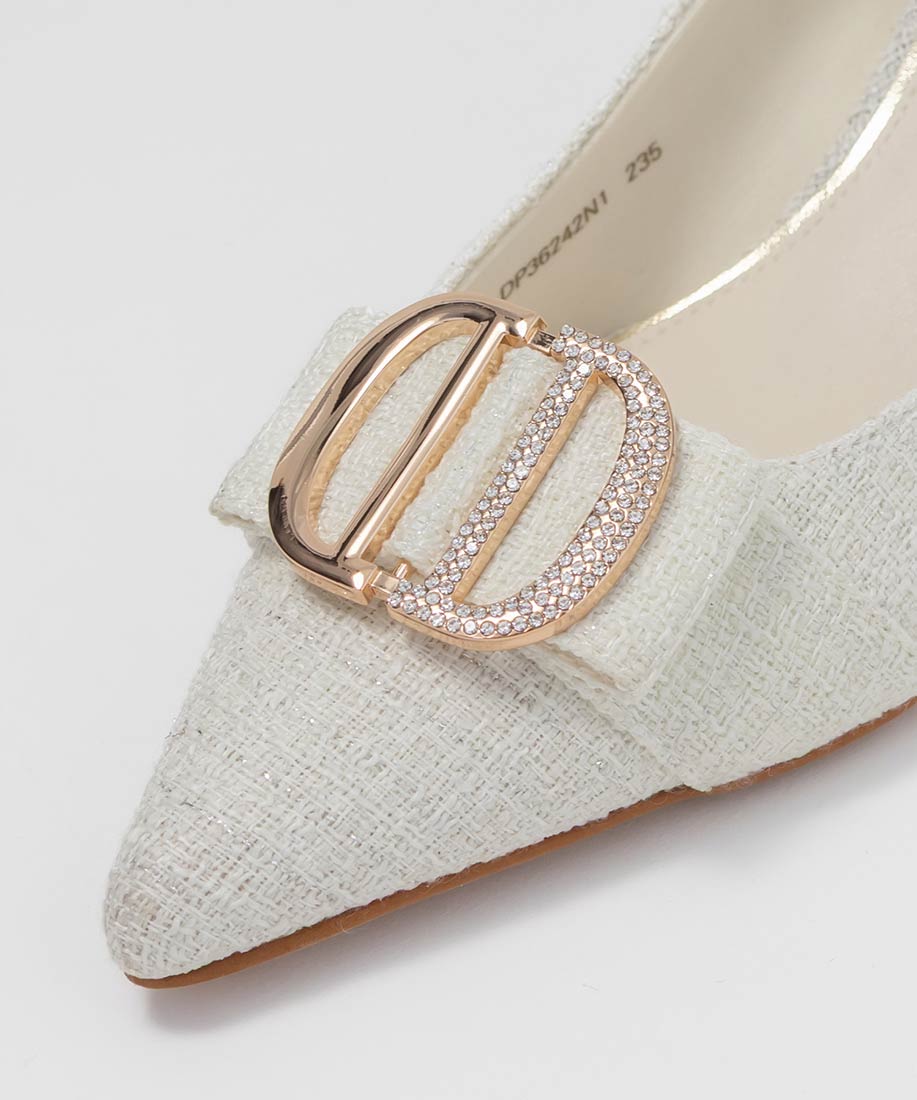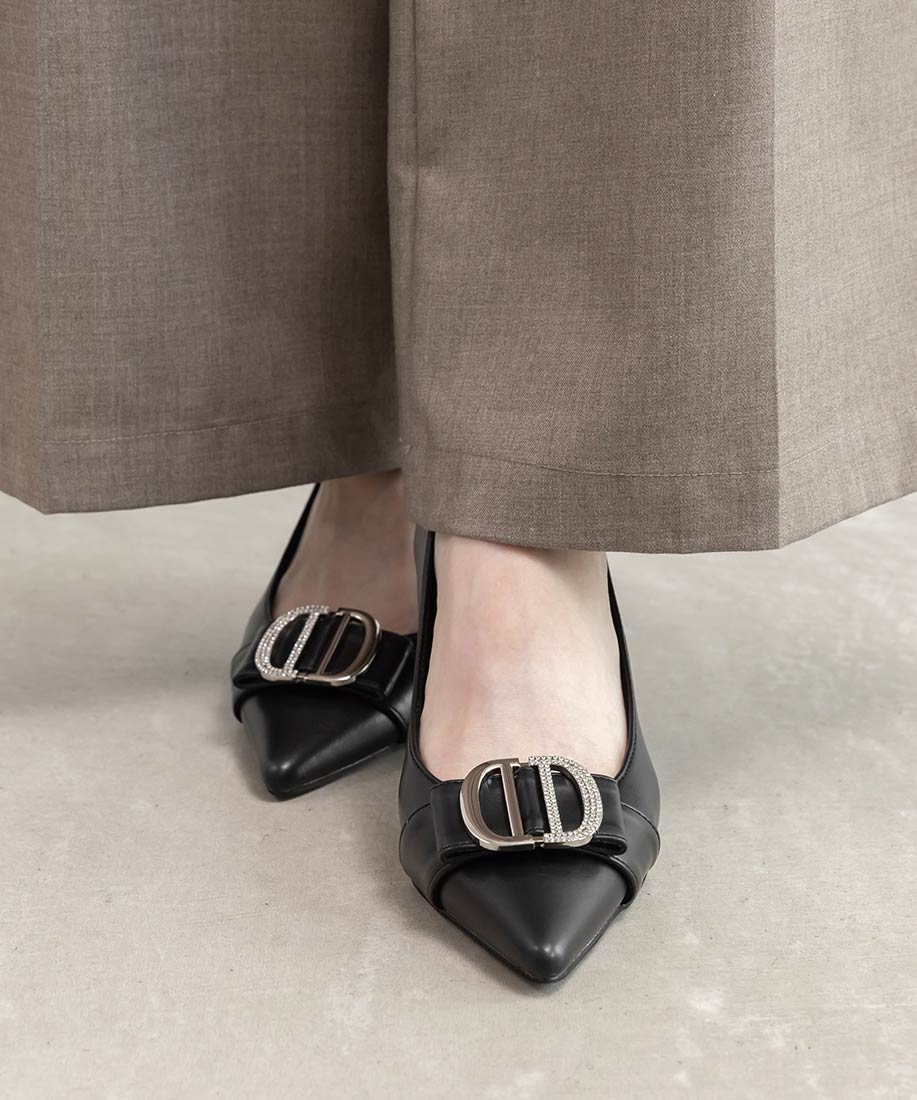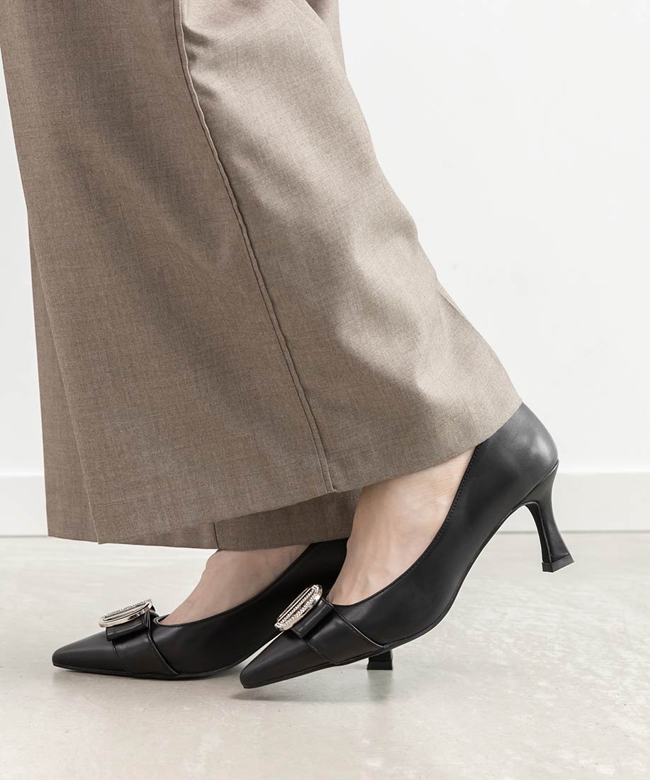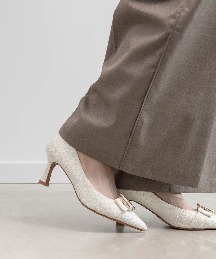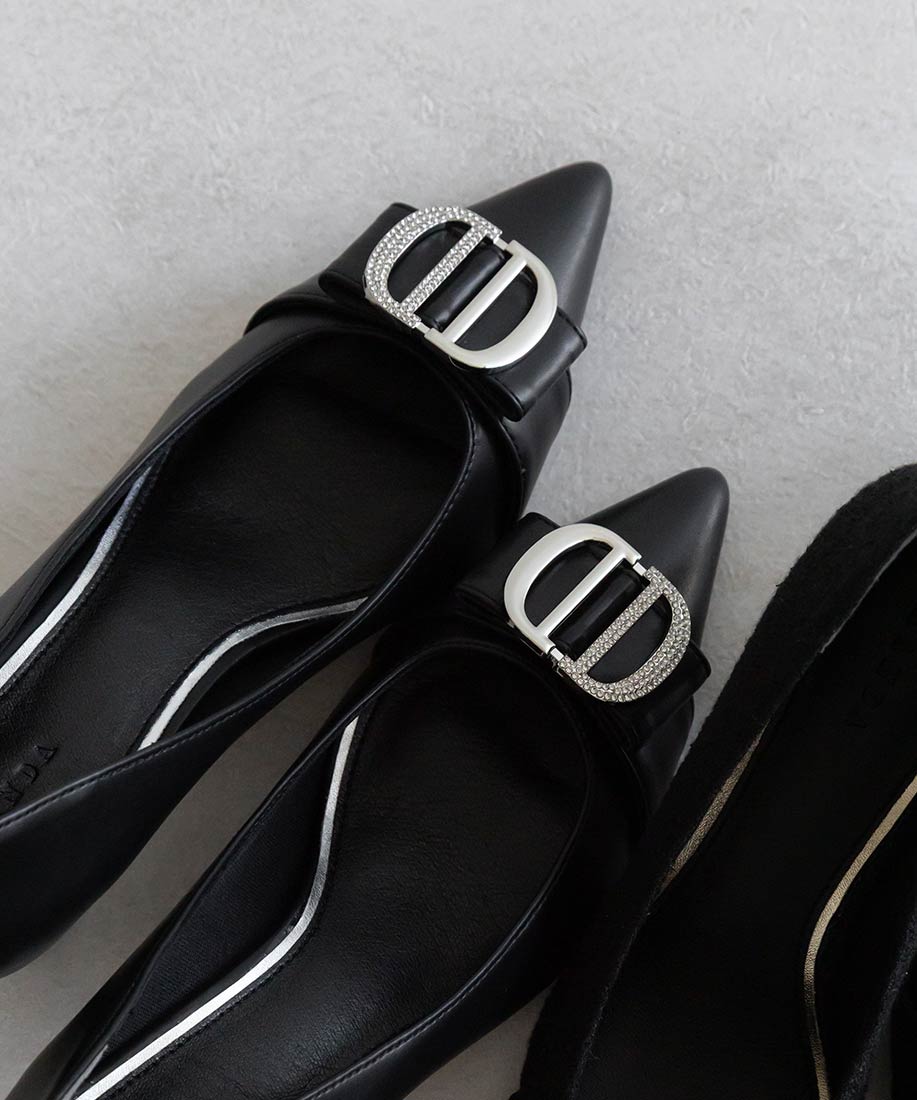 ビジューパーツ×畳みリボンが華やかなポインテッドトゥパンプス。