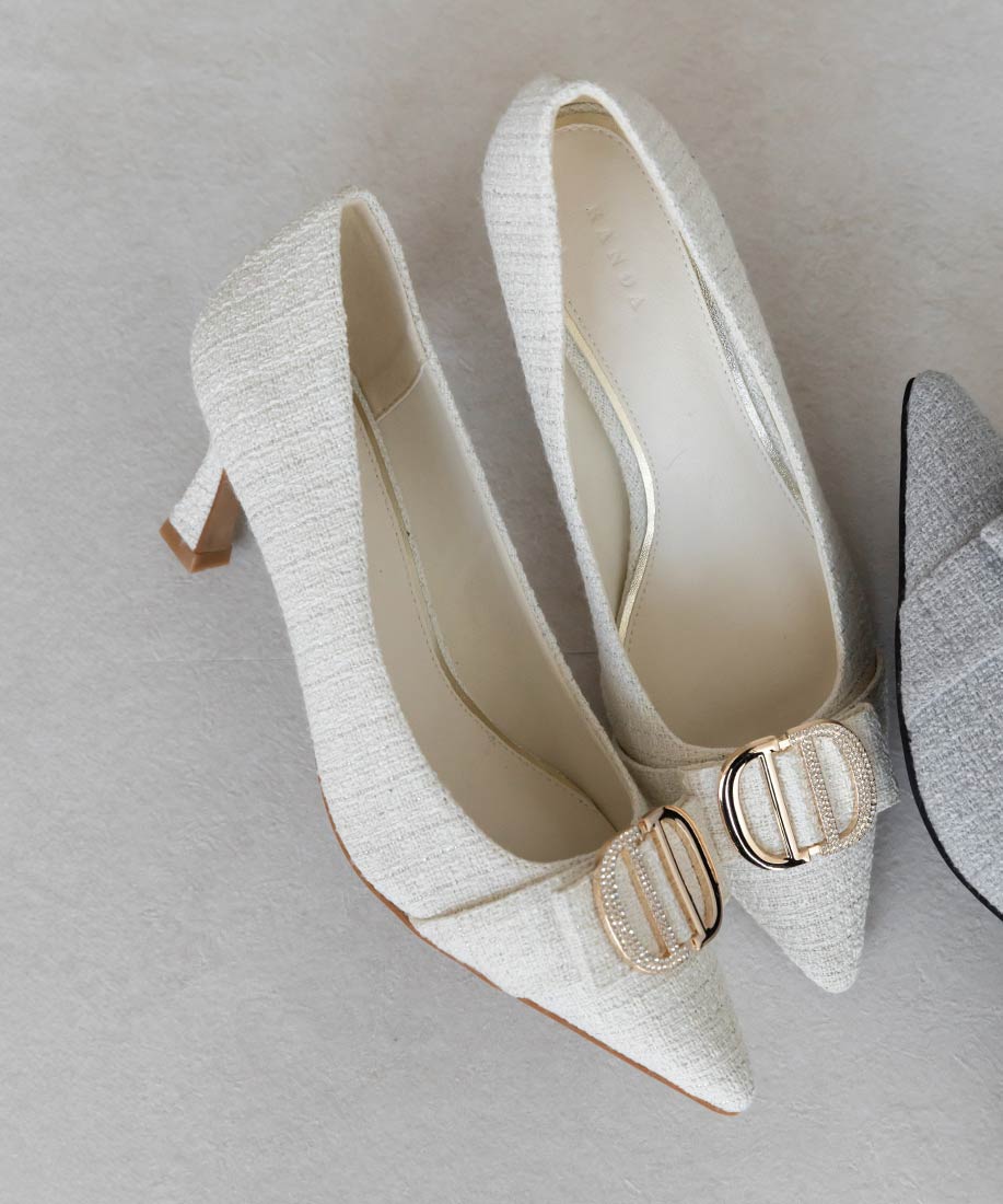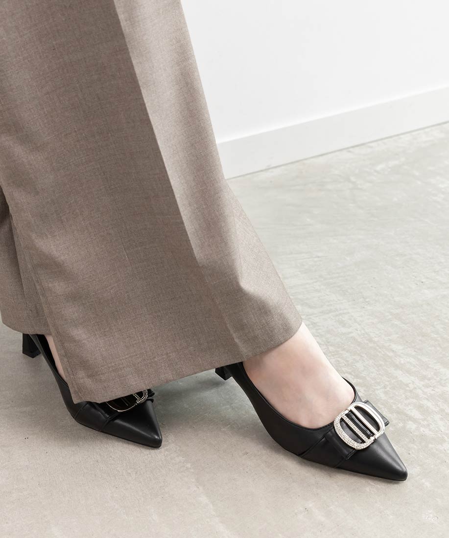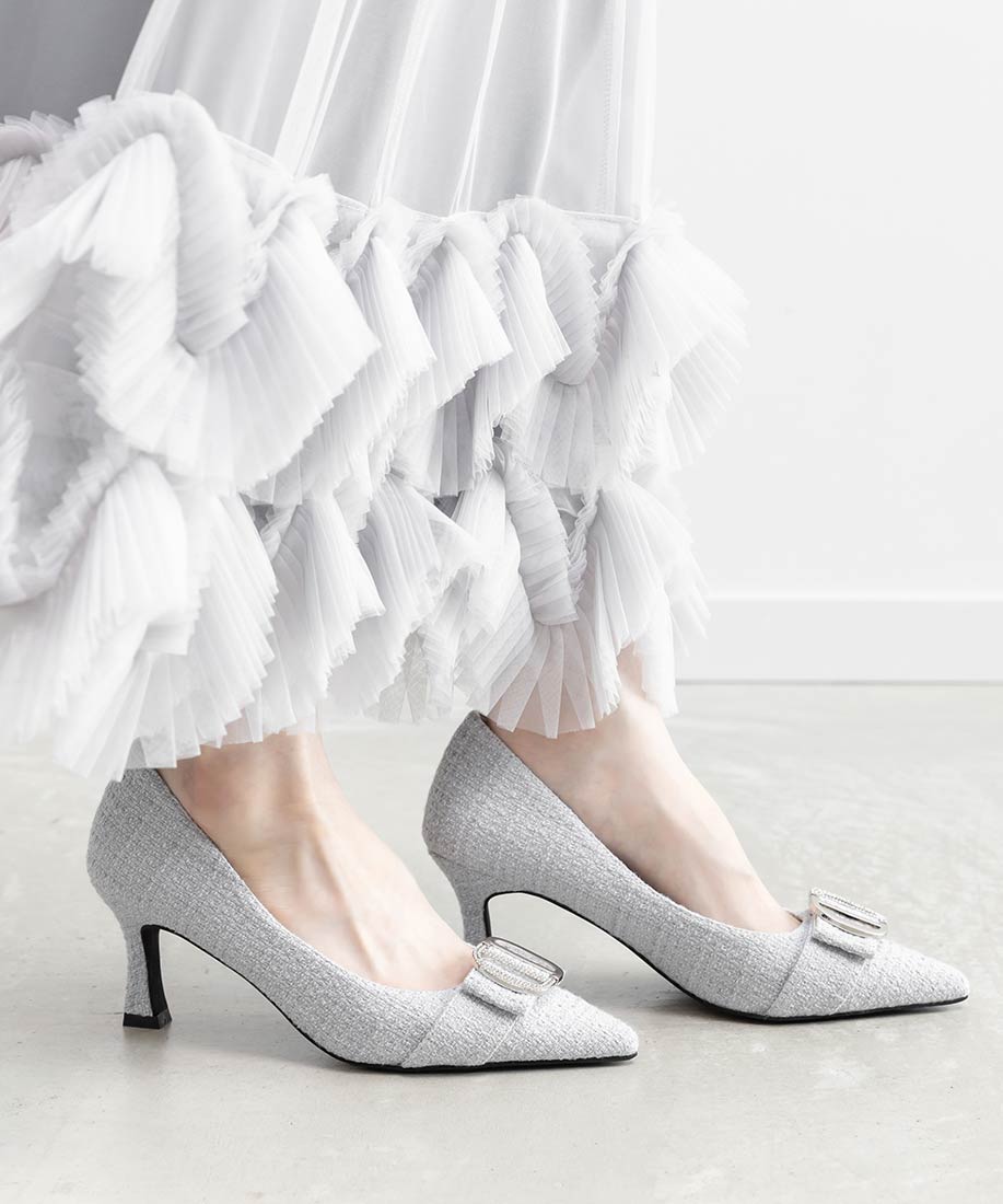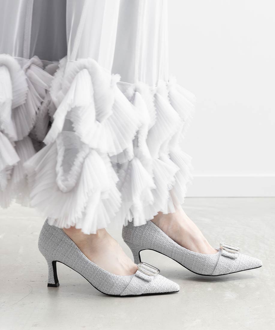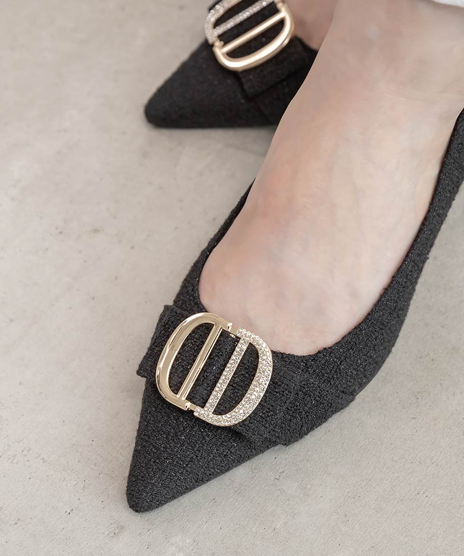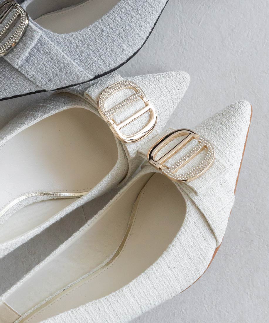 ビジューパーツ×畳みリボンが華やかなポインテッドトゥパンプス。