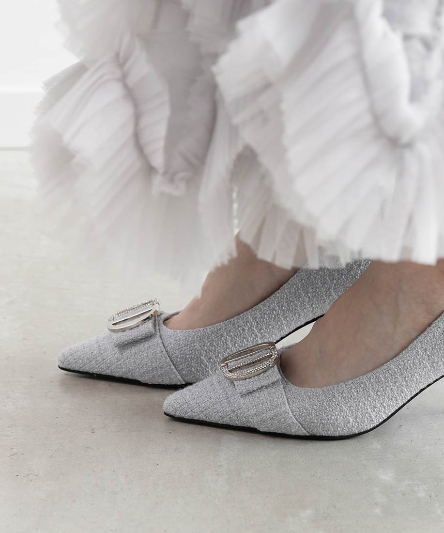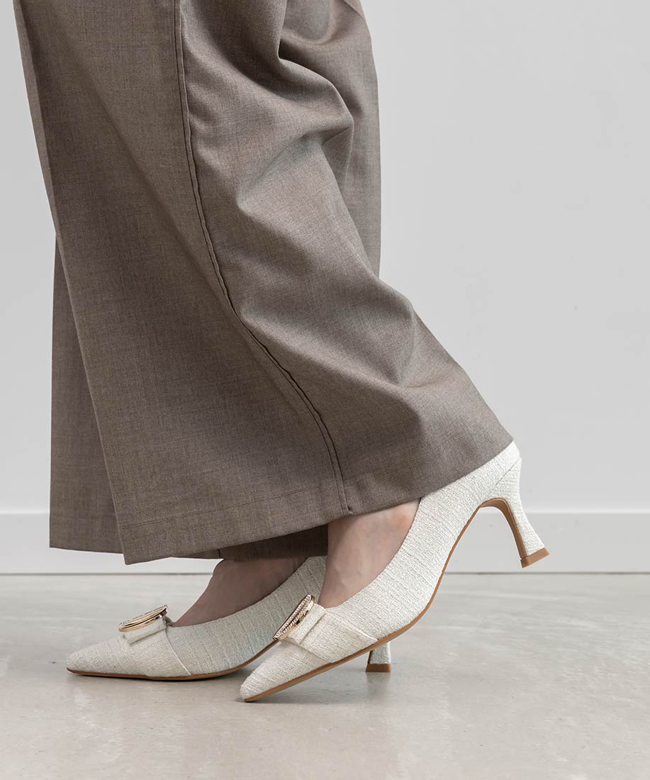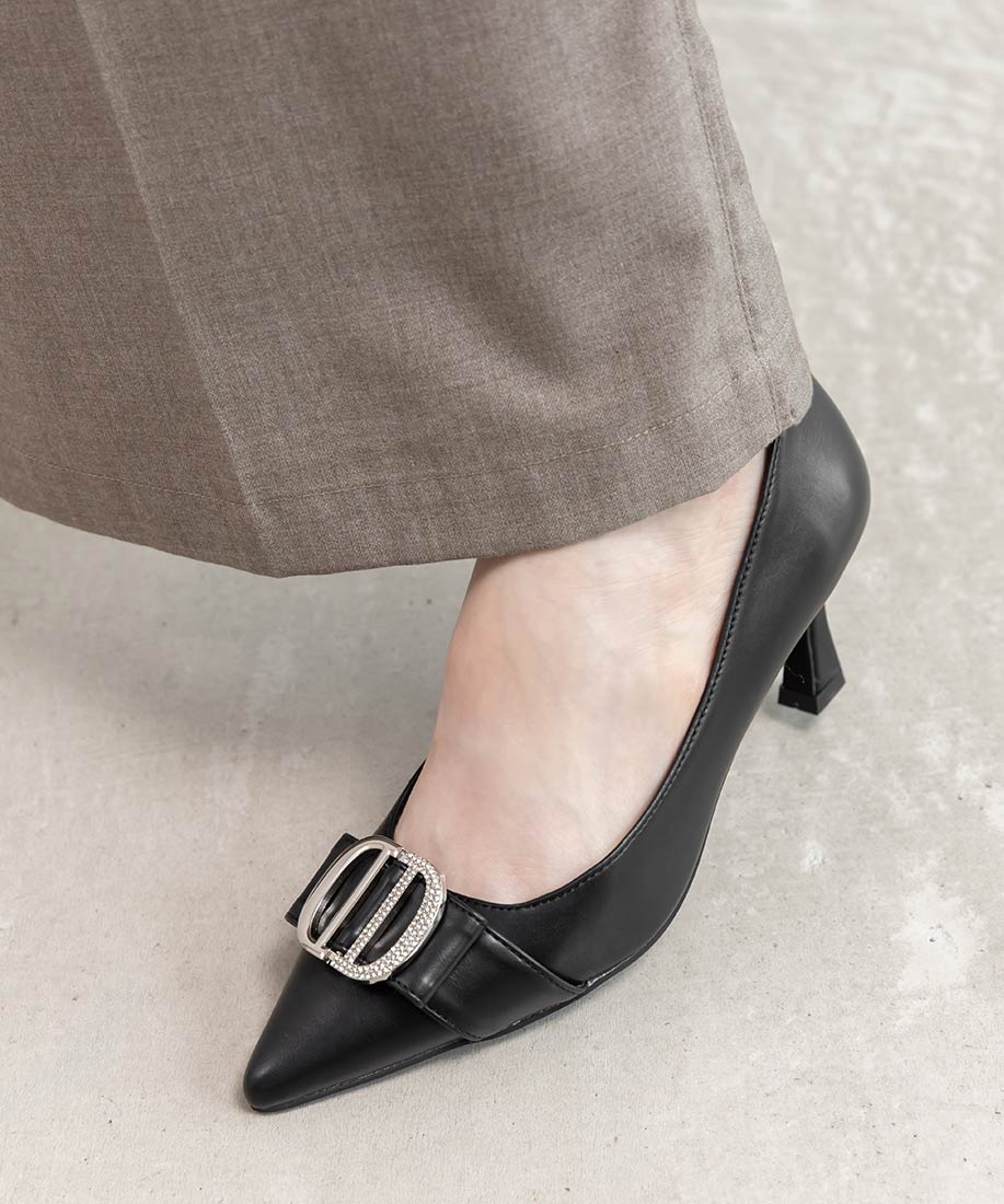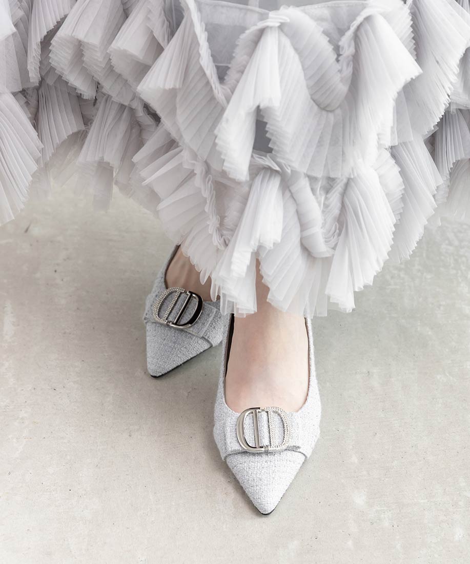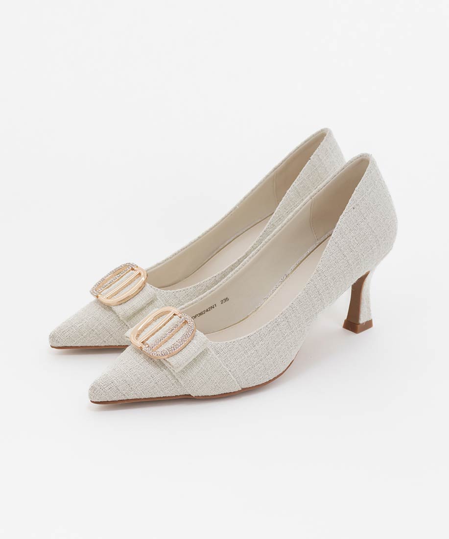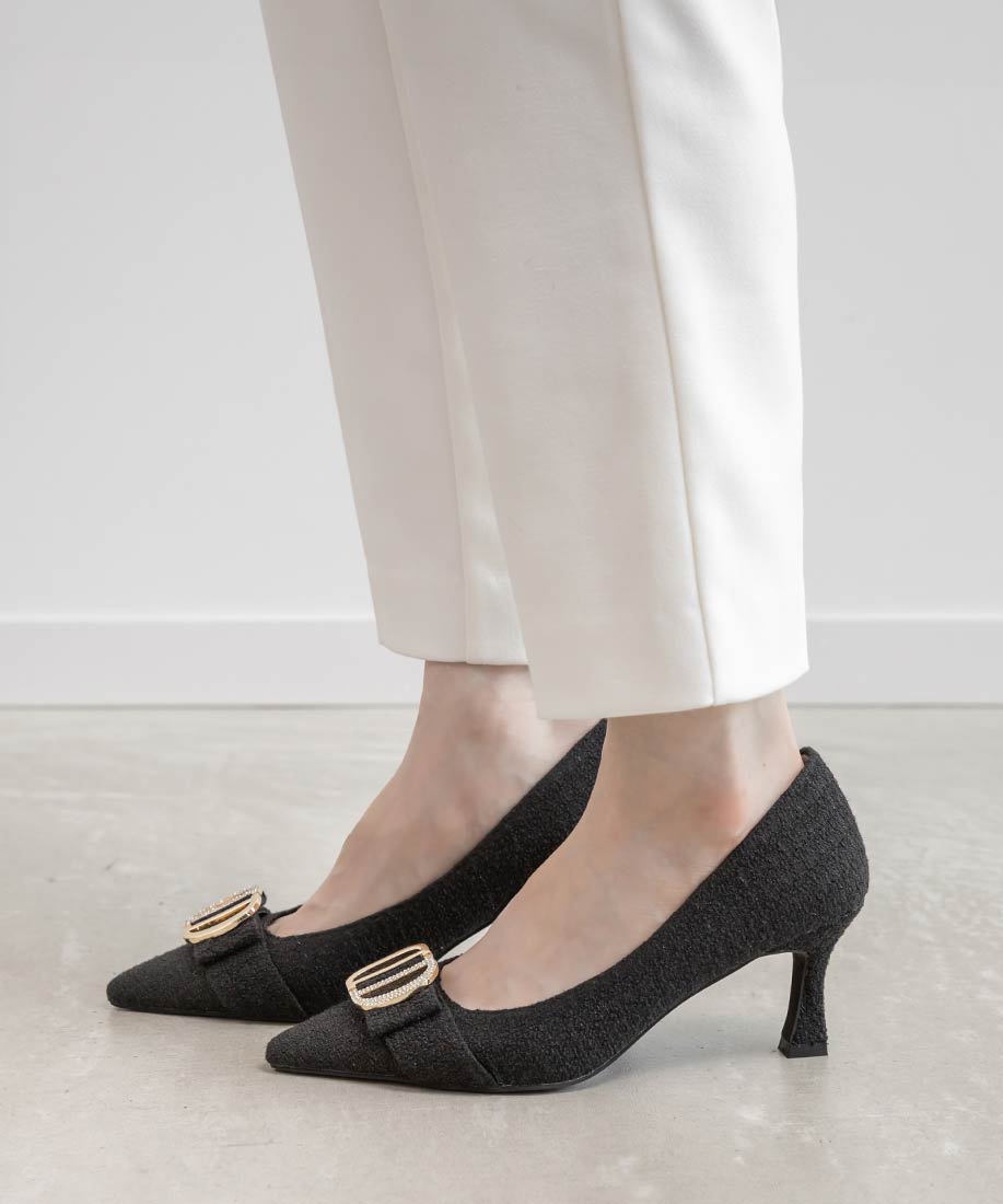 ビジューパーツ×畳みリボンが華やかなポインテッドトゥパンプス。