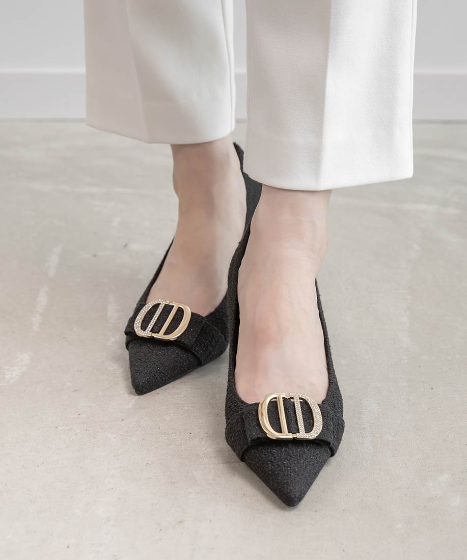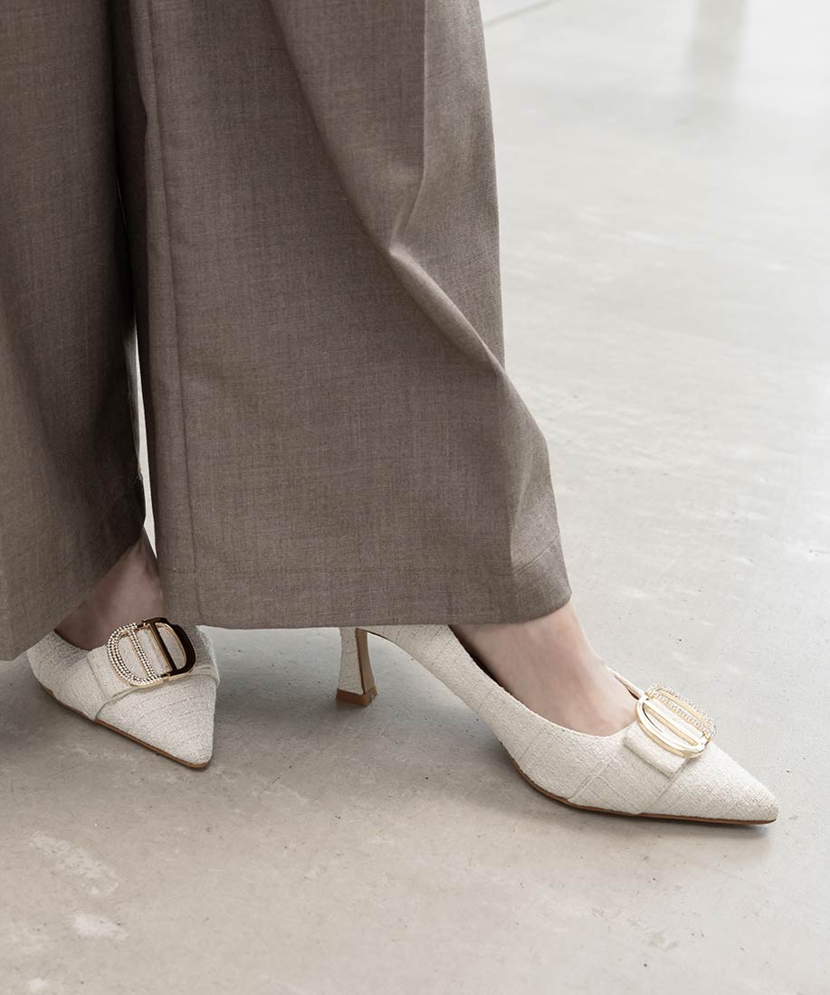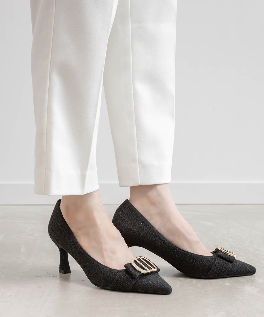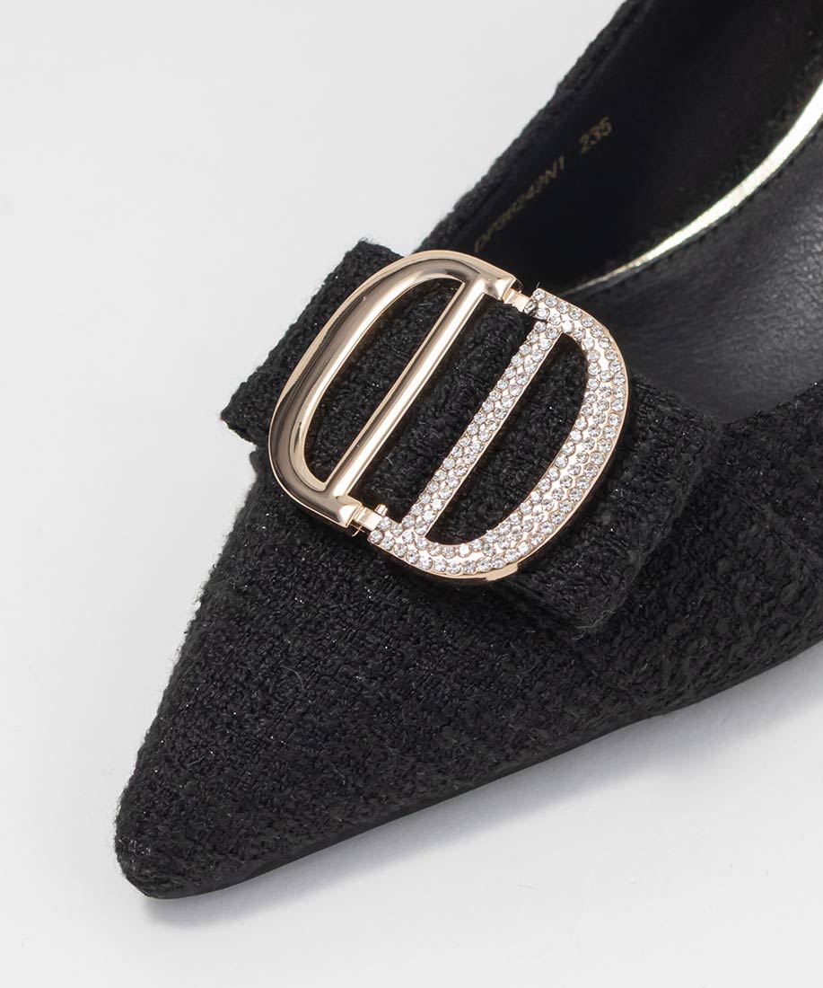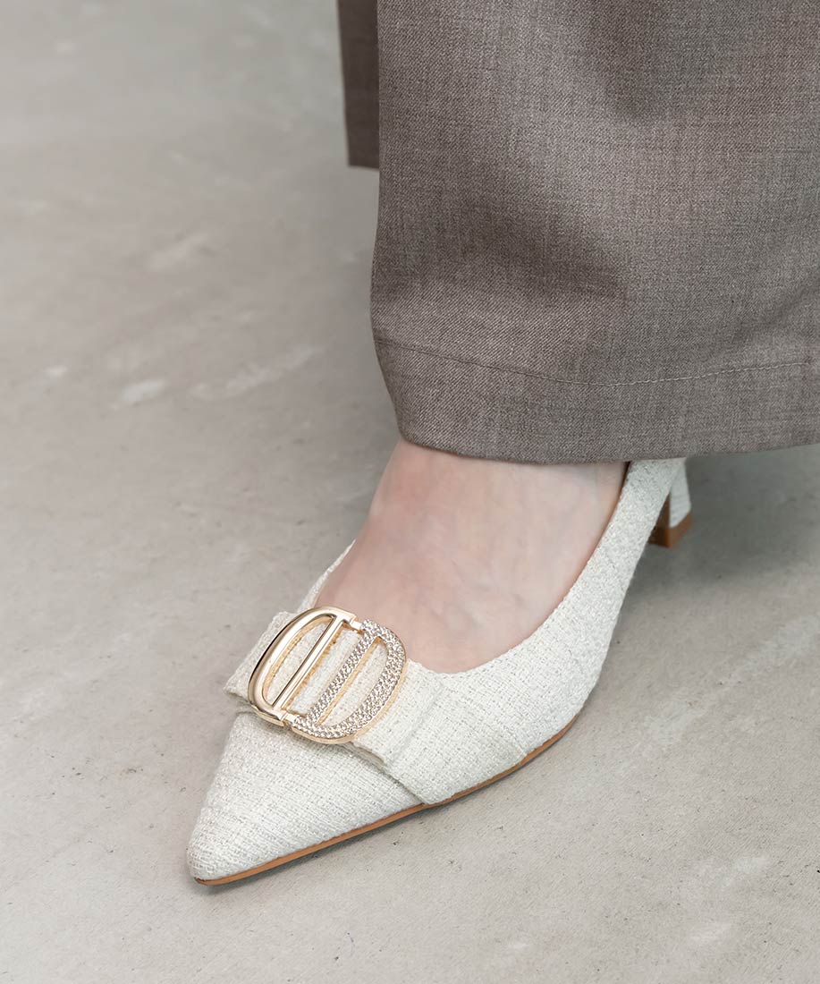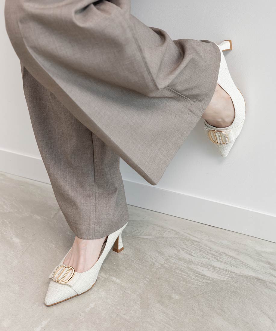 ビジューパーツ×畳みリボンが華やかなポインテッドトゥパンプス。