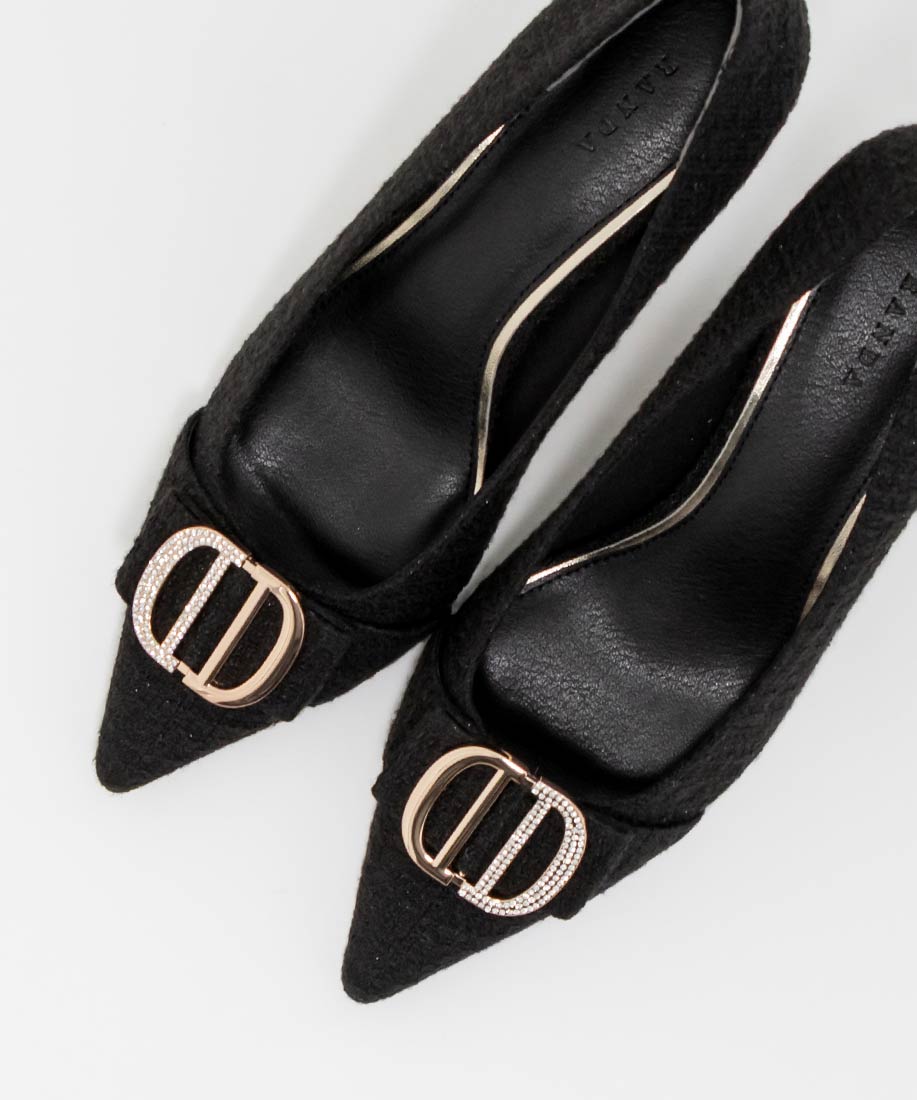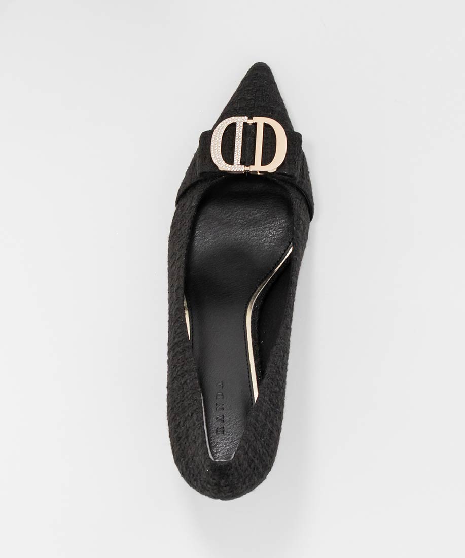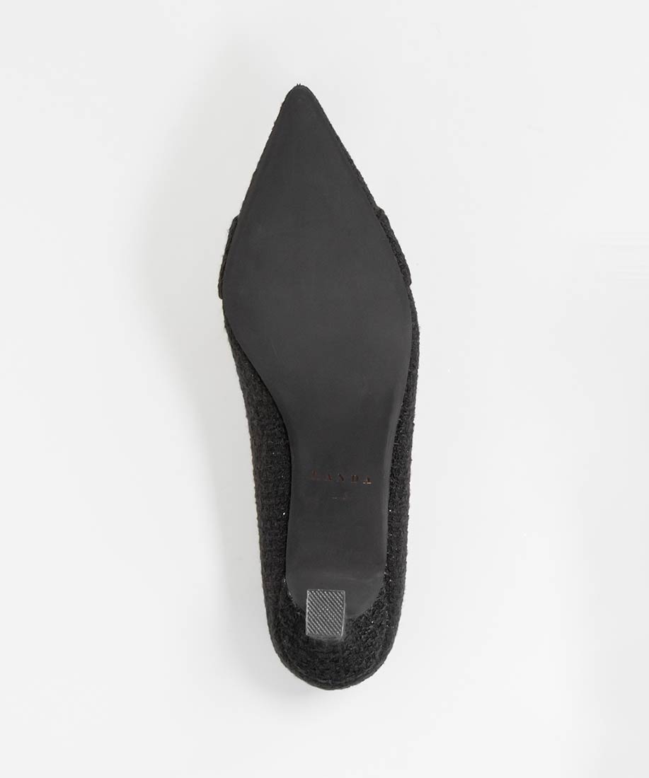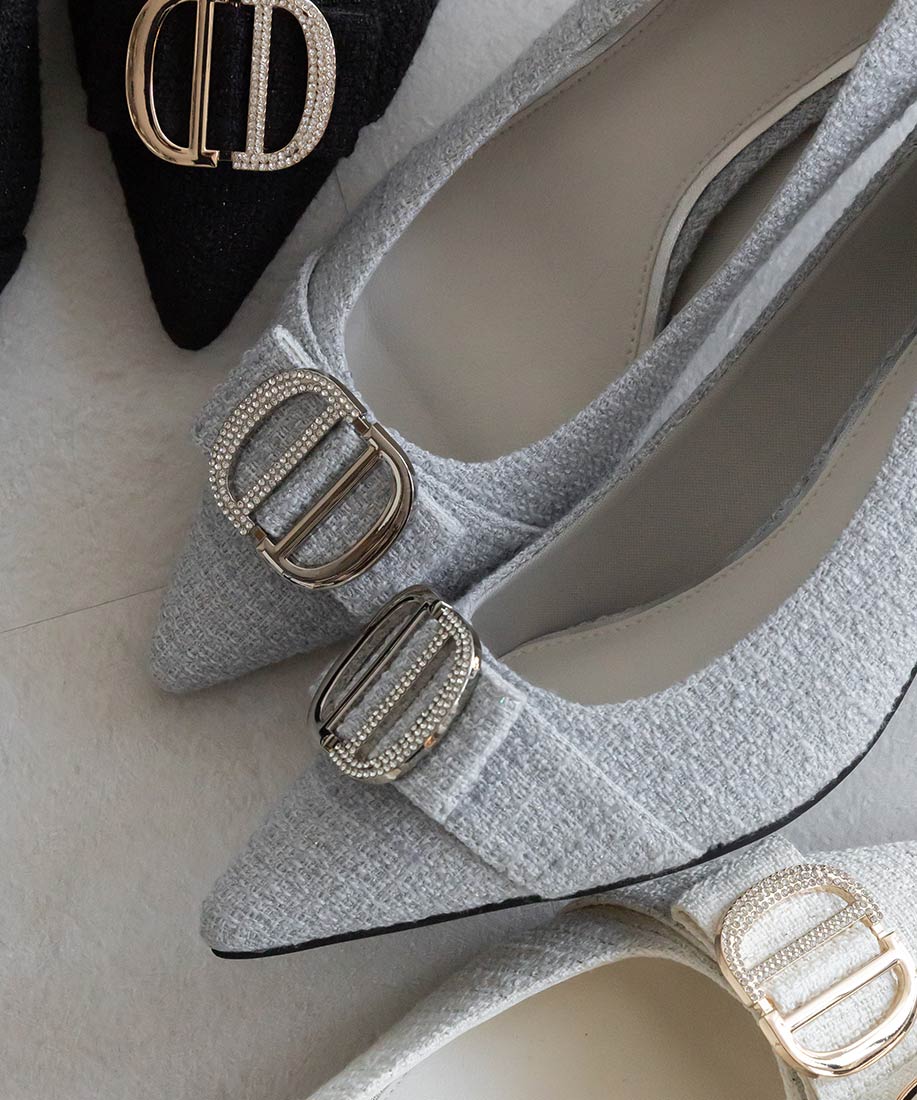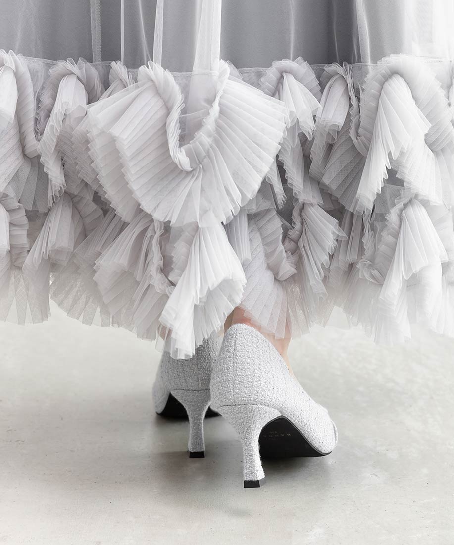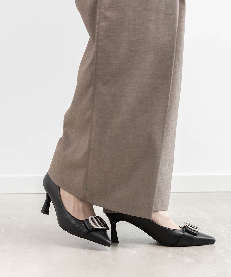 ビジューパーツ×畳みリボンが華やかなポインテッドトゥパンプス。