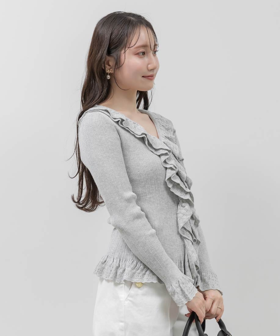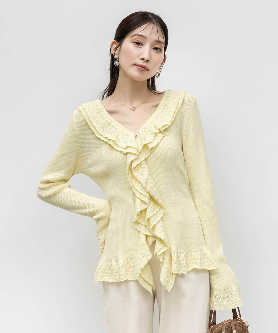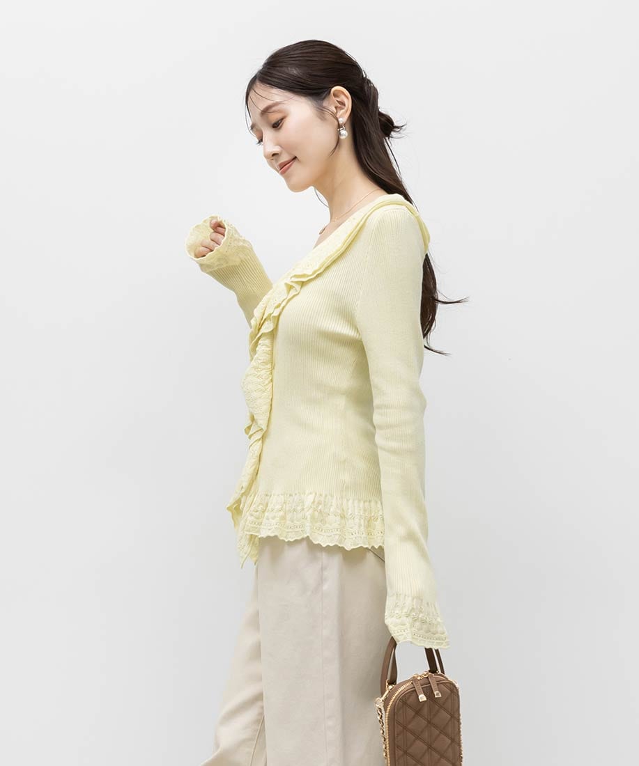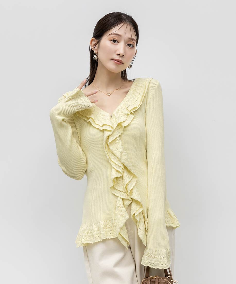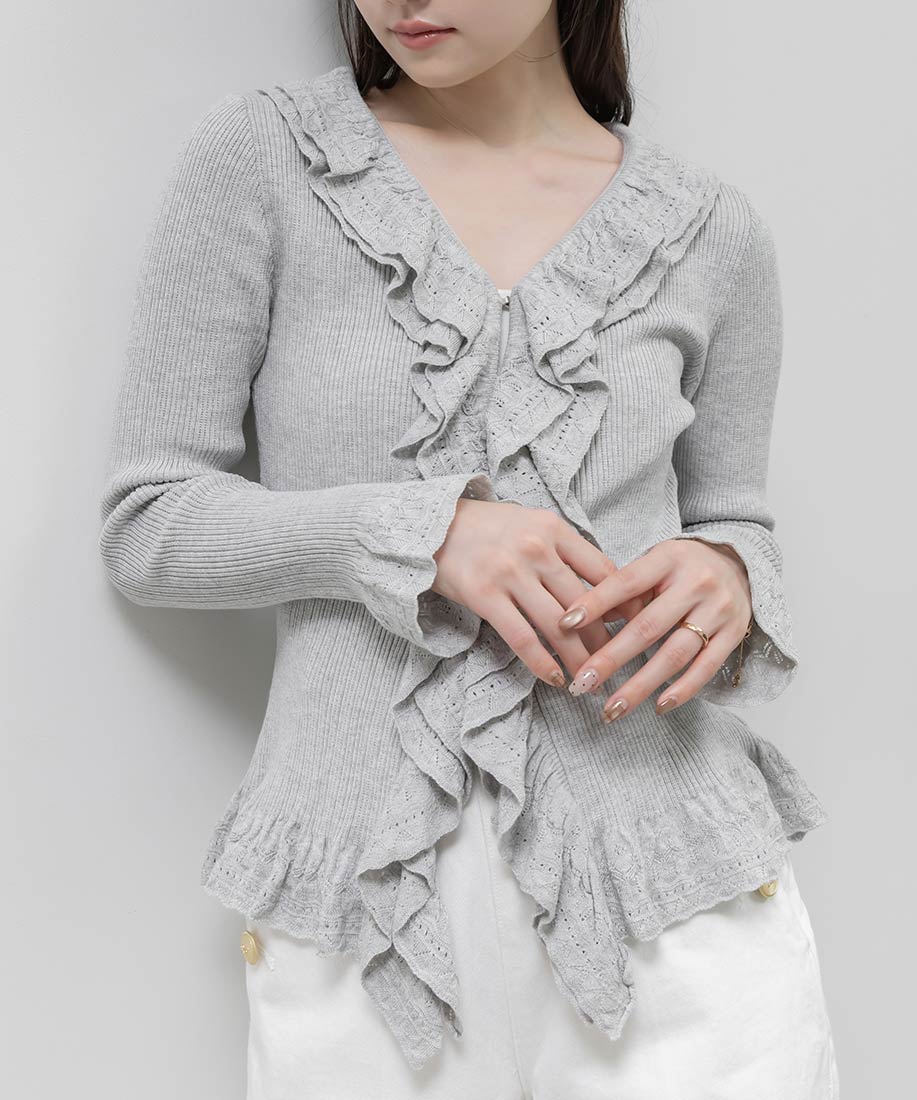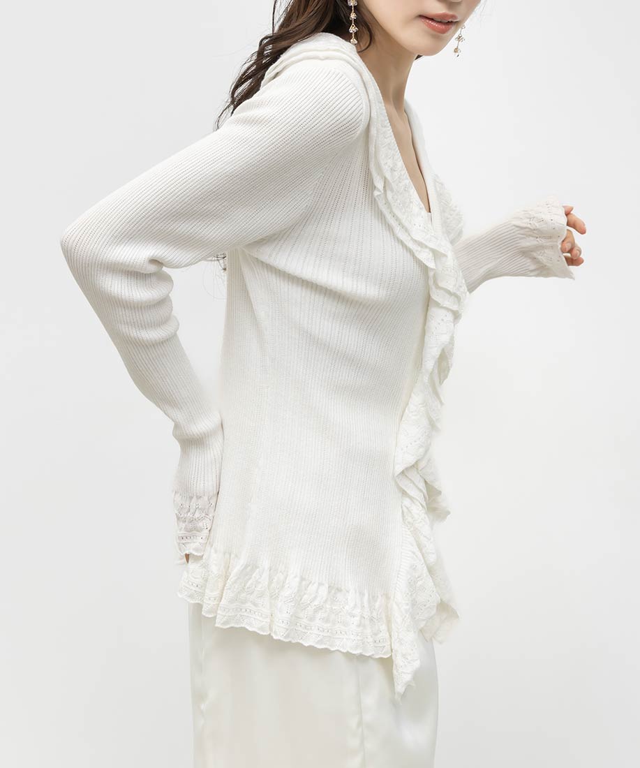 レース調の柄編みがフェミニンなムードたっぷりなラッフルデザインのカーディガン。