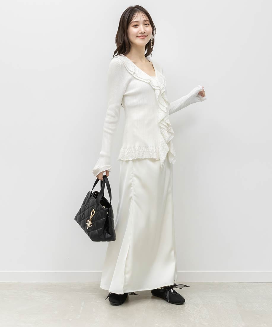 ラッフルフリルが際立つようにストレートなラインのスカートを合わせるとバランスの取れたスタリングが完成します。