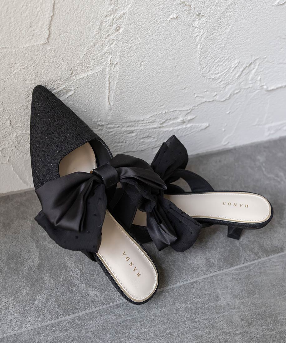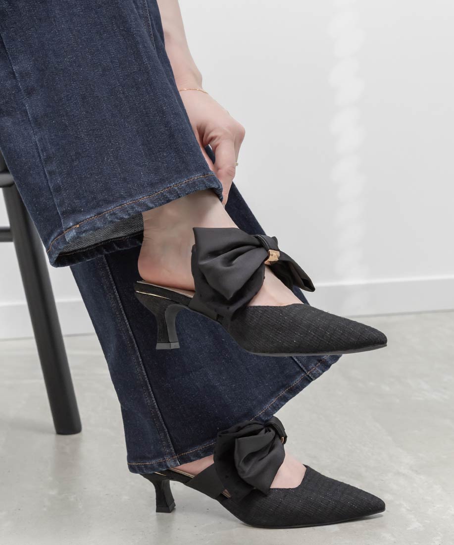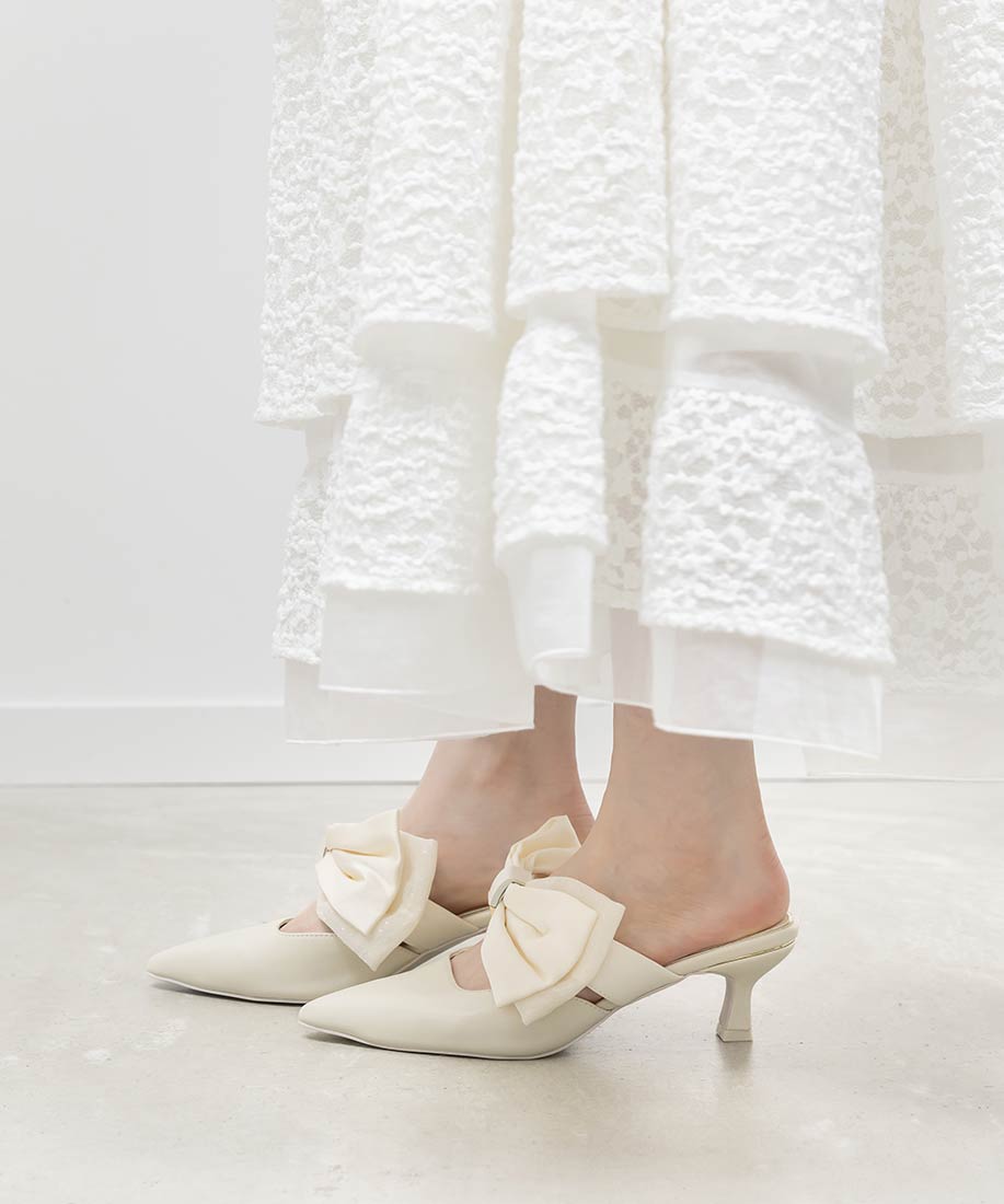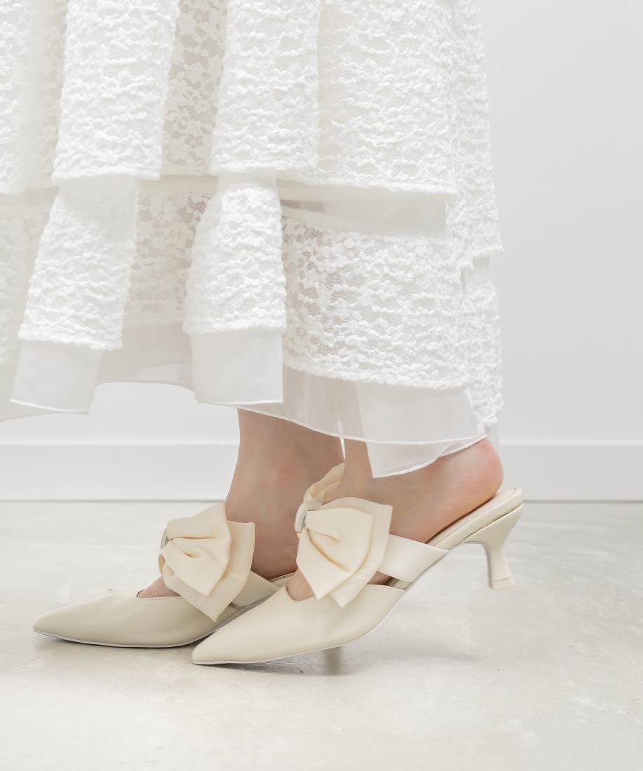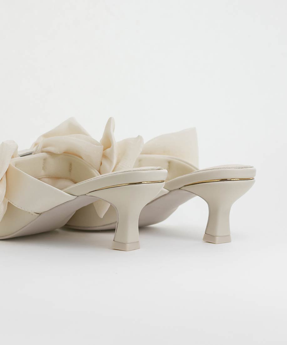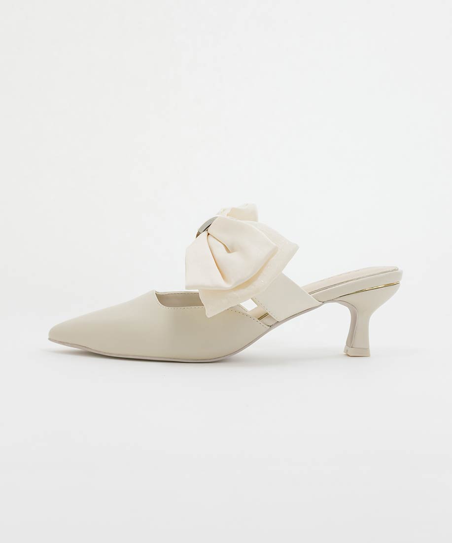 ふんわりと女性らしいビッグリボンがポイントのミュールパンプス。