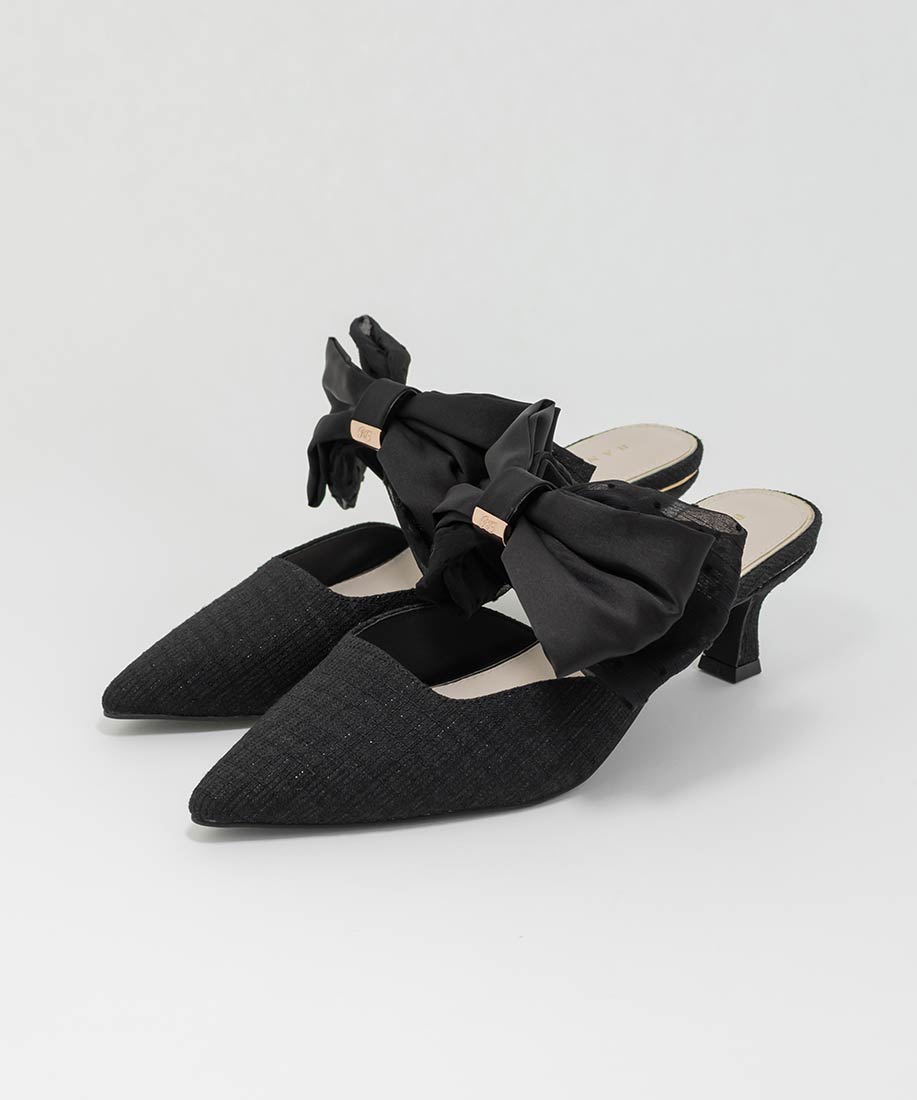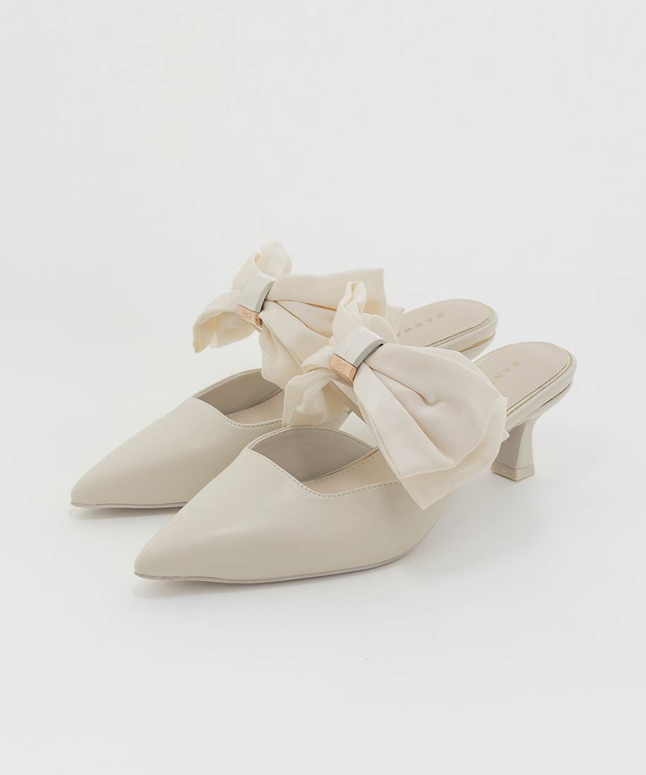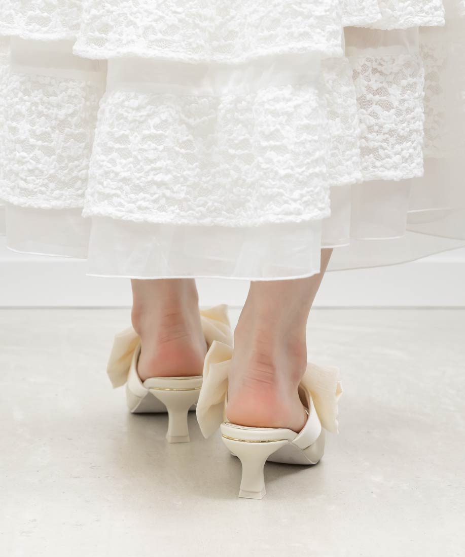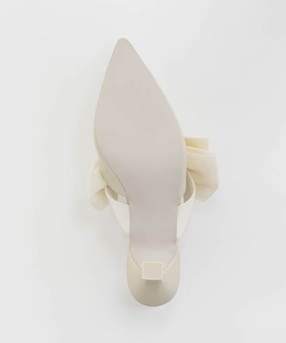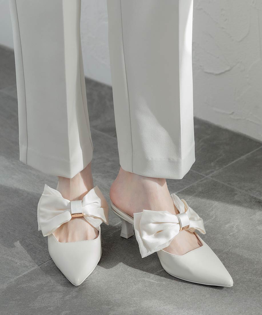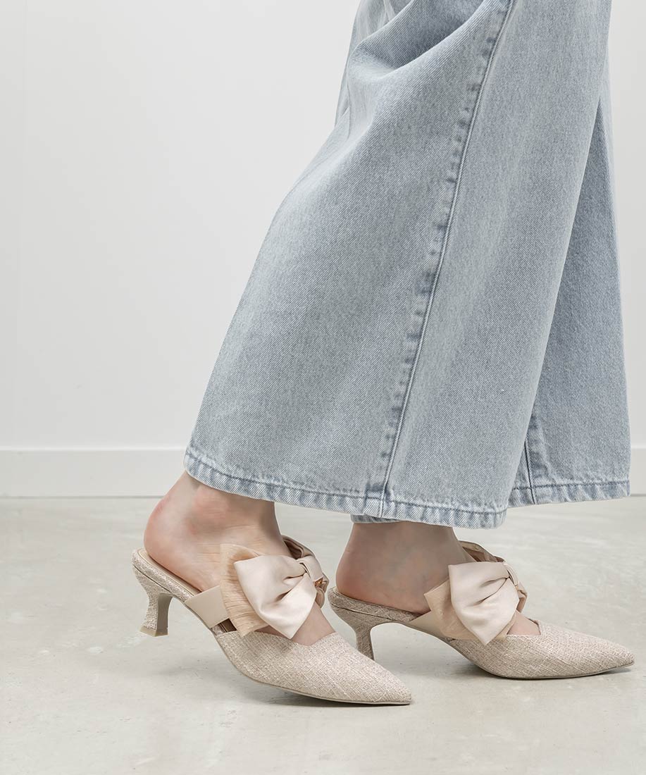 ふんわりと女性らしいビッグリボンがポイントのミュールパンプス。