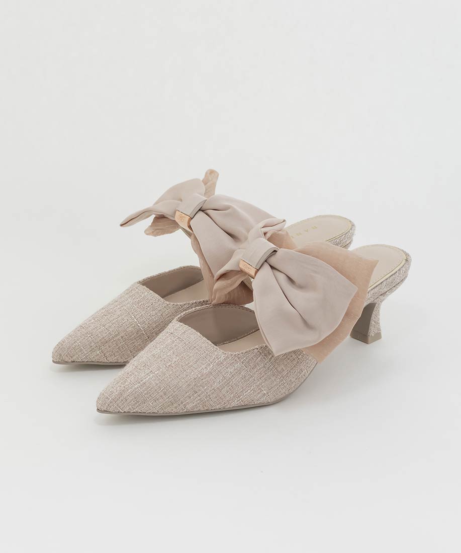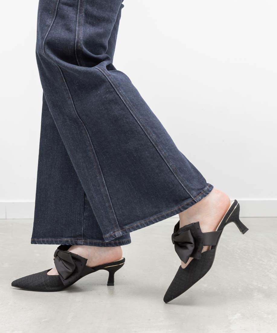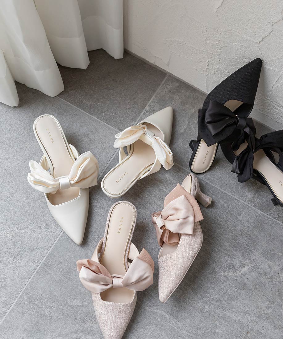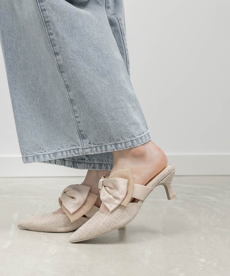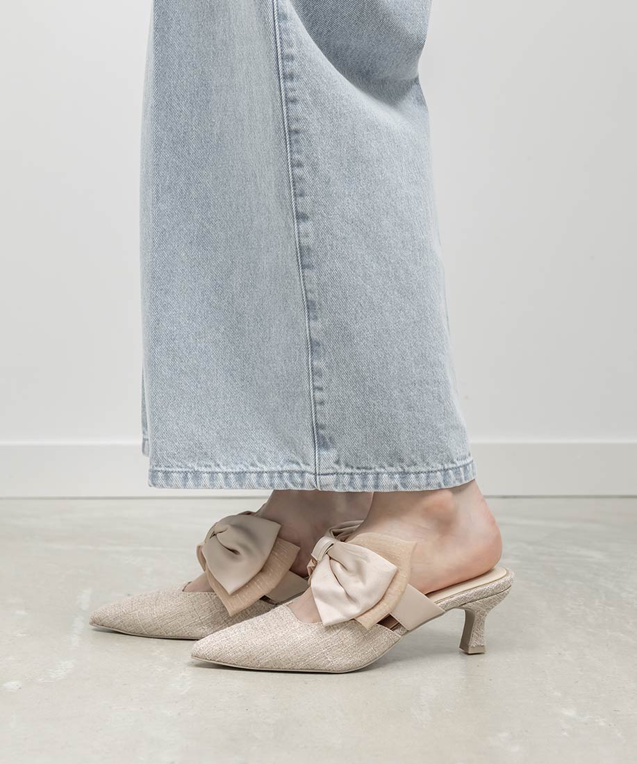 ふんわりと女性らしいビッグリボンがポイントのミュールパンプス。