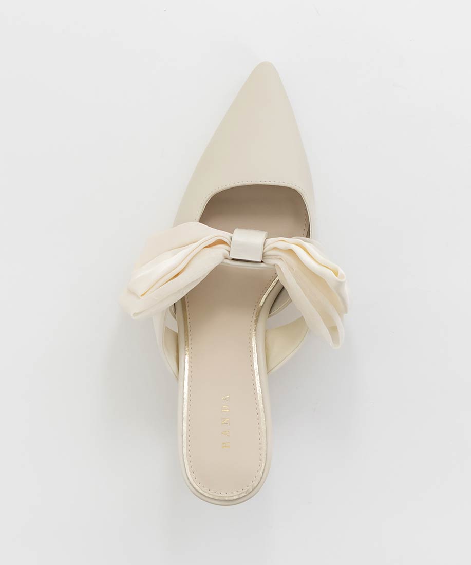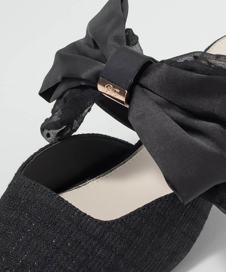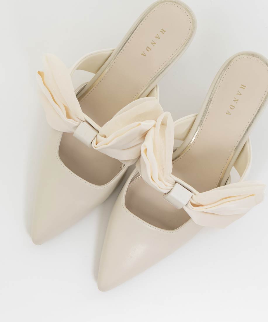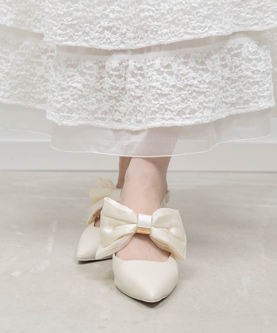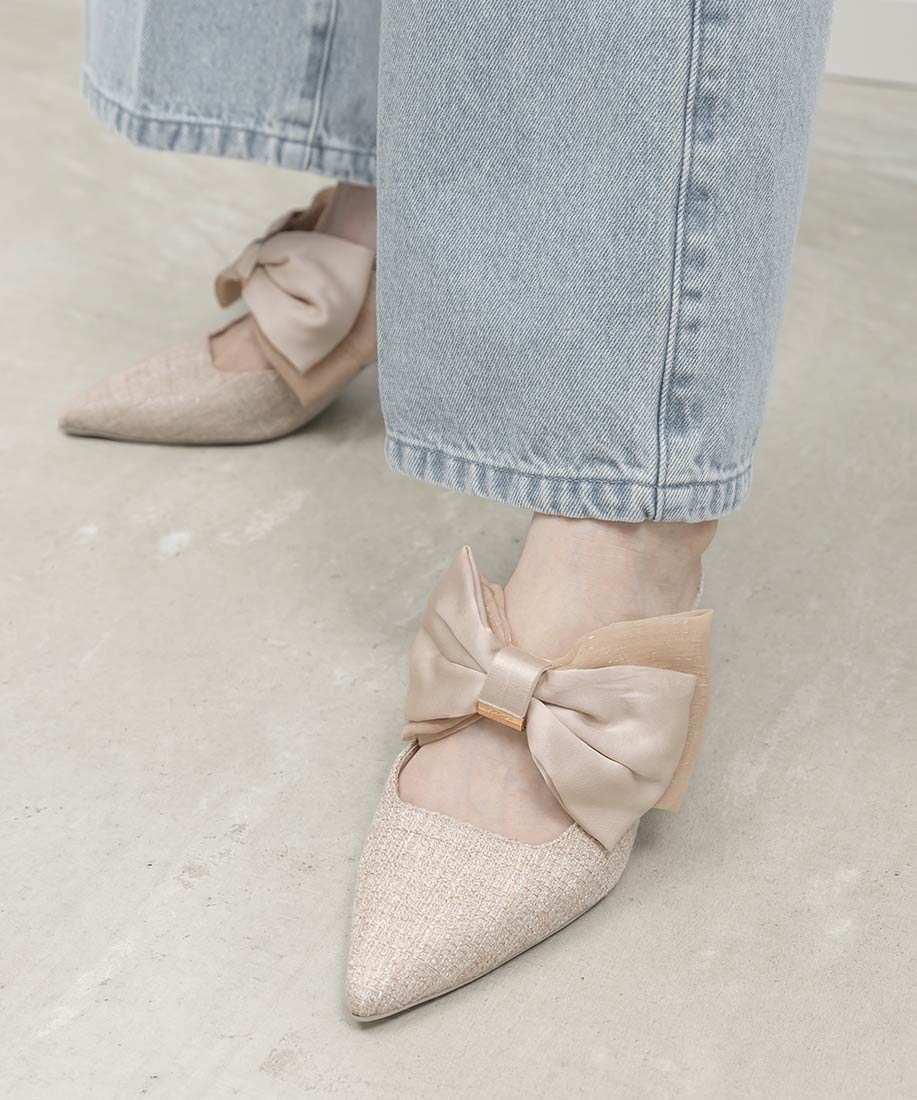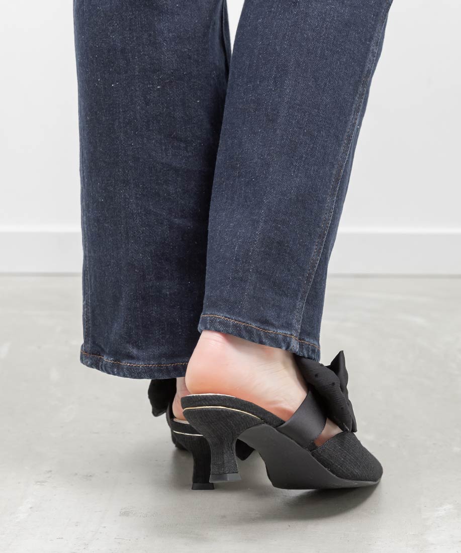 ふんわりと女性らしいビッグリボンがポイントのミュールパンプス。