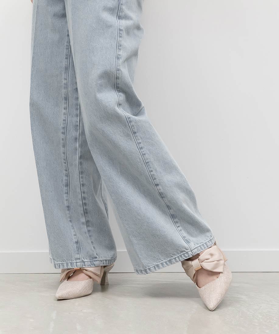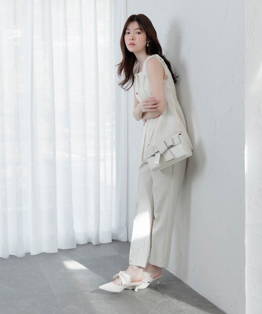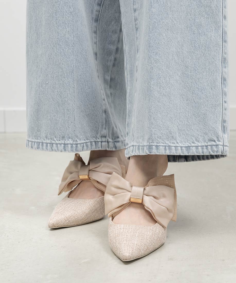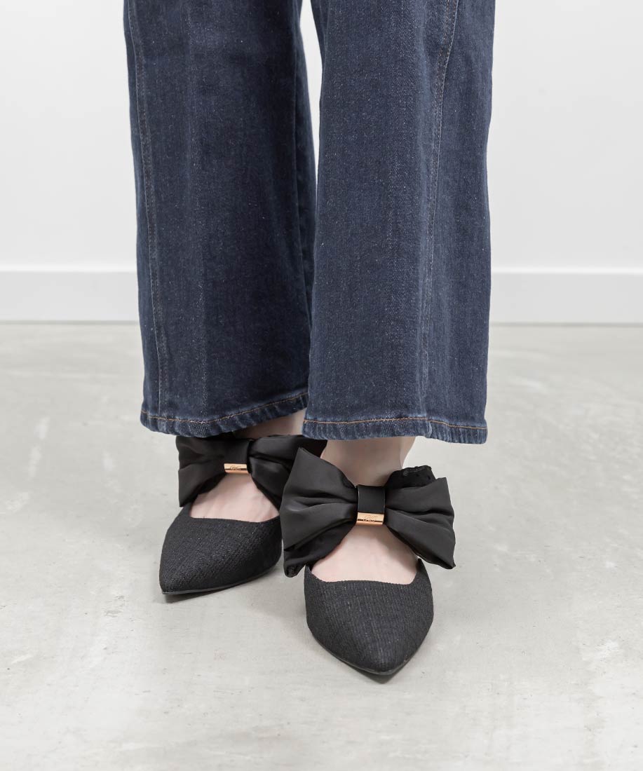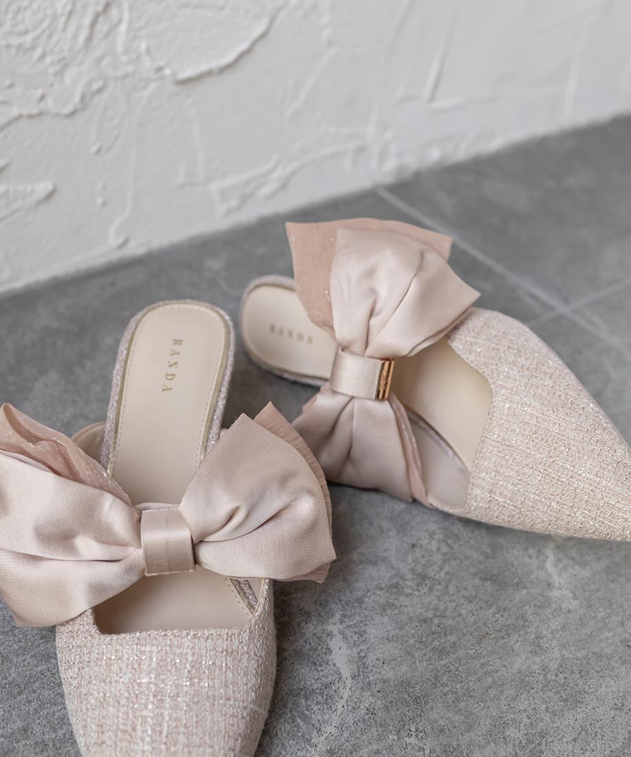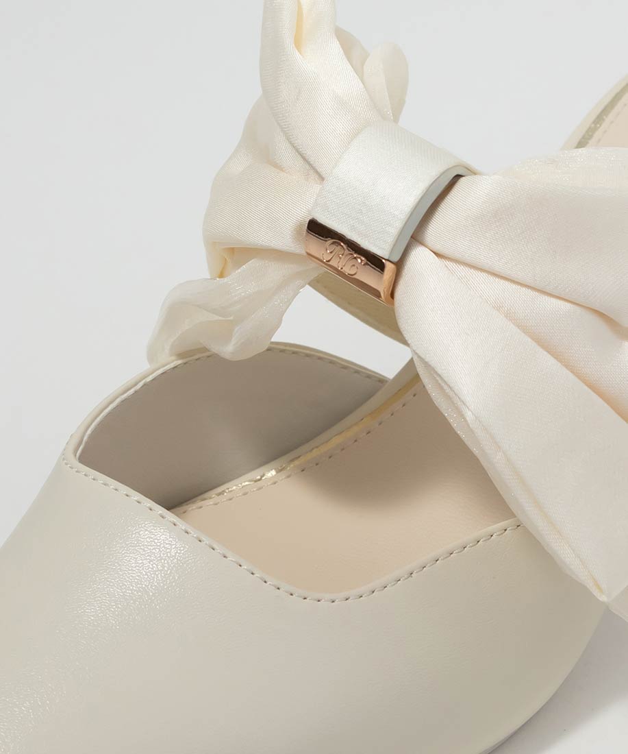 ふんわりと女性らしいビッグリボンがポイントのミュールパンプス。