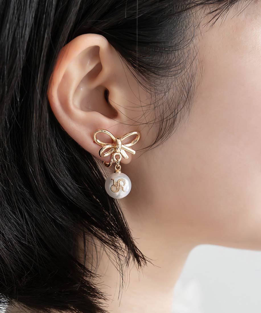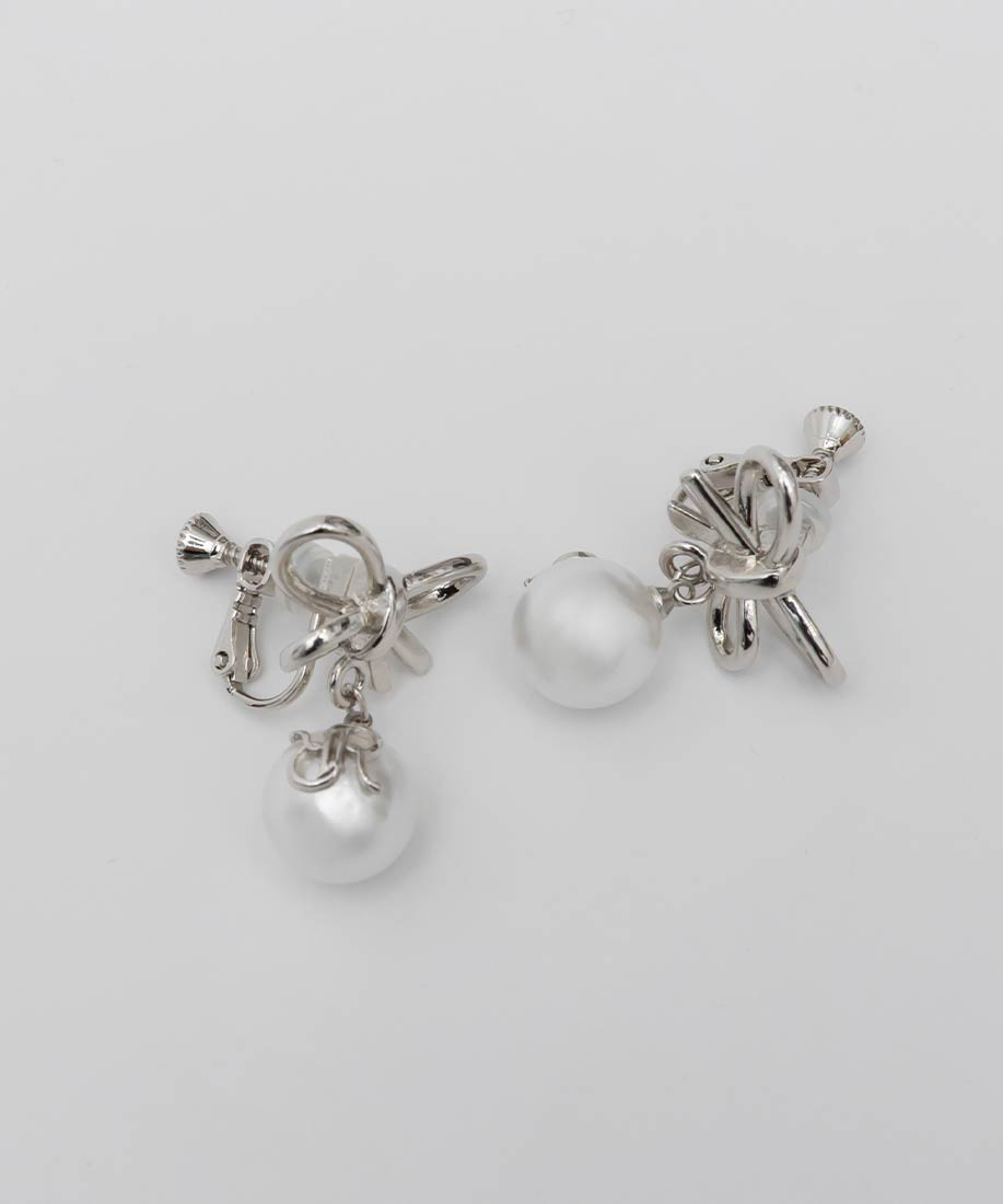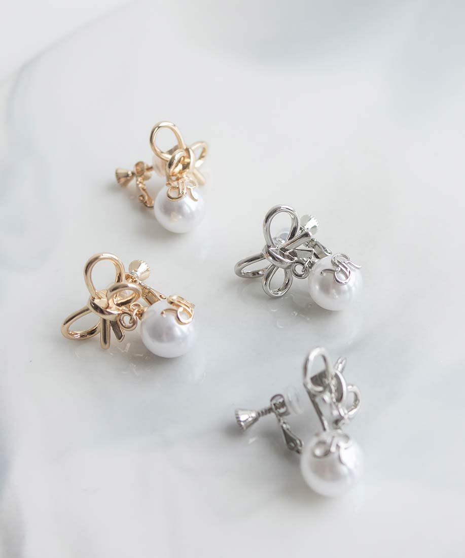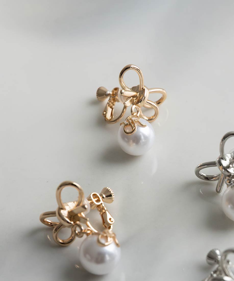 華奢なリボンデザインとパールがポイントのイヤリング。