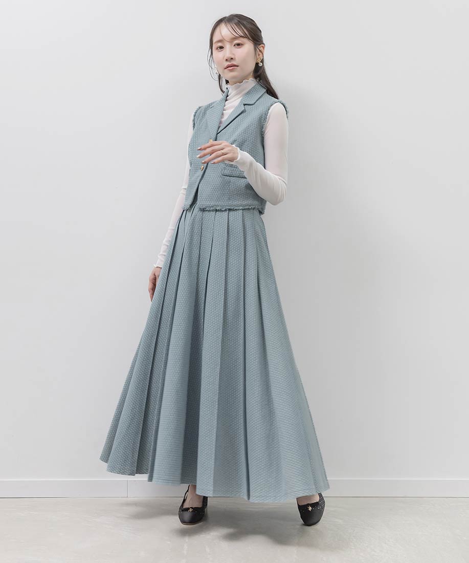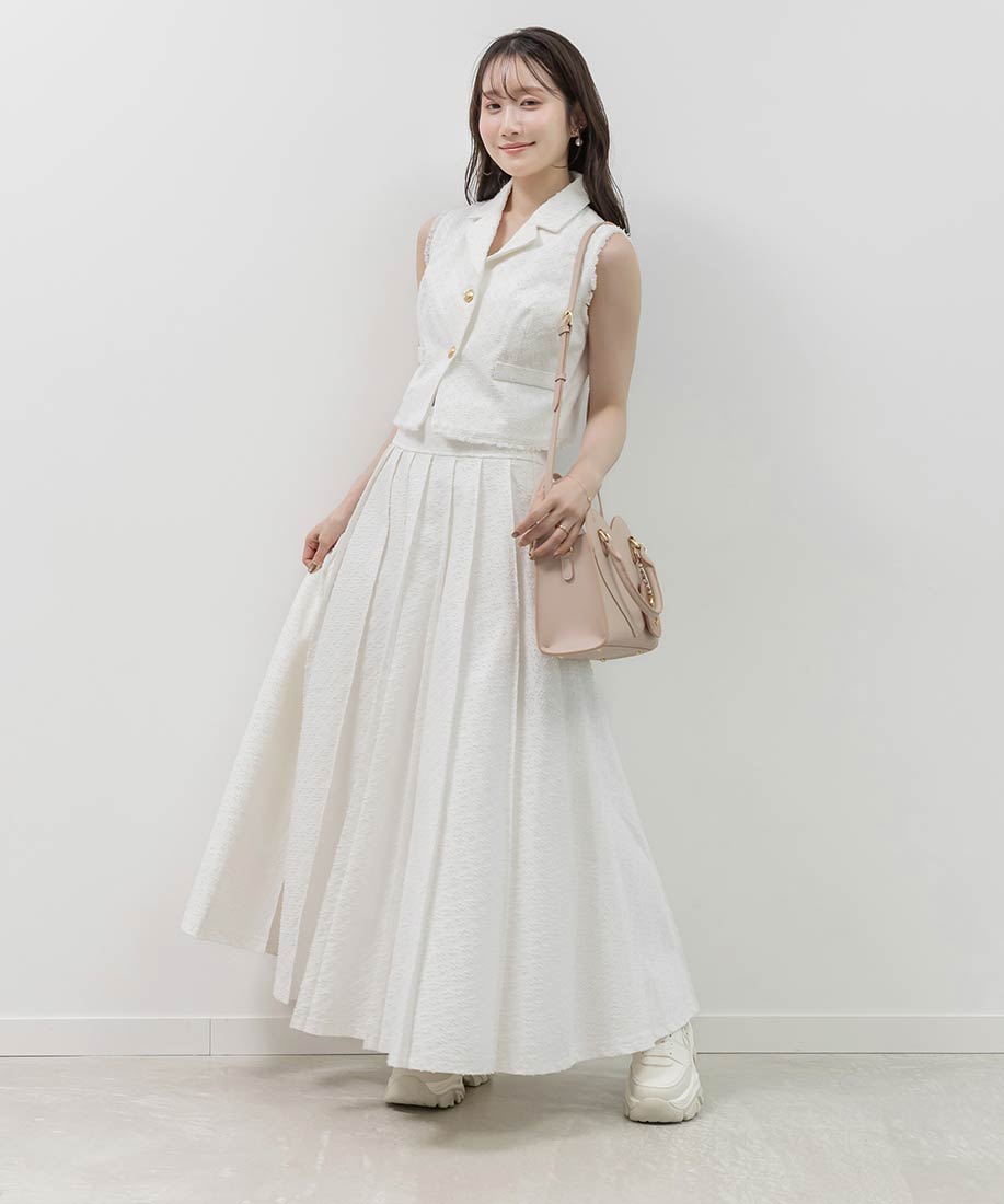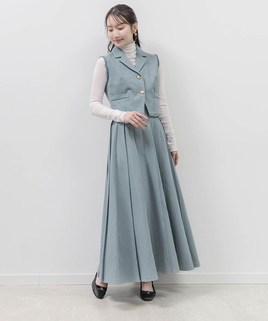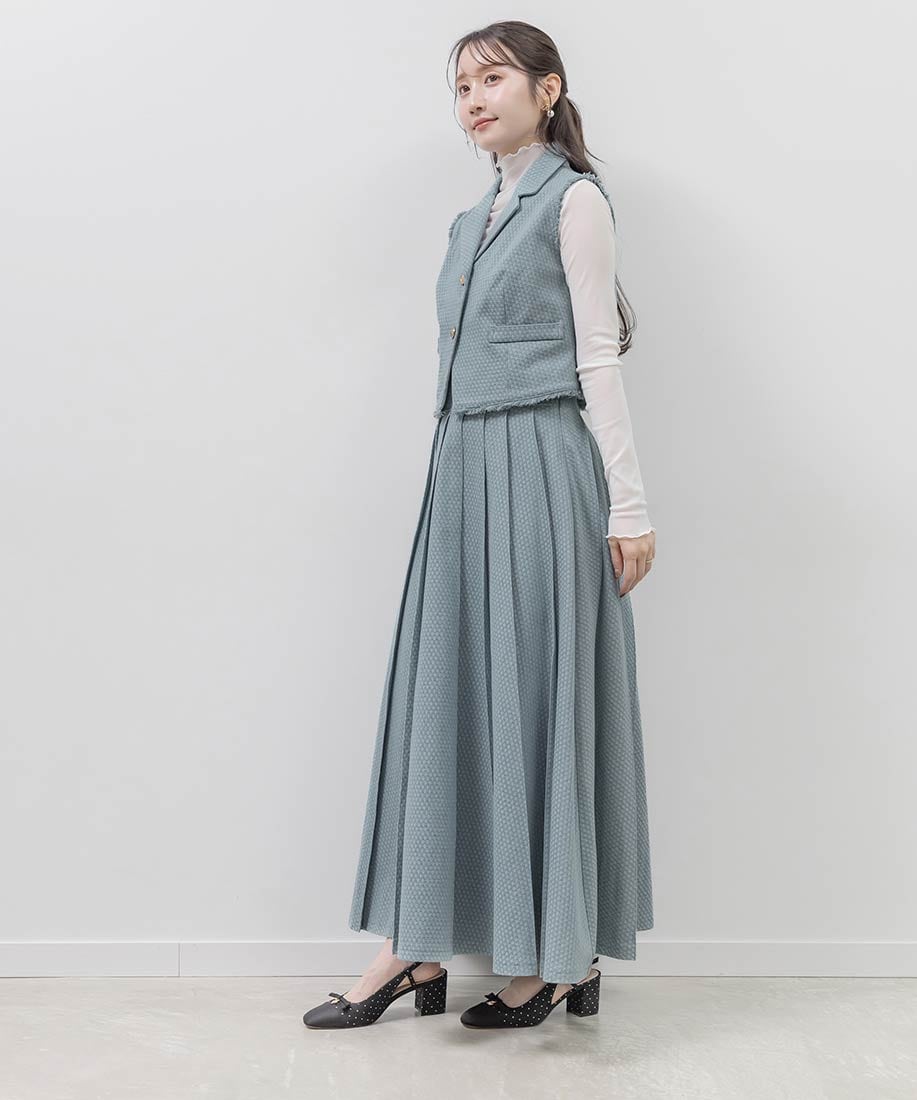 ジレとスカートを合わせて、ワントーンでまとめたセットアップスタイルがおすすめ。