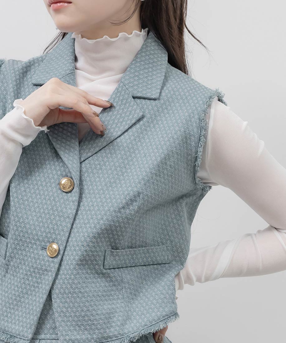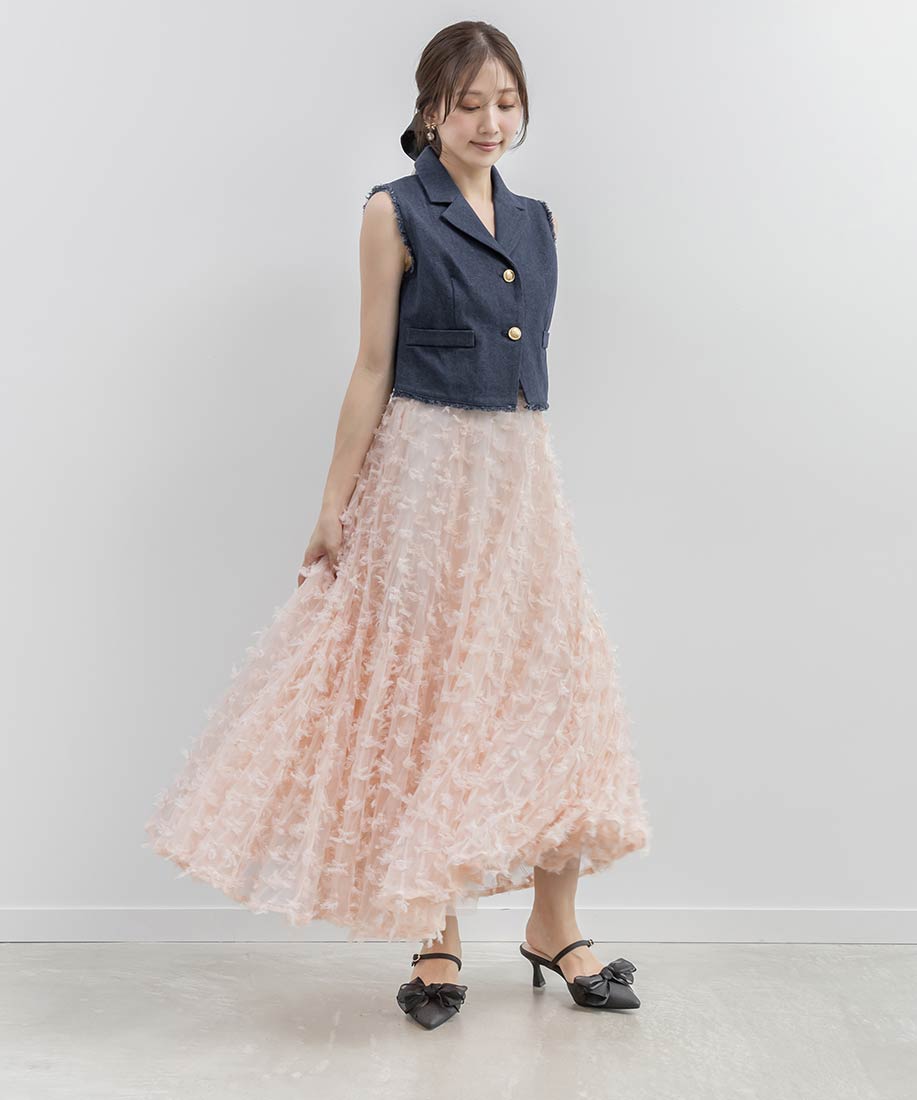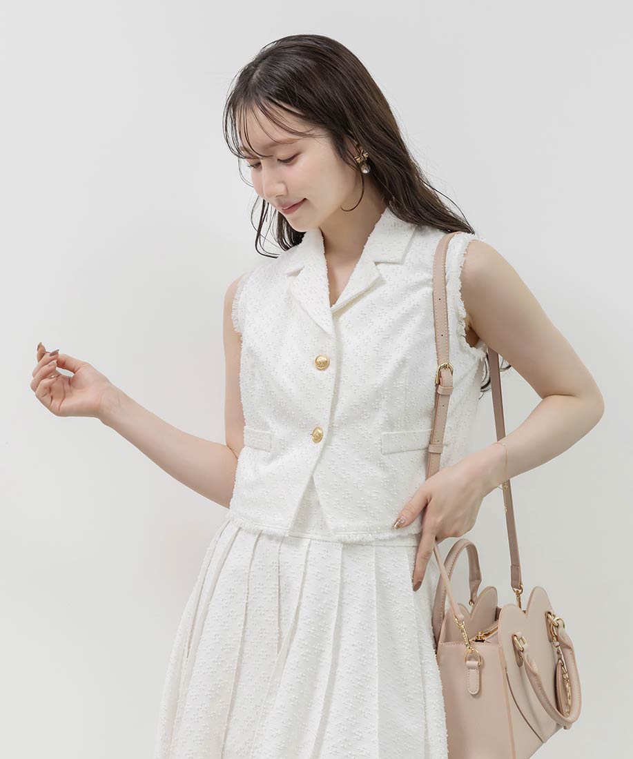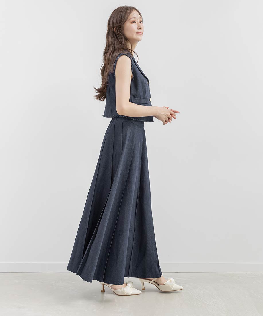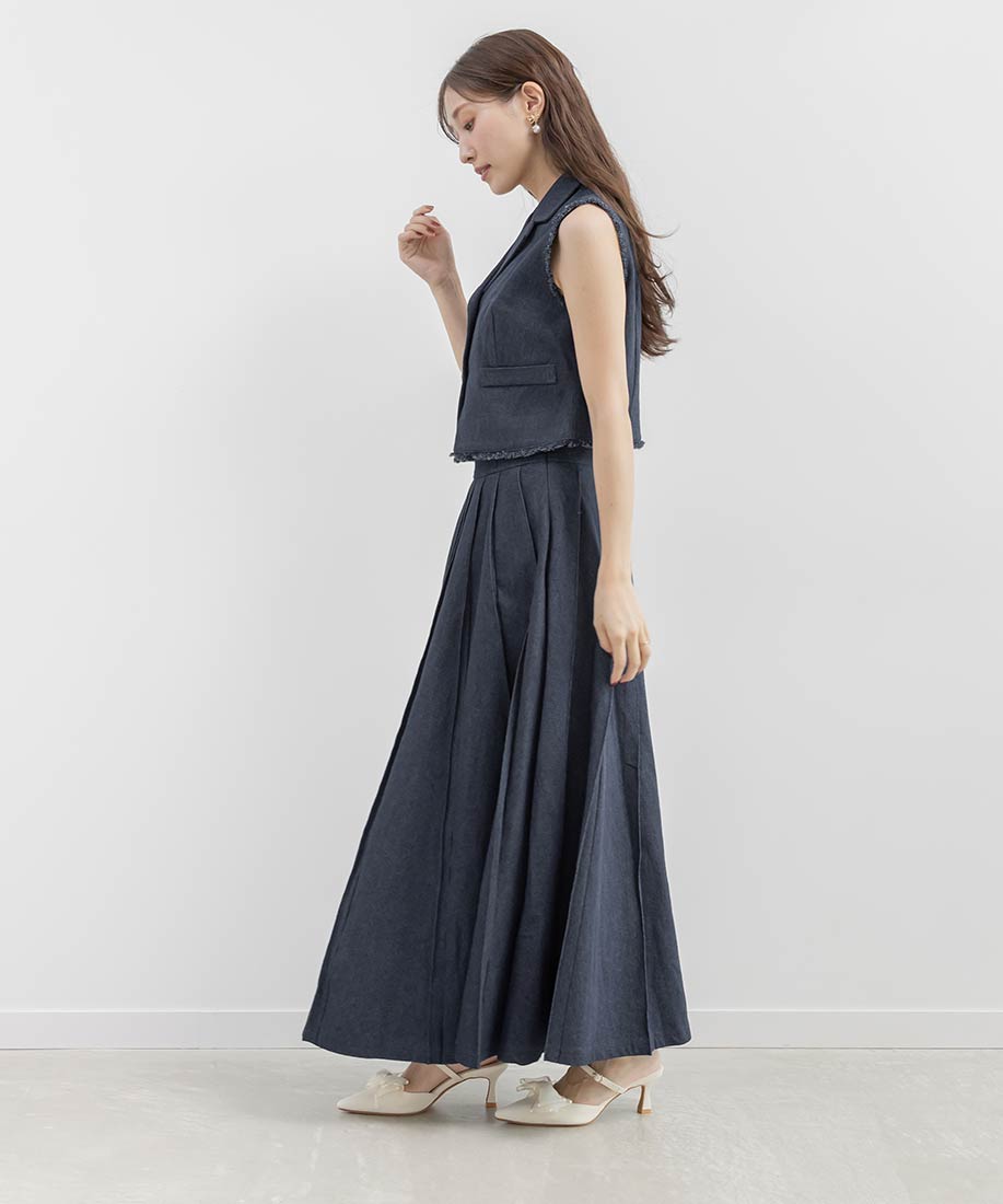 ジレとスカートを合わせて、ワントーンでまとめたセットアップスタイルがおすすめ。