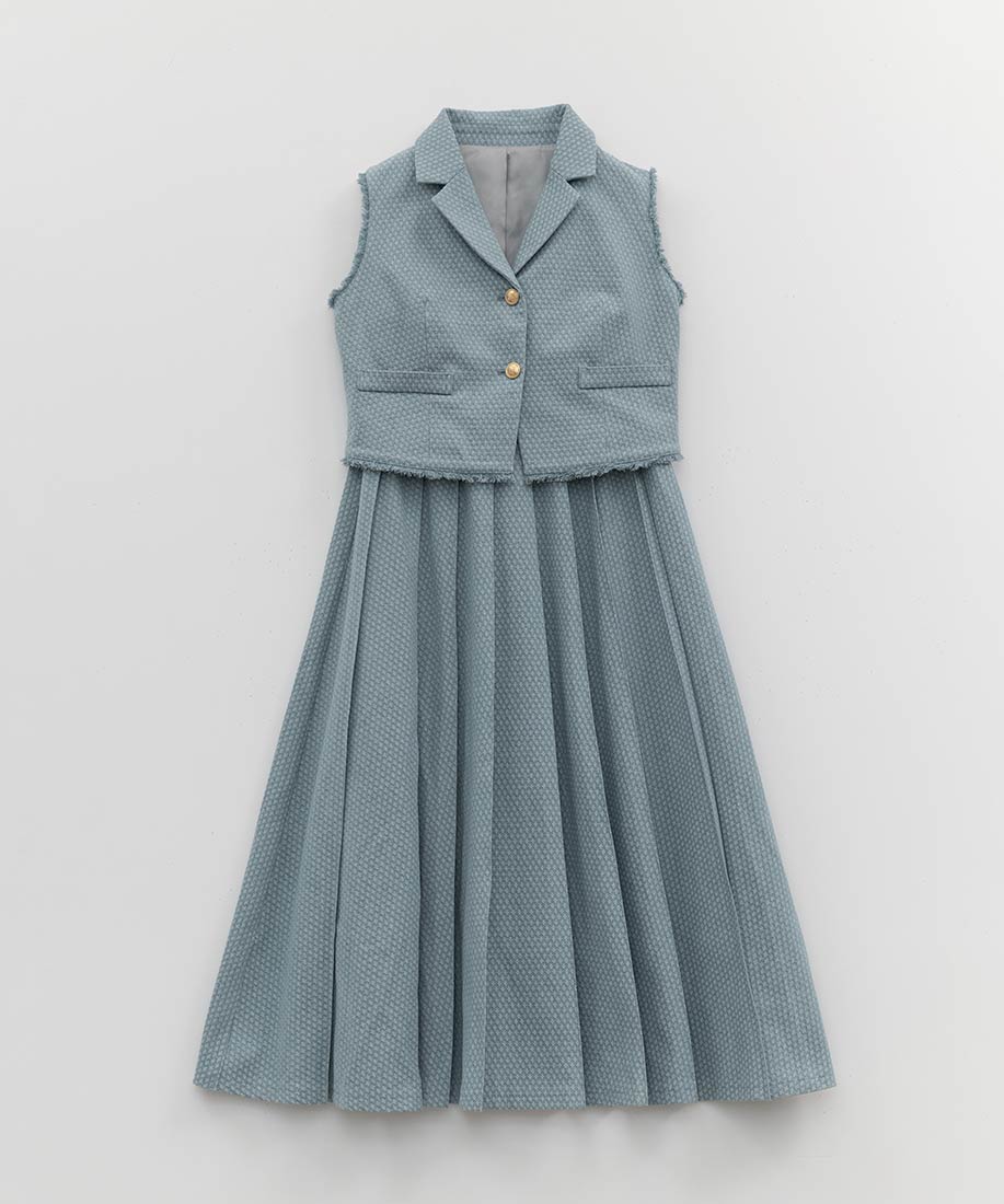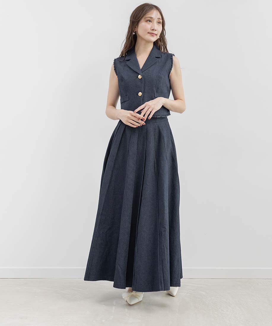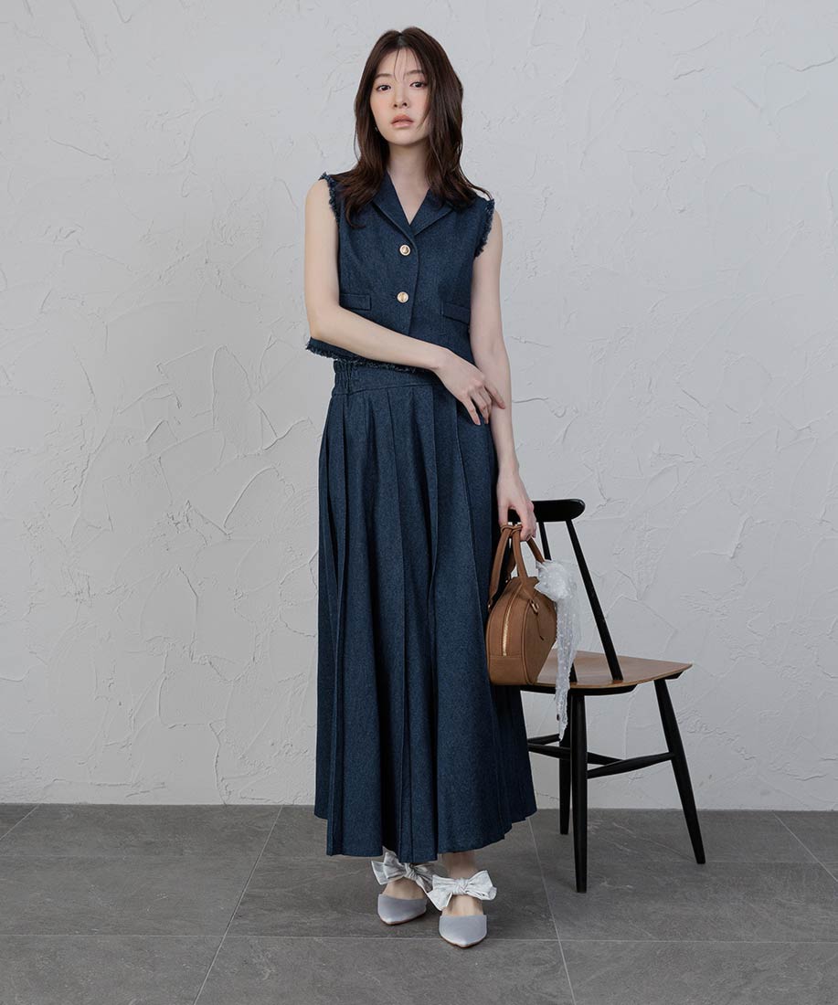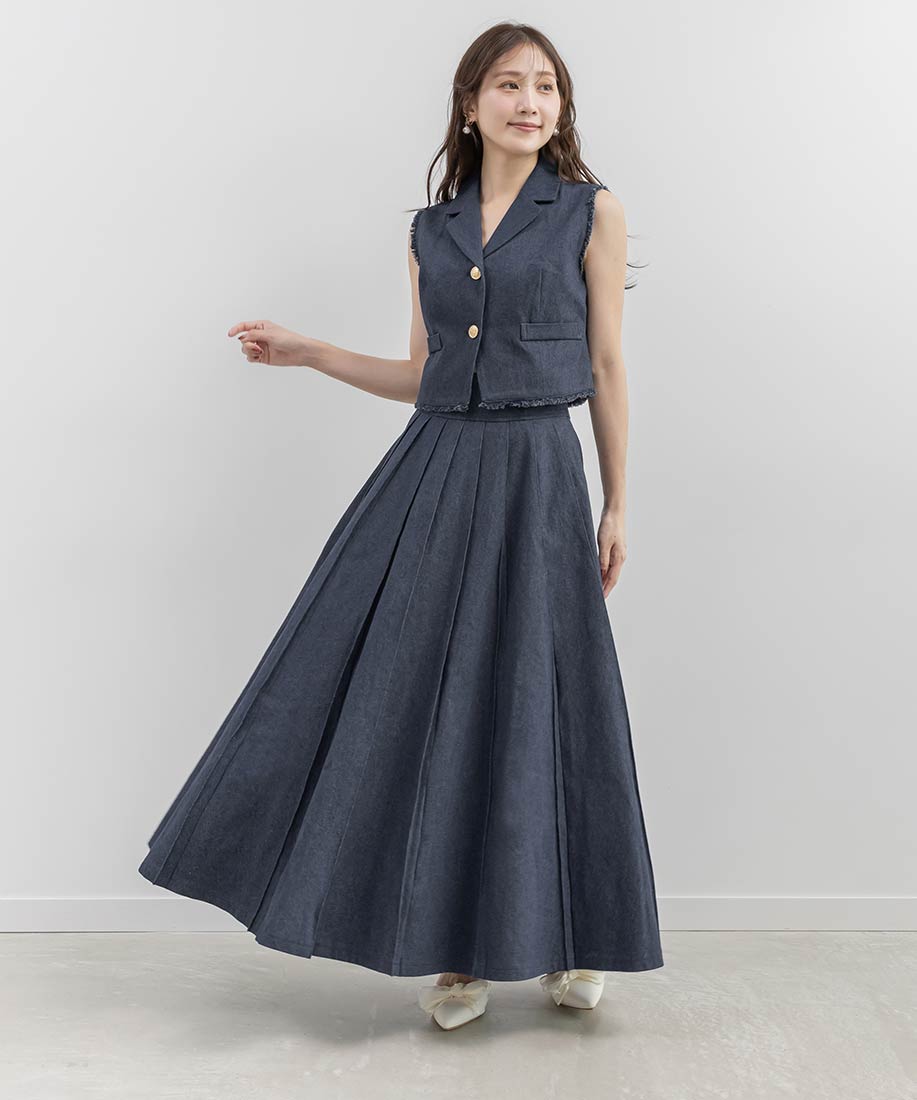 テーラードジレとプリーツスカートを組み合わせた、上品さとトレンド感を兼ね備えた2ピースセット。