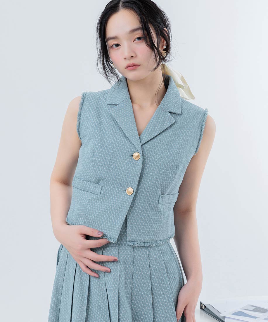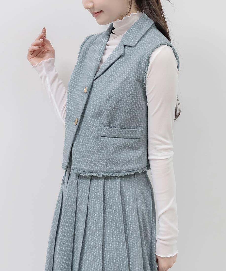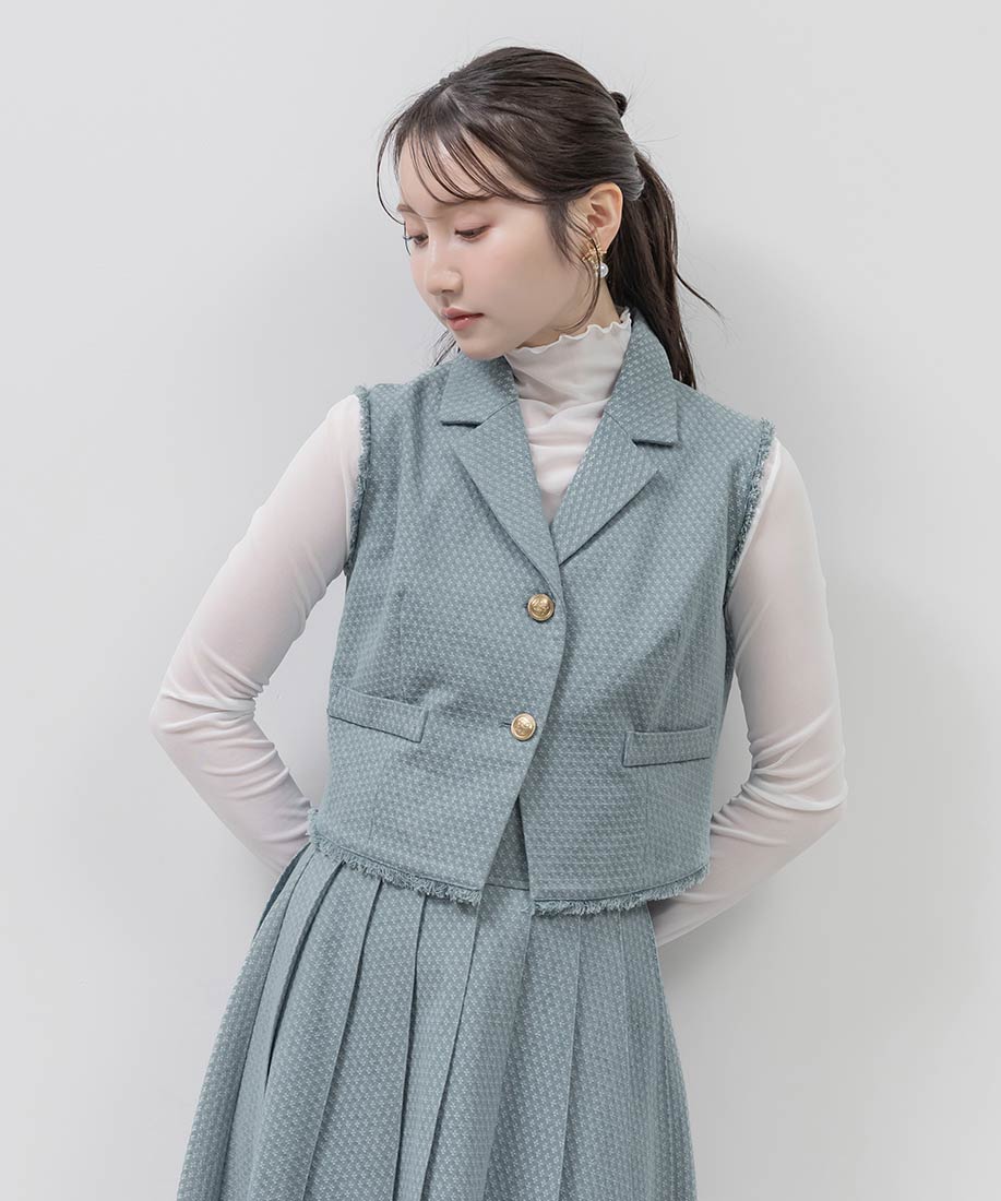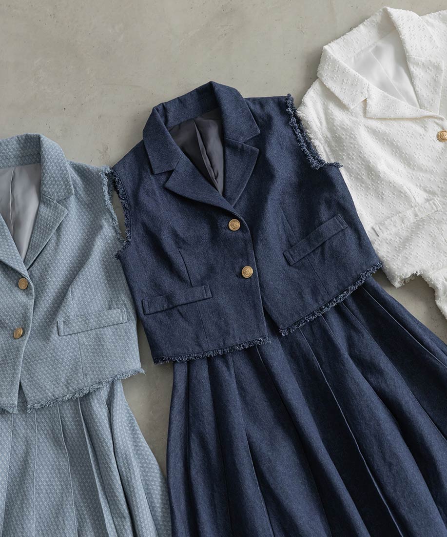 テーラードジレとプリーツスカートを組み合わせた、上品さとトレンド感を兼ね備えた2ピースセット。