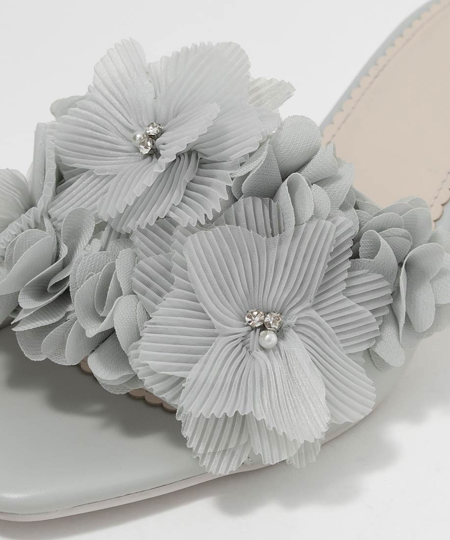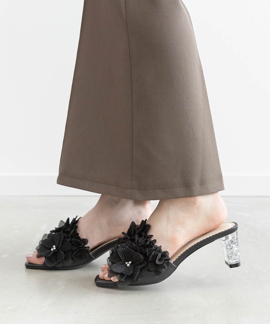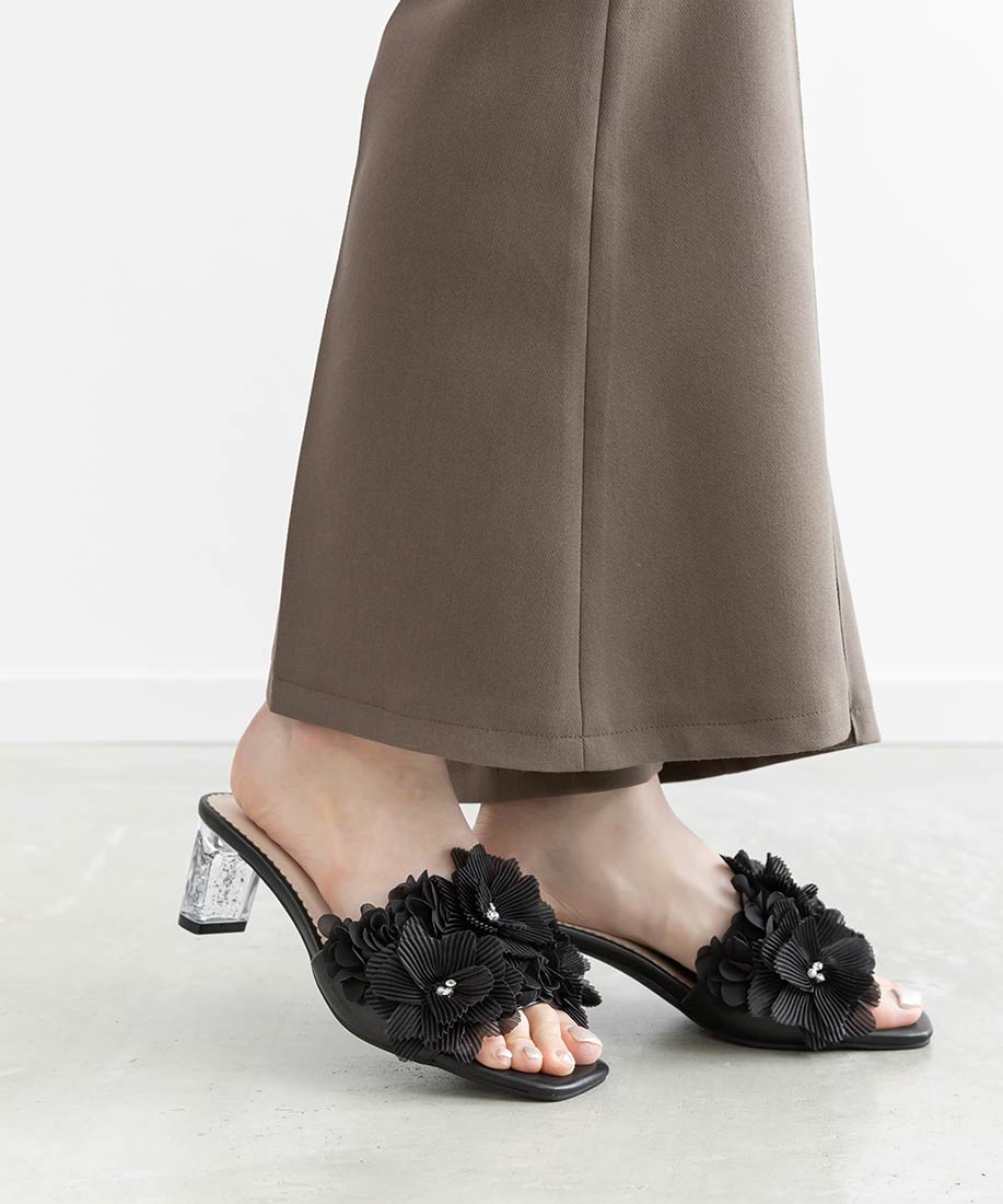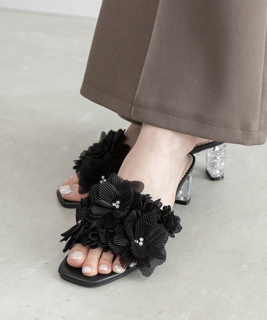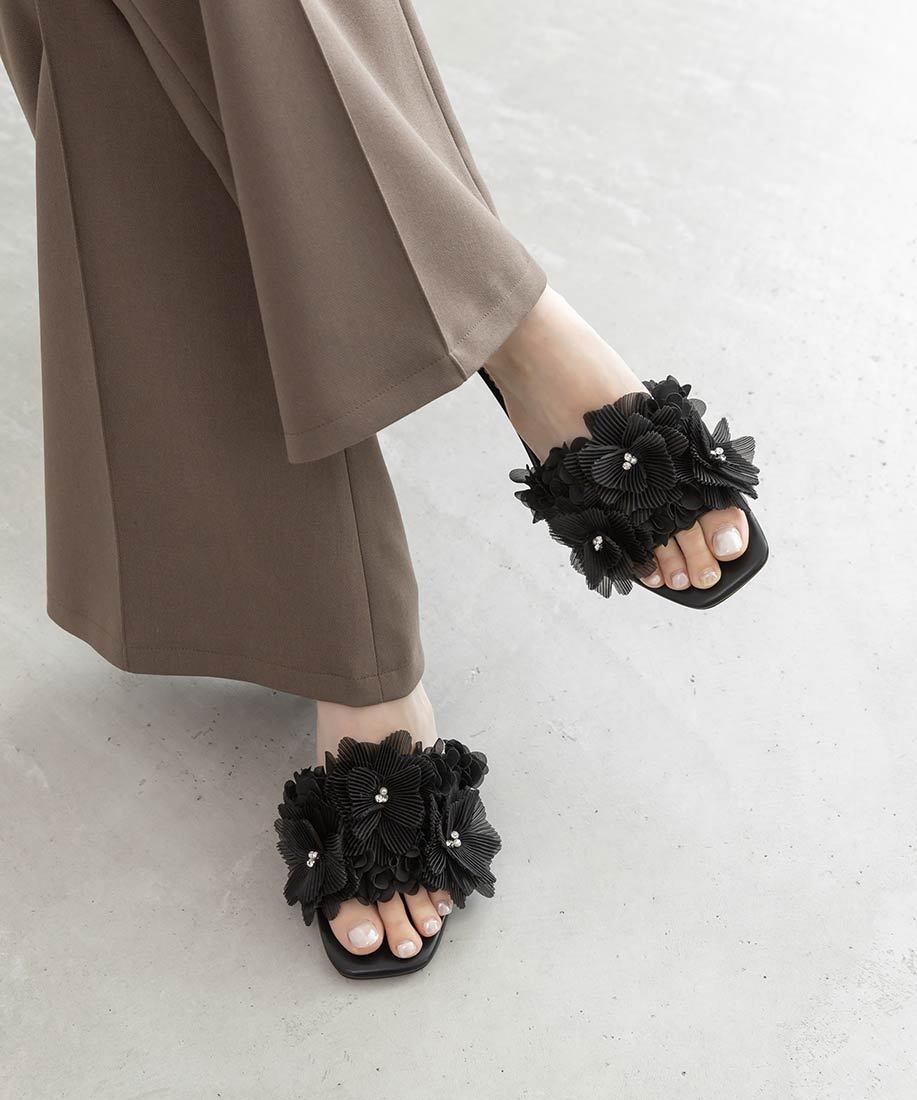 プリーツフラワーミュールサンダル