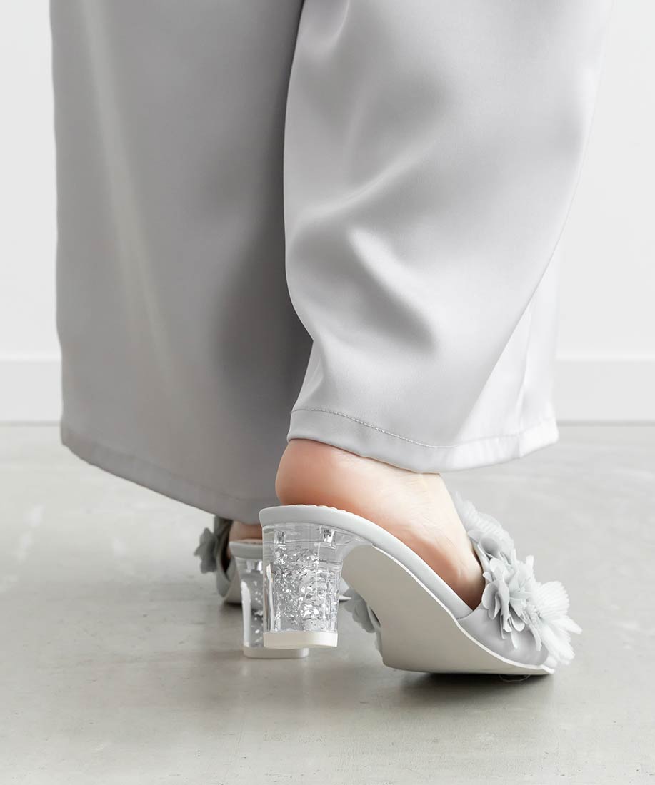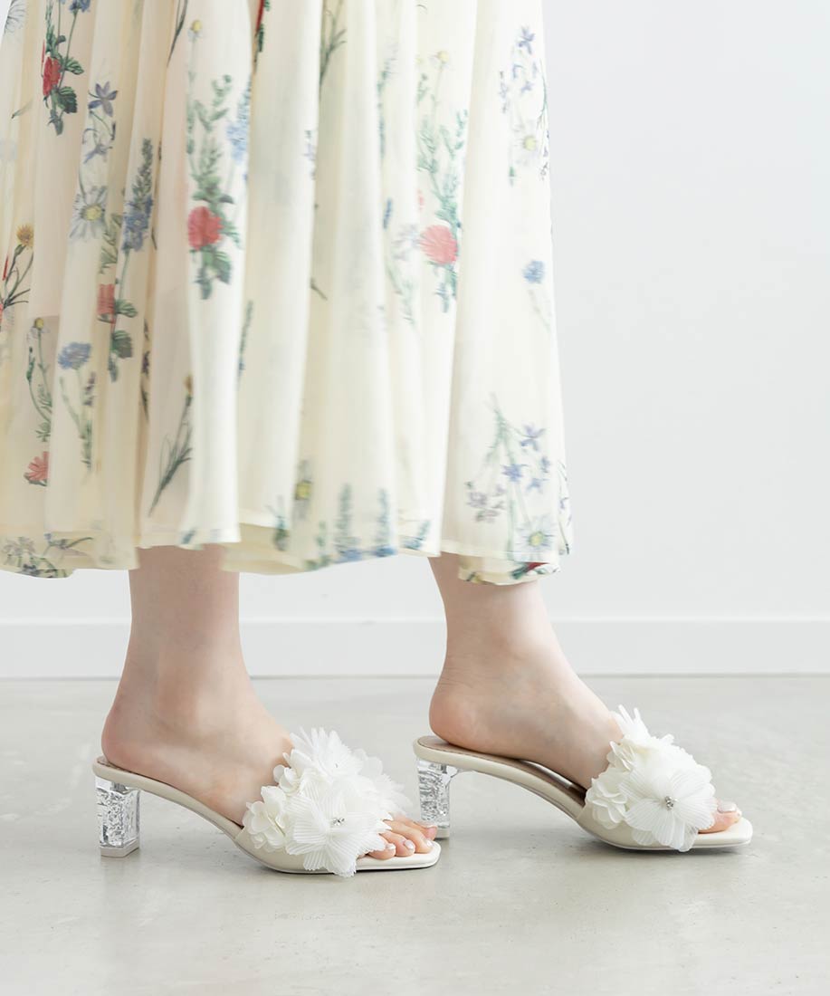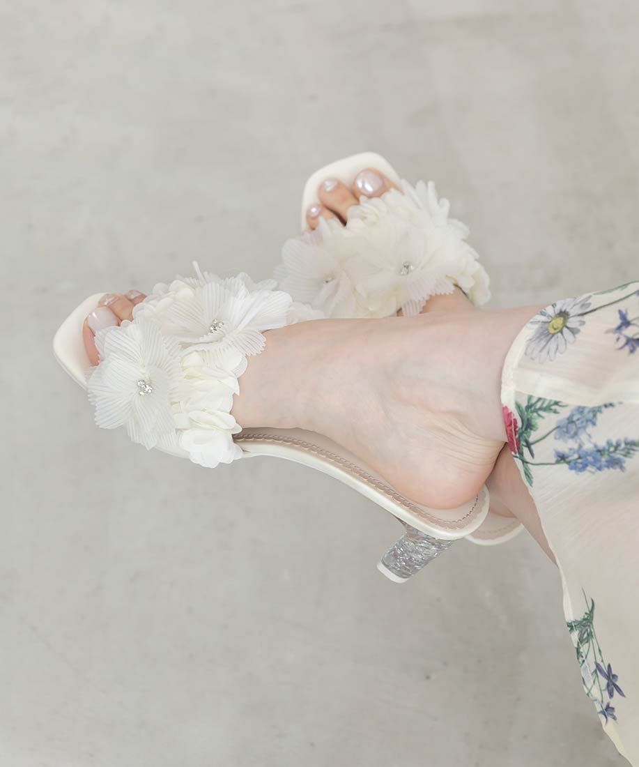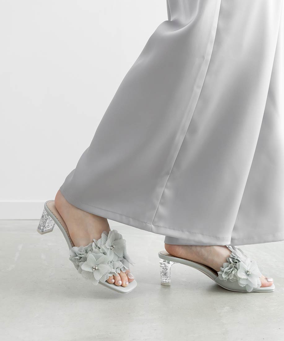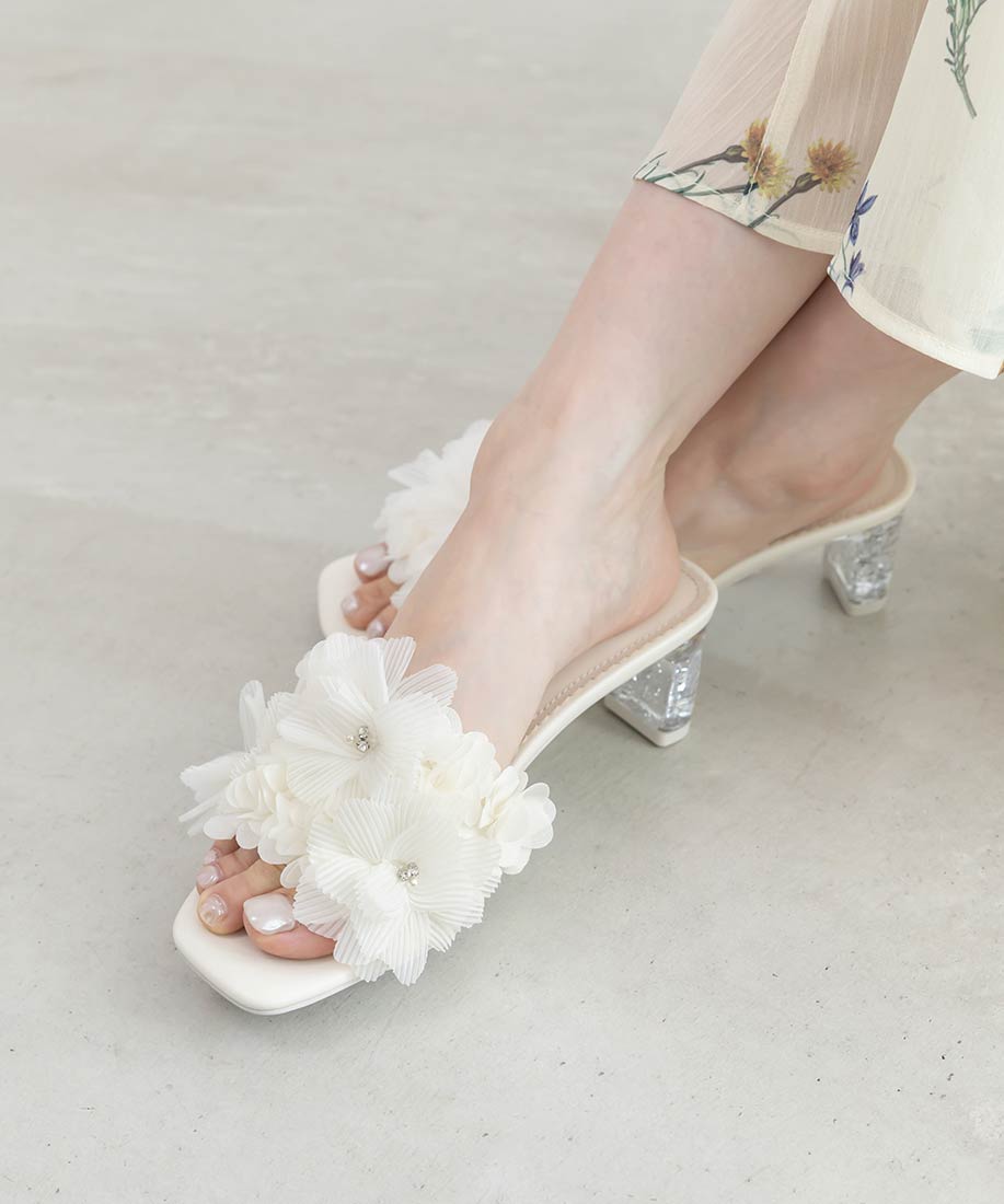プリーツフラワーミュールサンダル