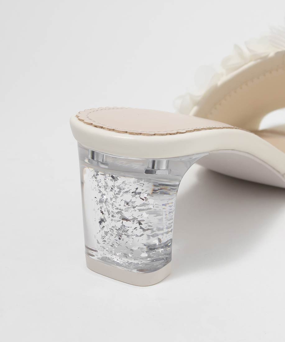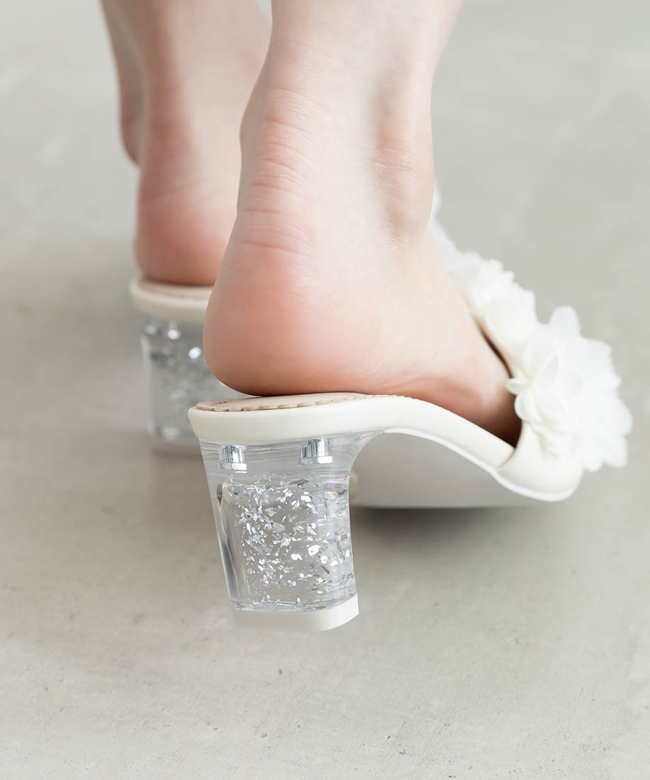 レディーライクなフラワーモチーフが目を惹くミュールサンダル。