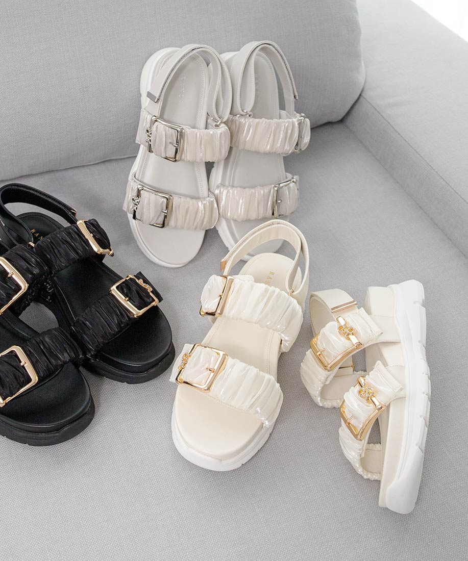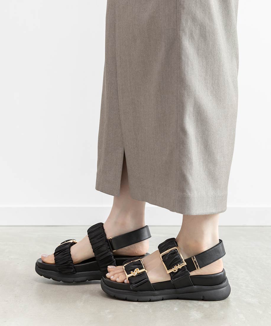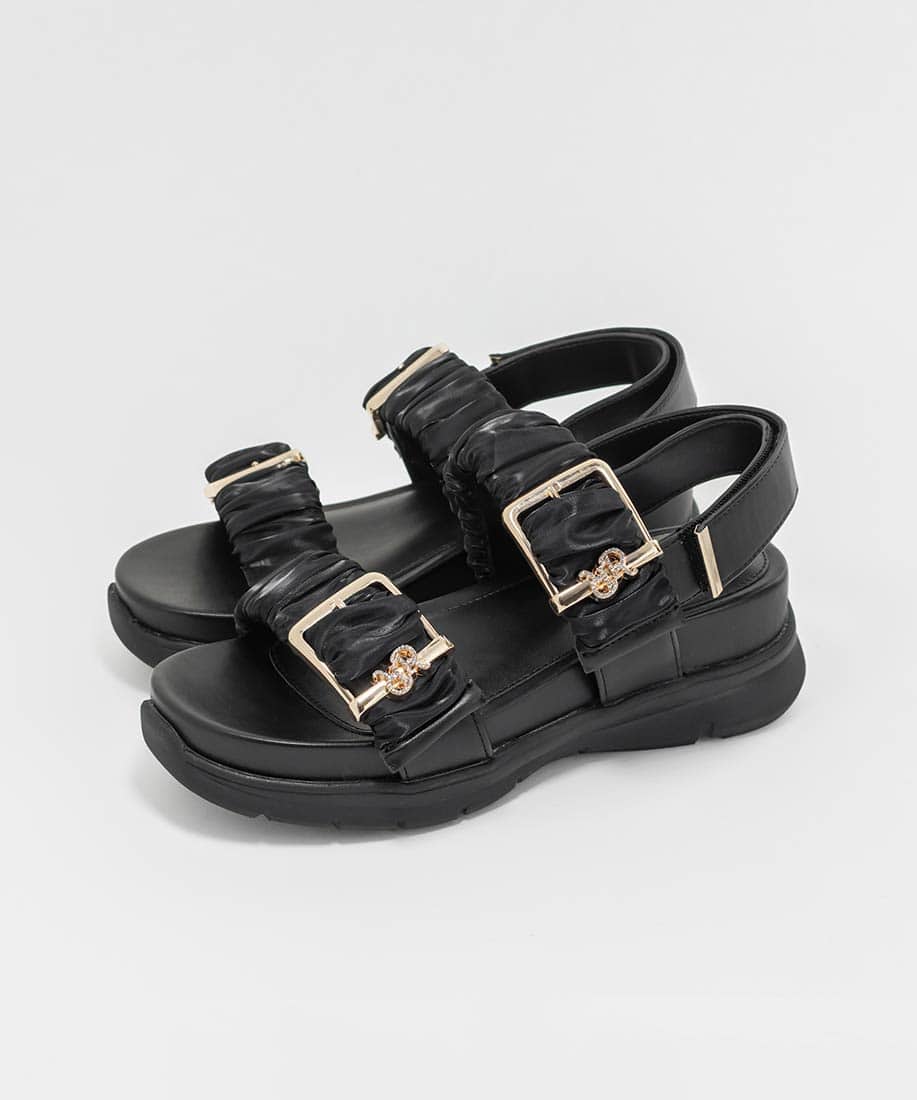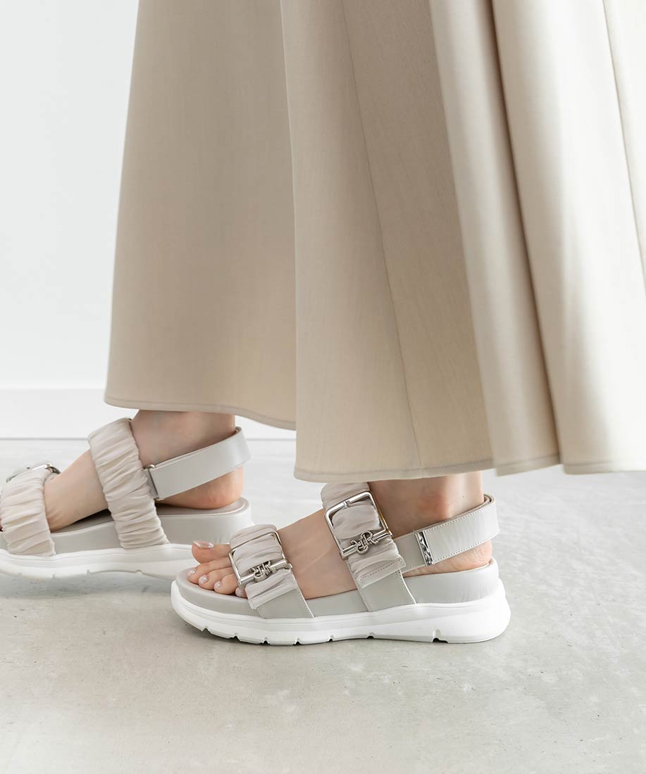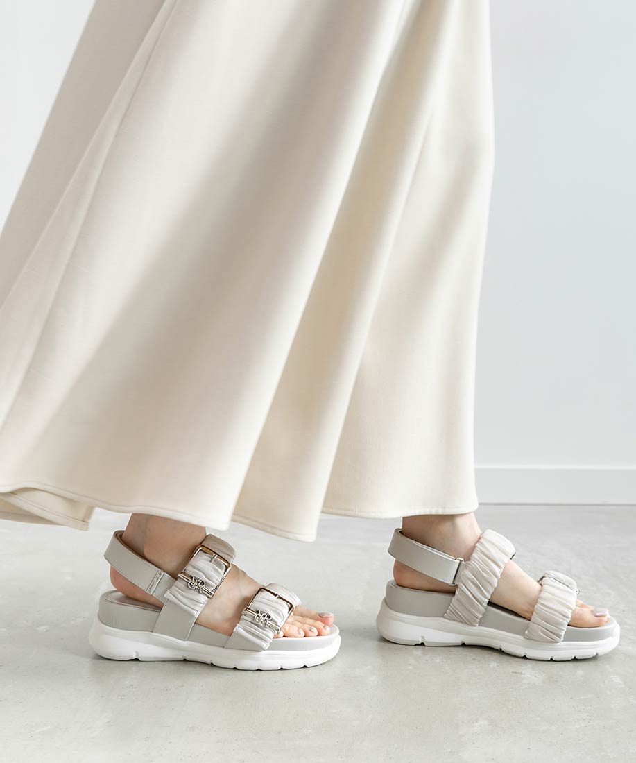 立体感のあるギャザーベルトが印象的なスポーツサンダル。
