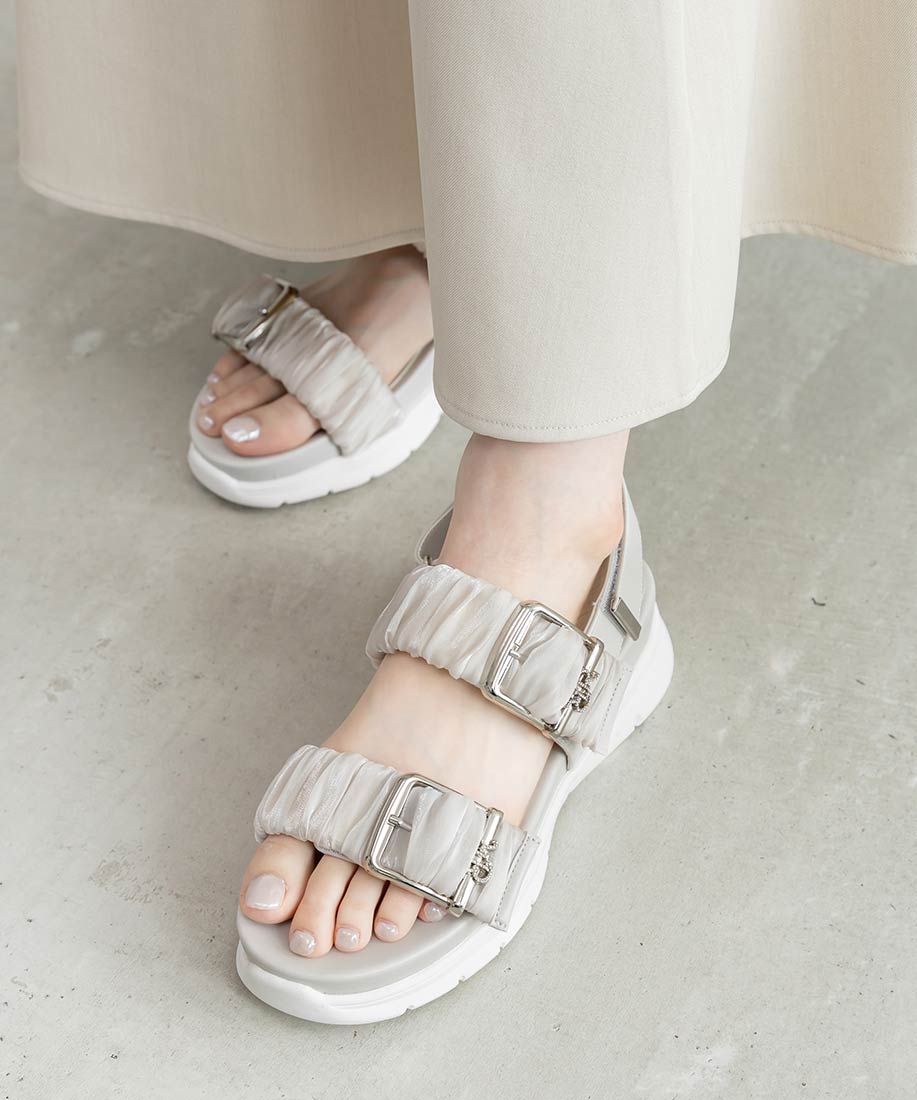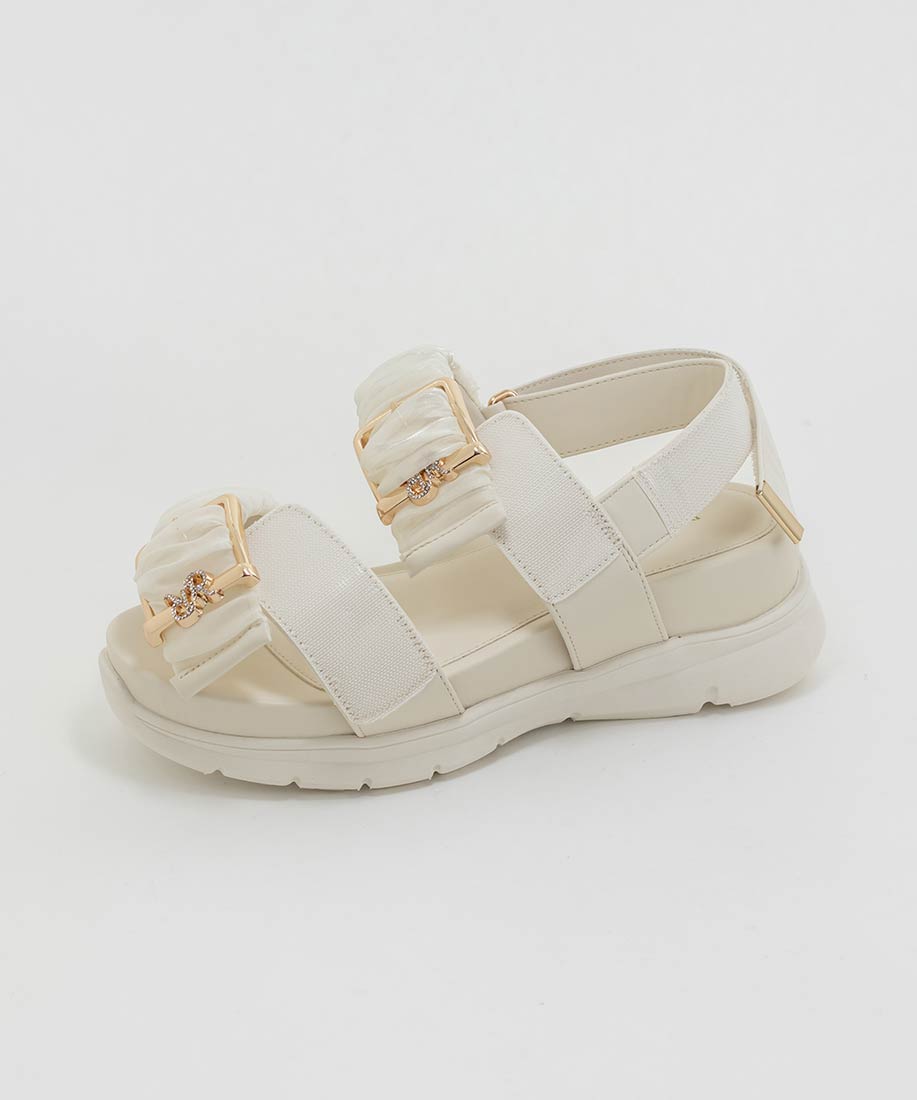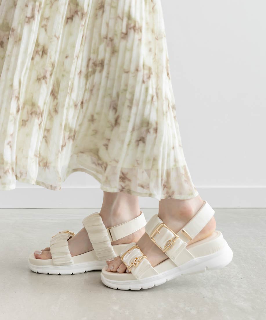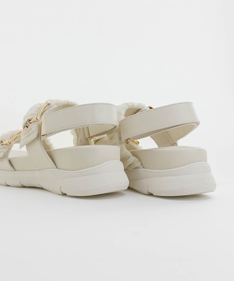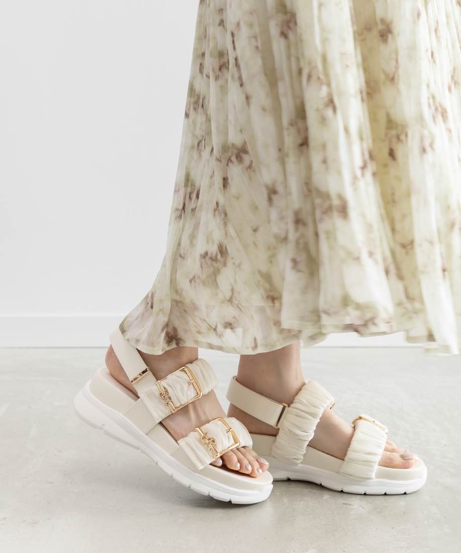 立体感のあるギャザーベルトが印象的なスポーツサンダル。