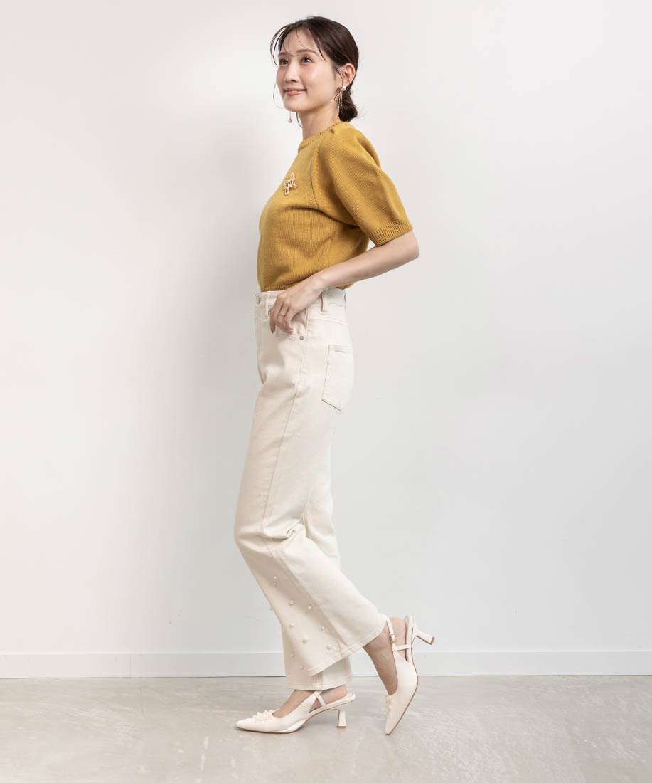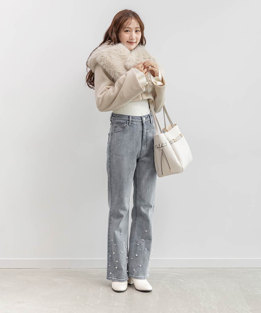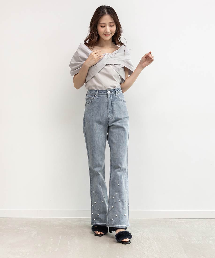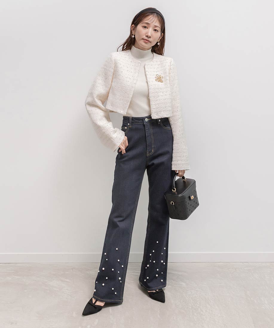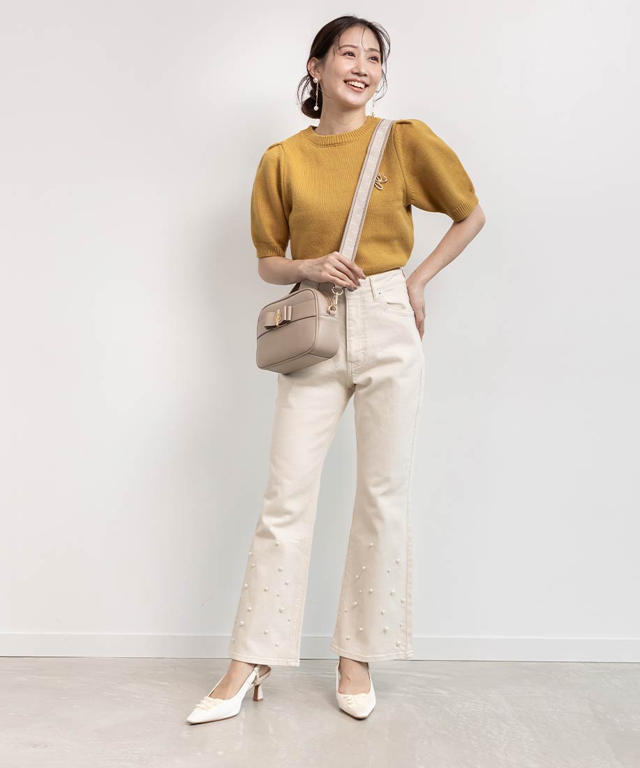 パールがフェミニンさをプラスしてくれるのでカジュアルになりすぎず、こなれた印象へと導いてくれます。
