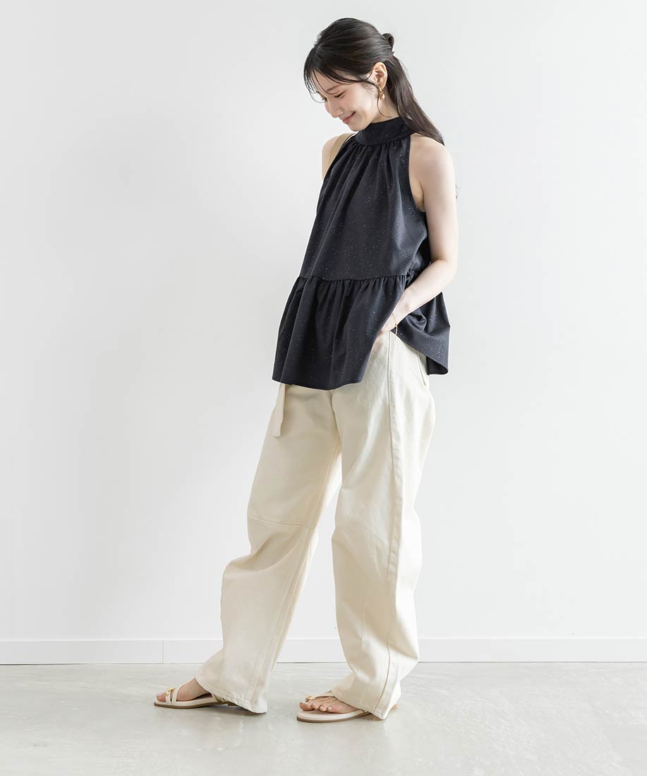 ・ウエストはややハイライズに仕上げ、切り替えやステッチでお腹を押さえてスッキリとしたきれいなシルエットに