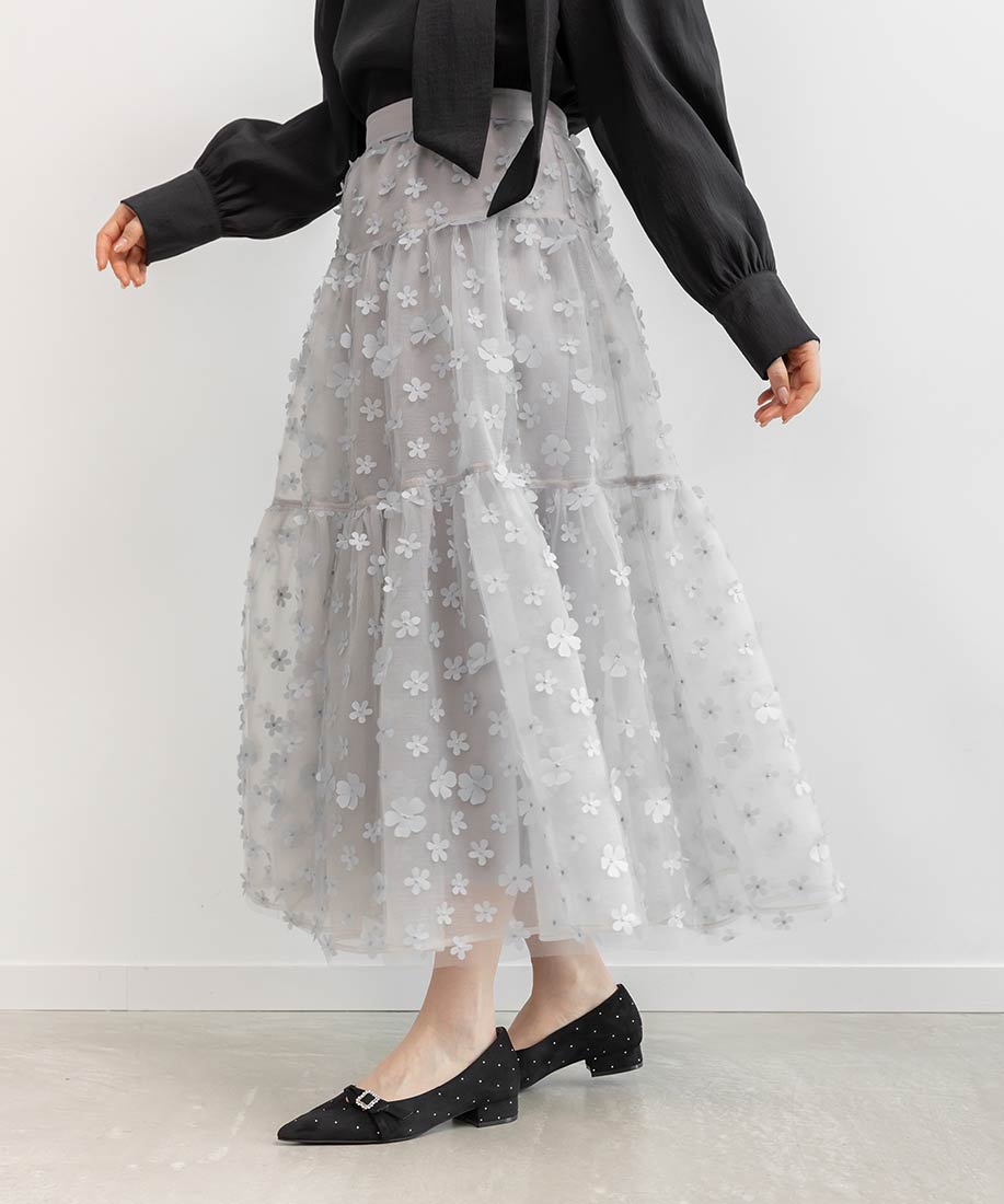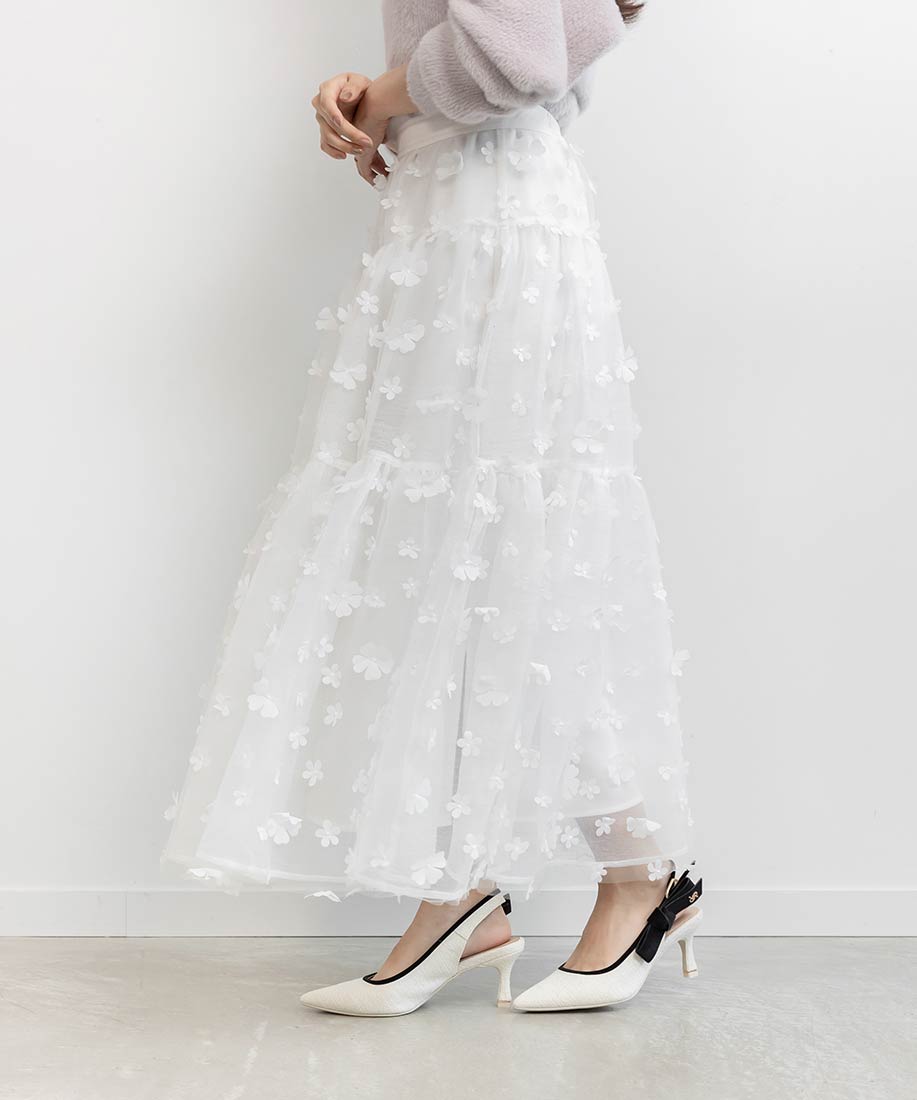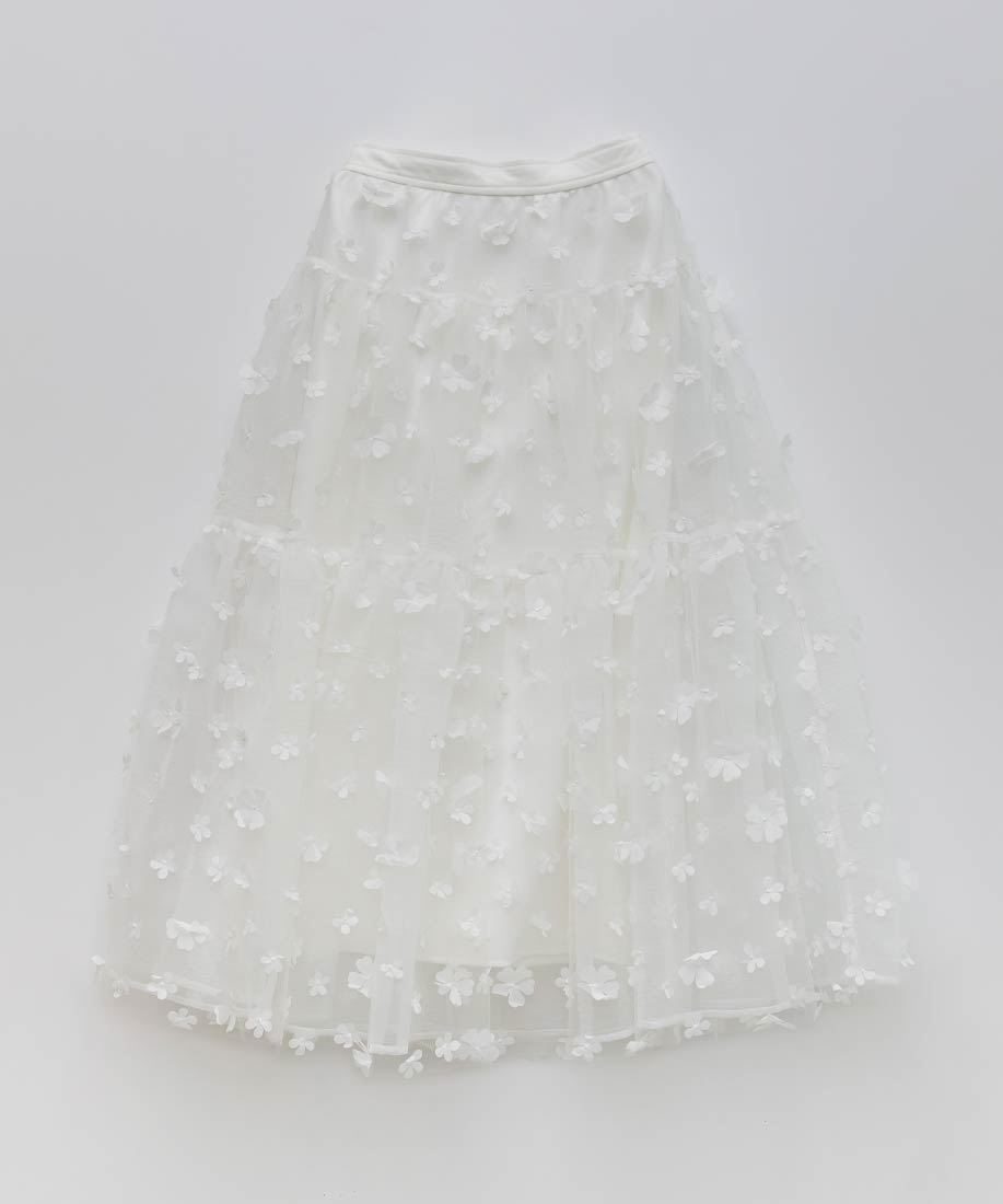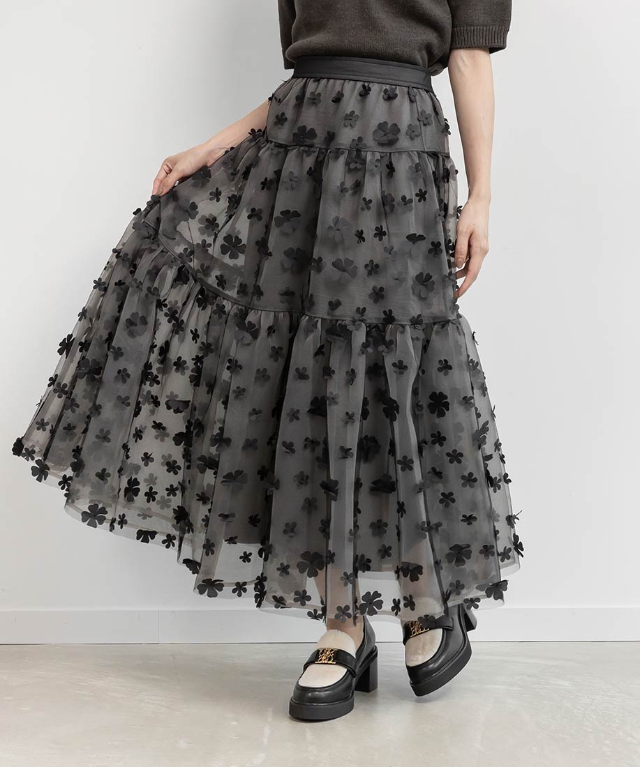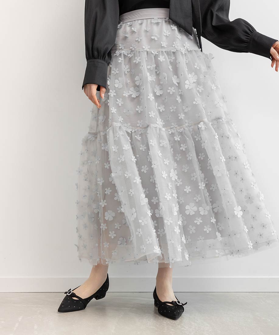 今季注目の3Dフラワー素材を贅沢に使用したティアードスカート。