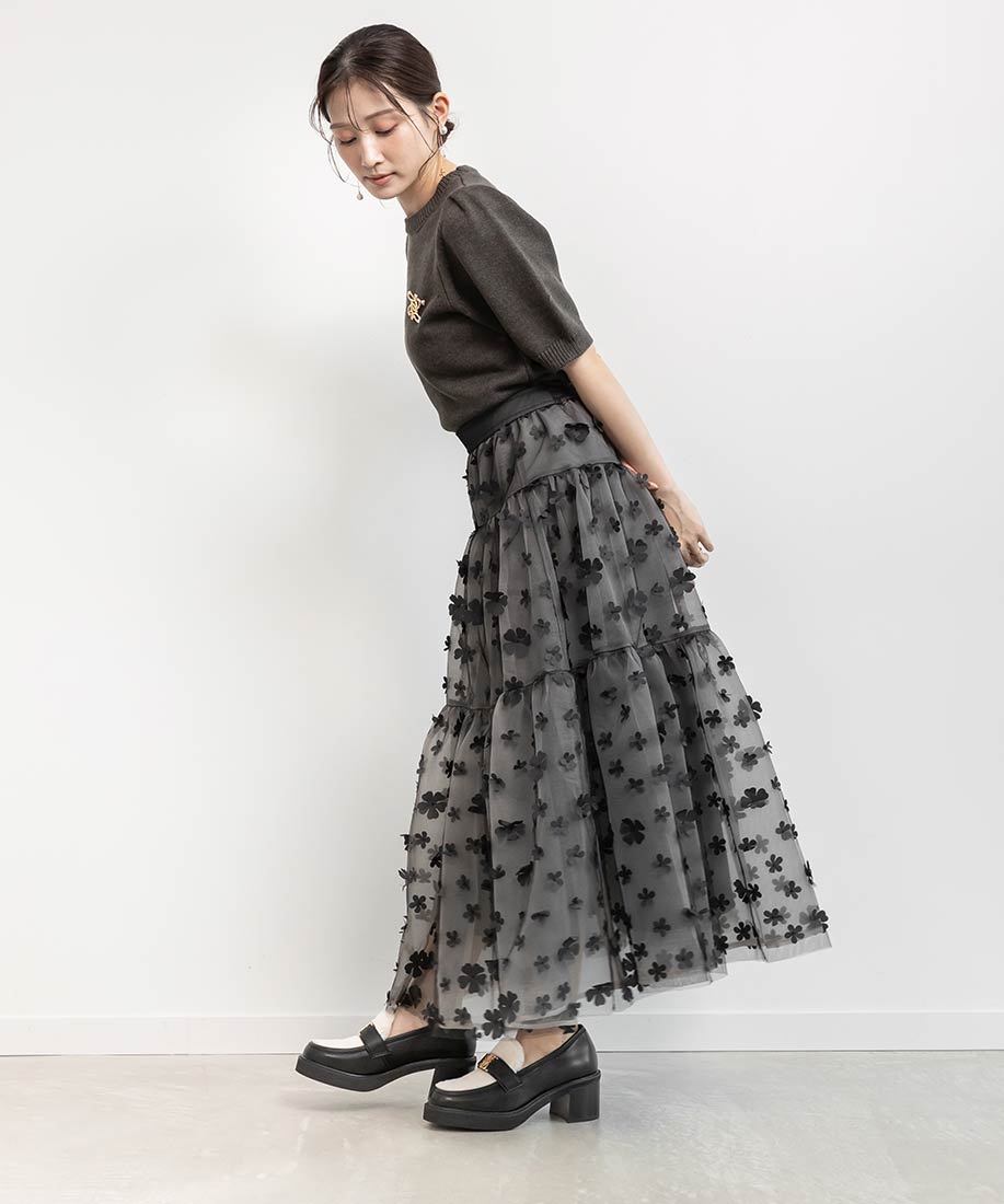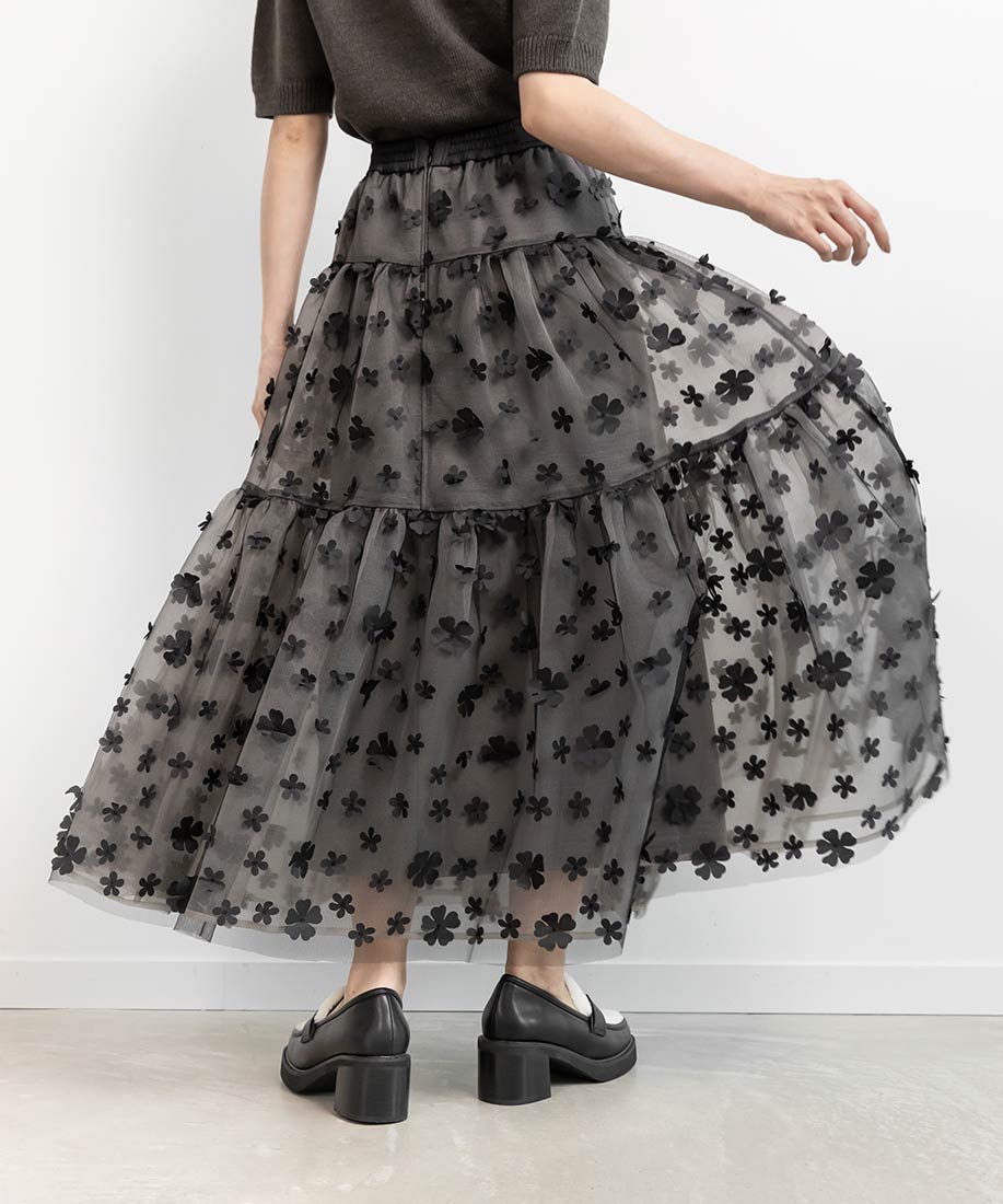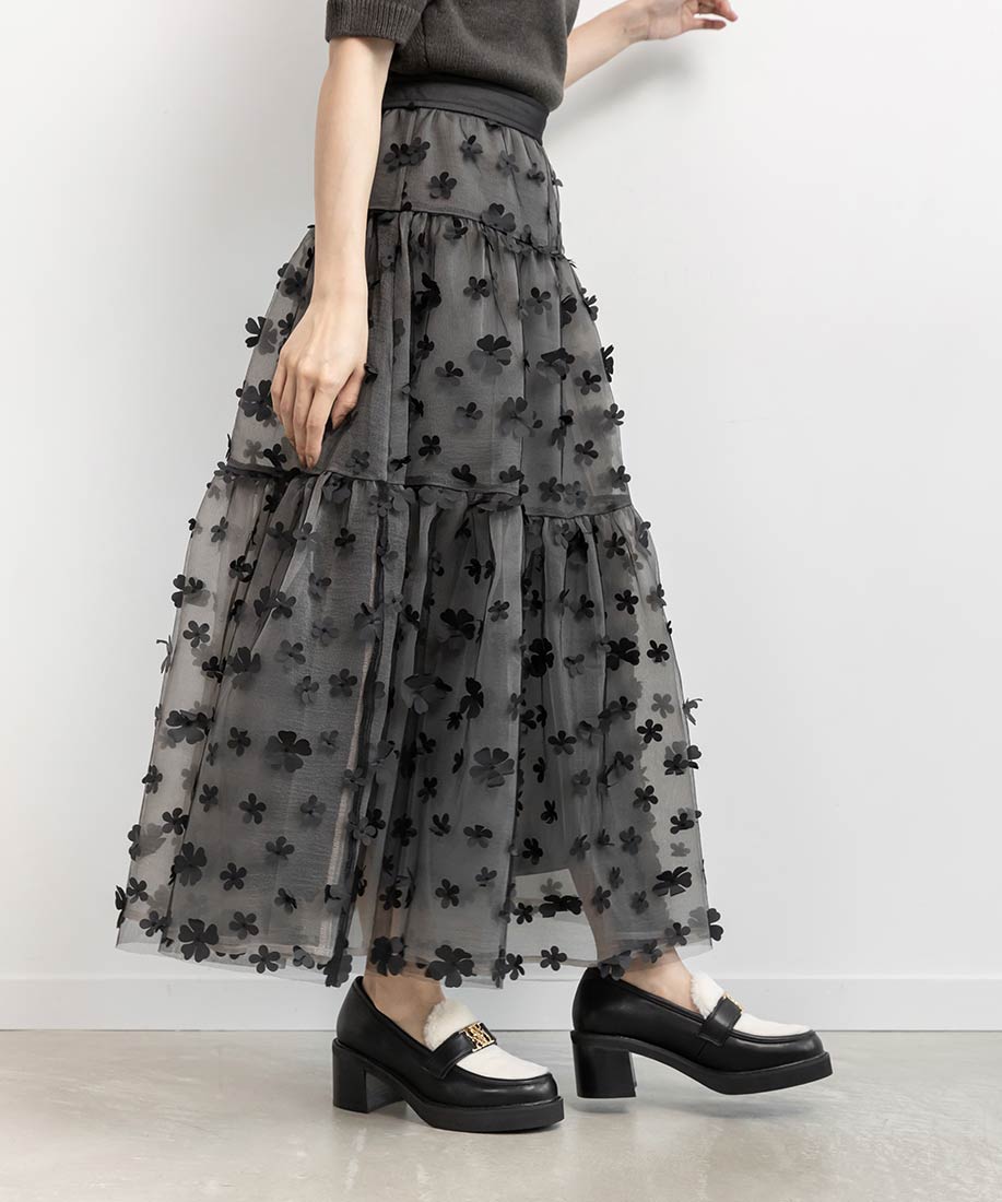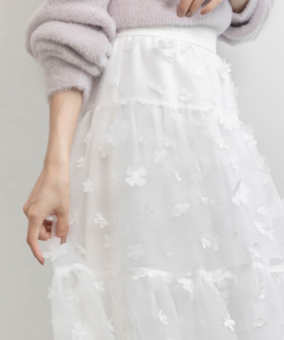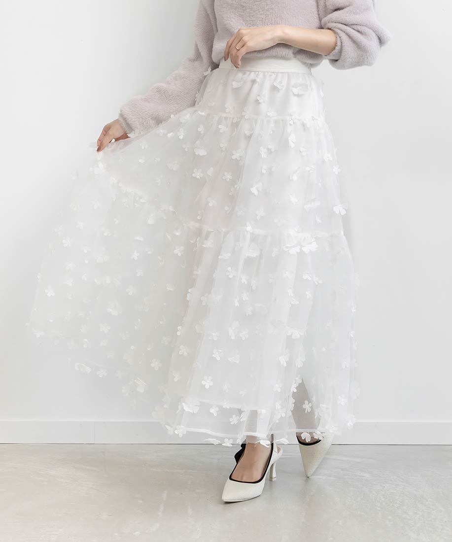 今季注目の3Dフラワー素材を贅沢に使用したティアードスカート。