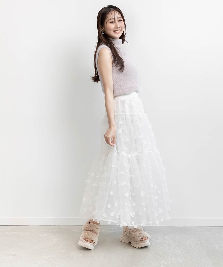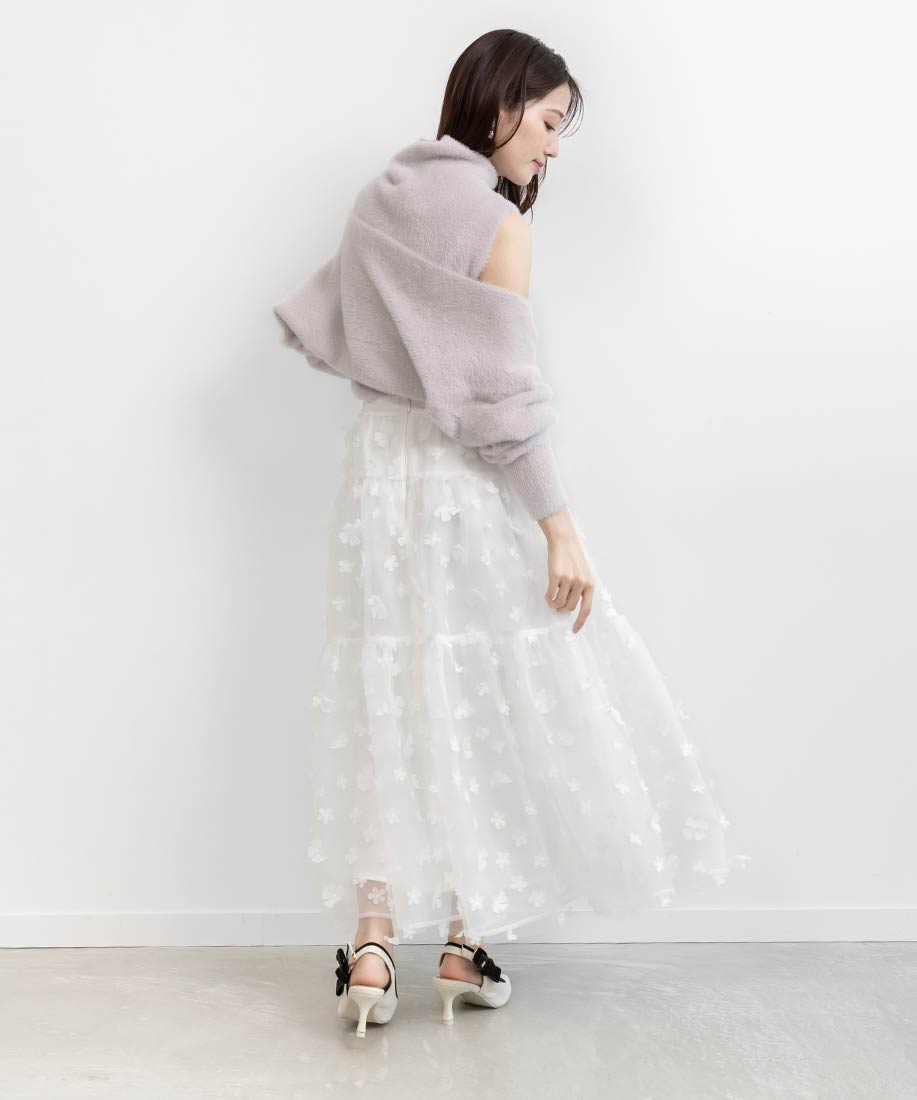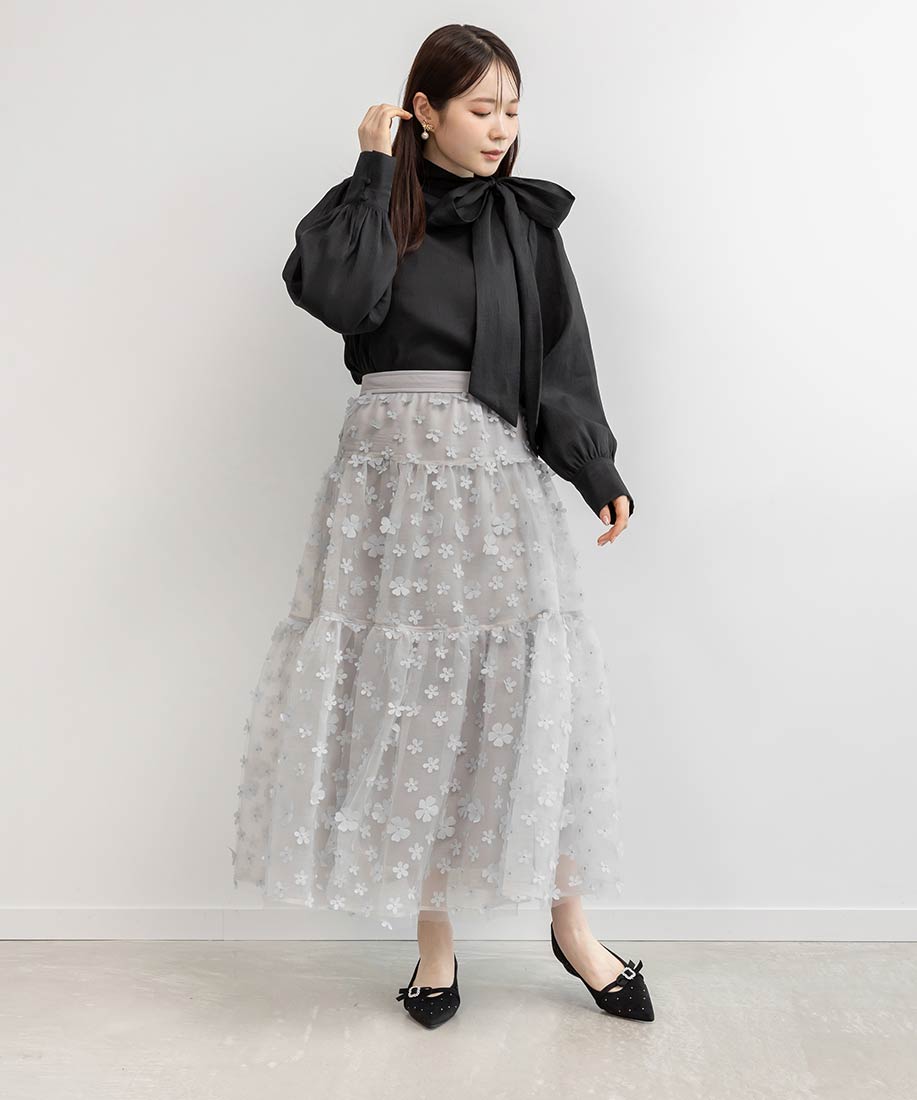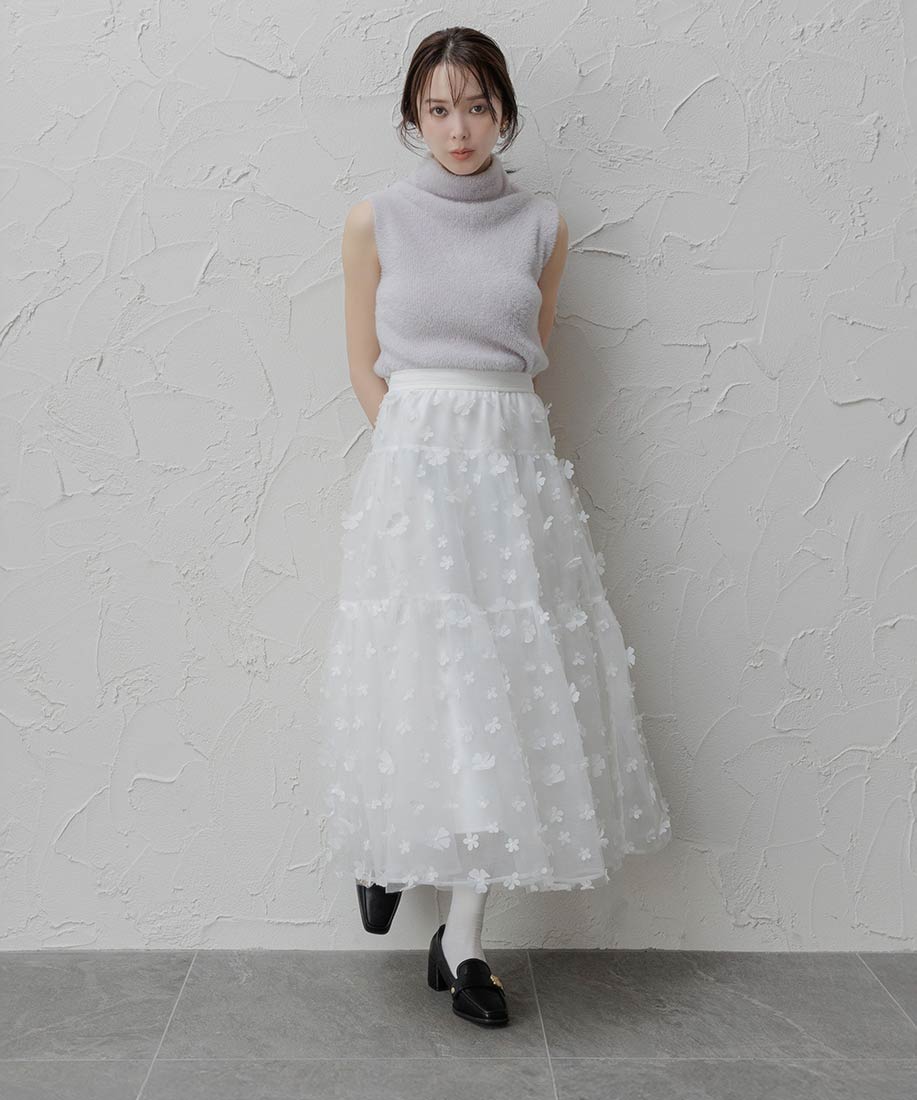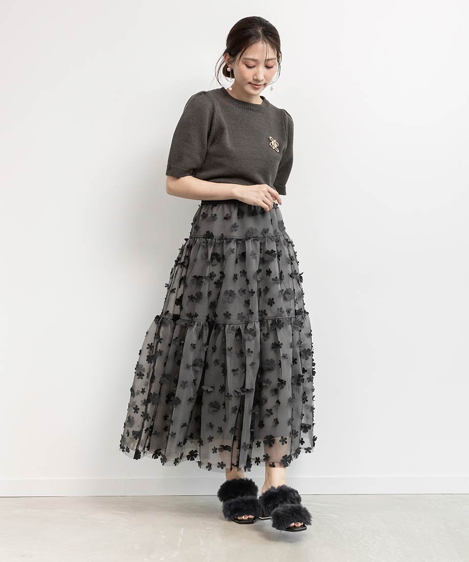 今季注目の3Dフラワー素材を贅沢に使用したティアードスカート。