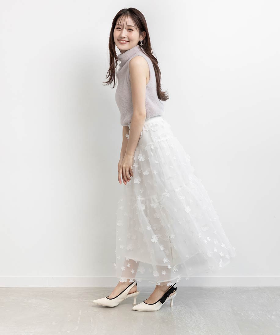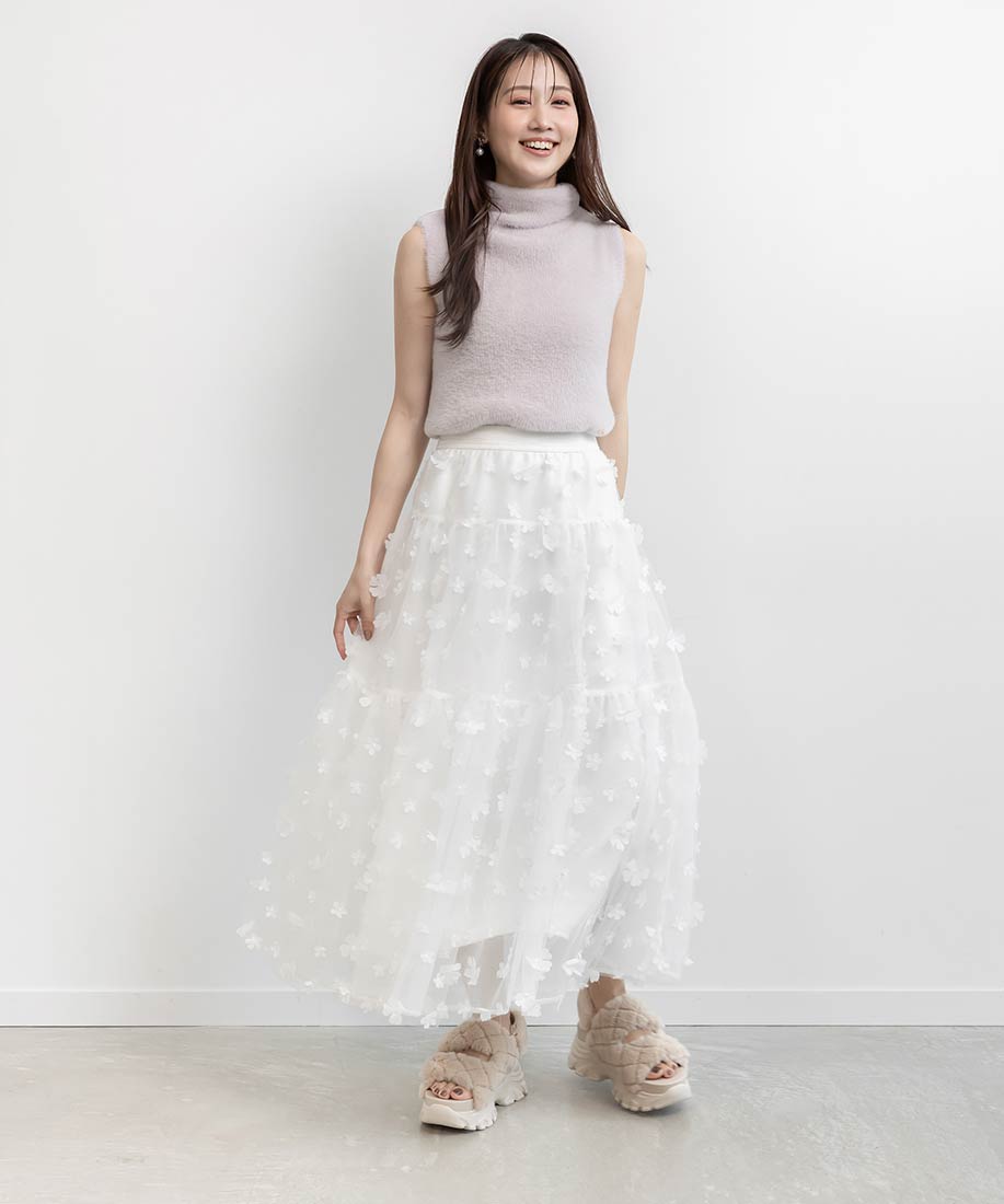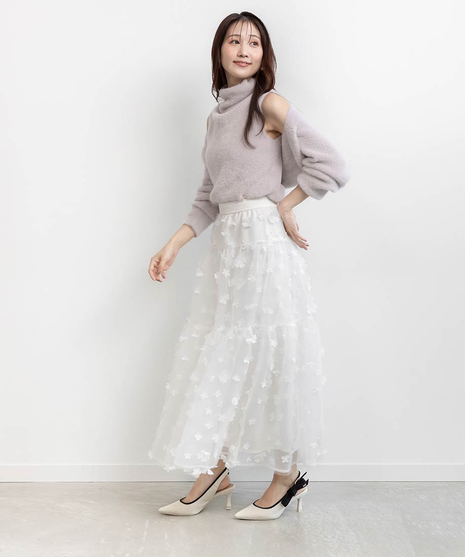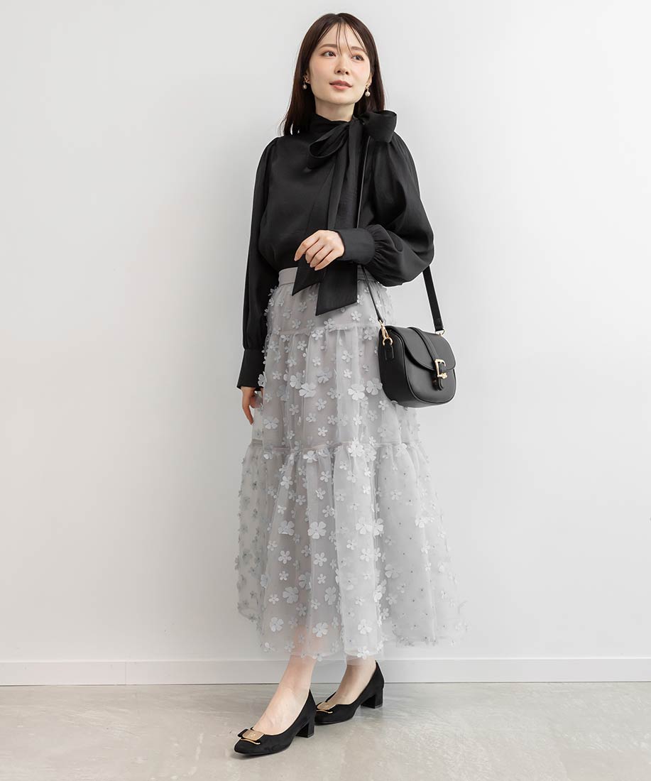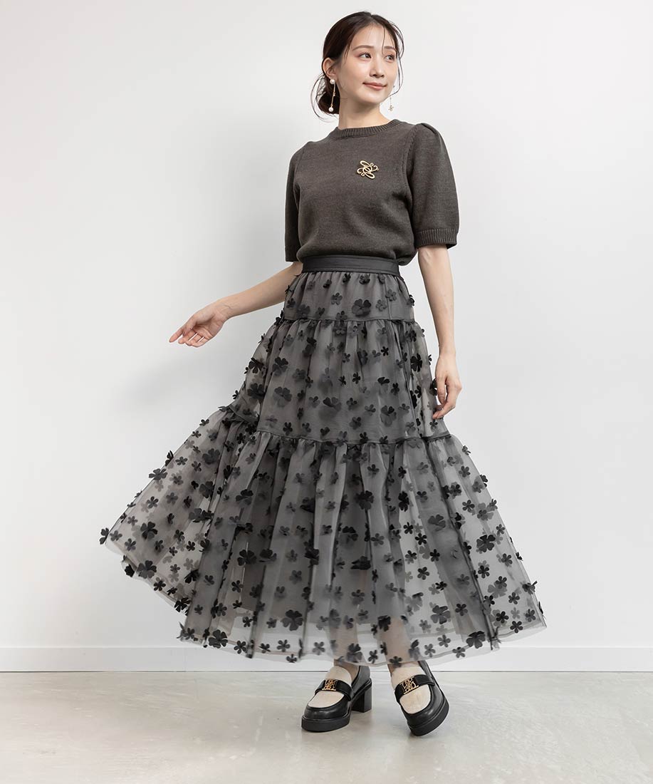 今季注目の3Dフラワー素材を贅沢に使用したティアードスカート。