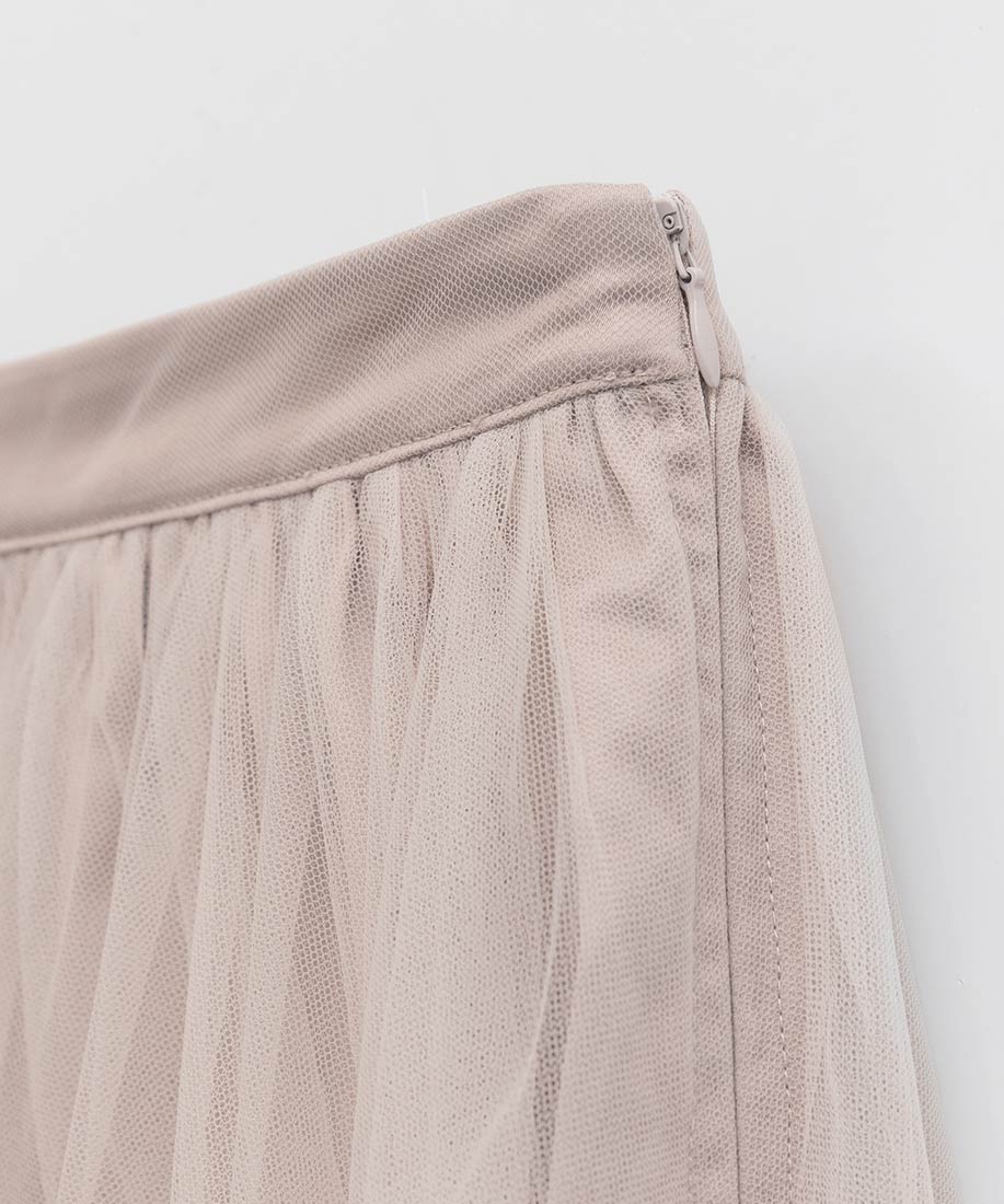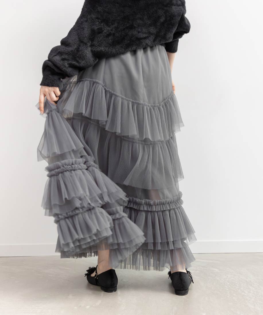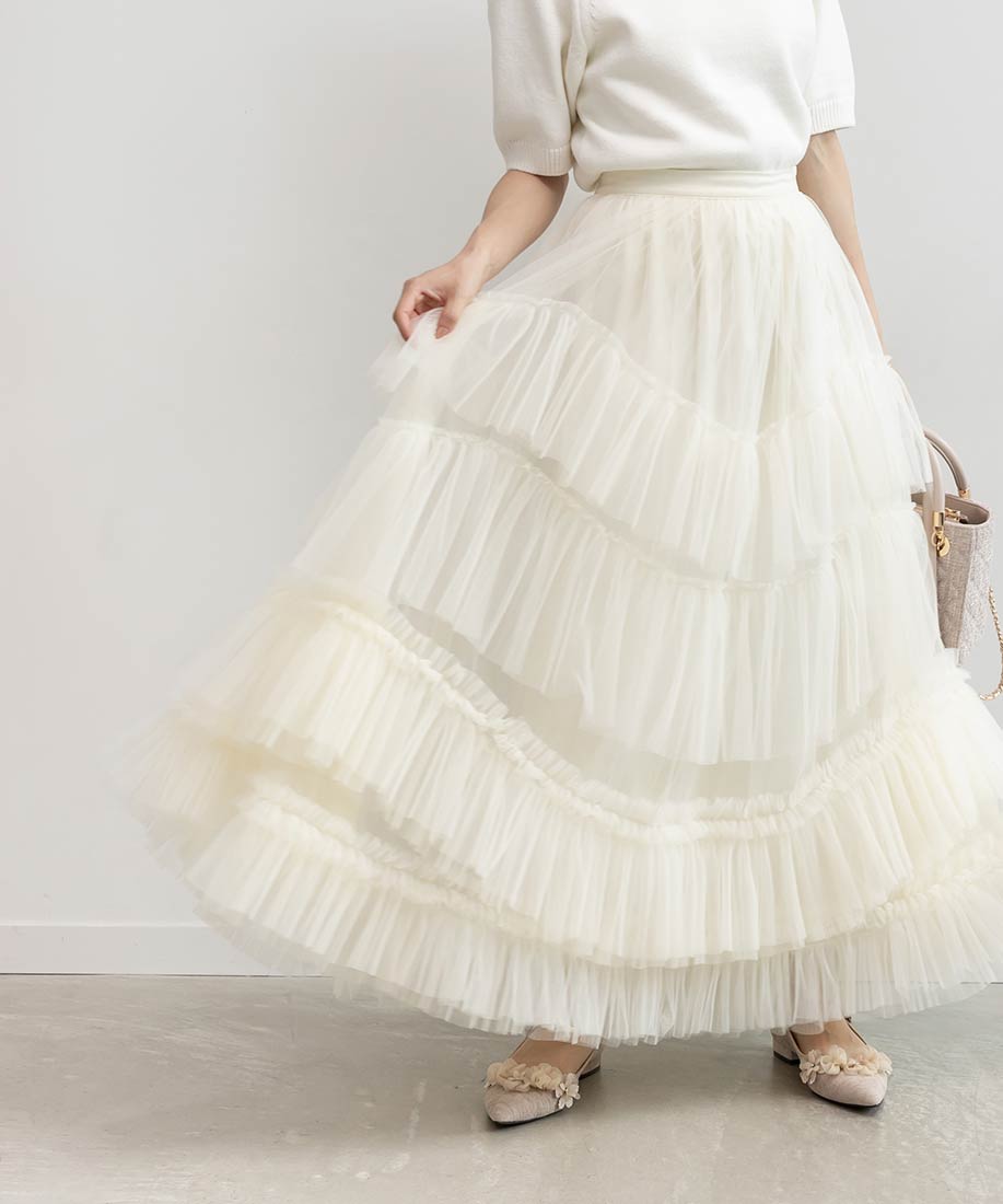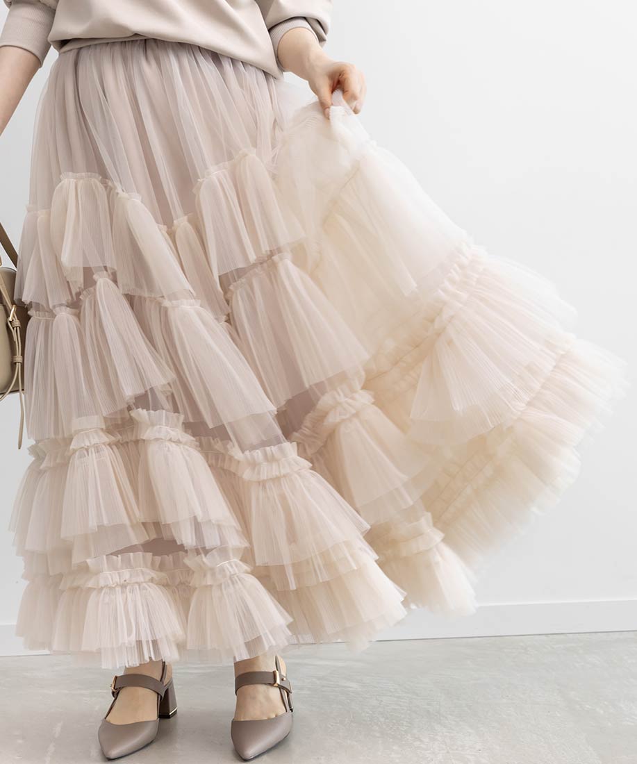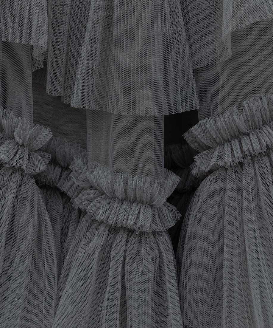 たっぷりと贅沢に施されたプリーツが繊細なチュールスカート。