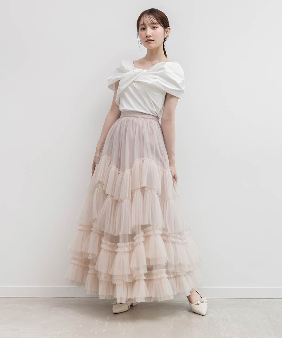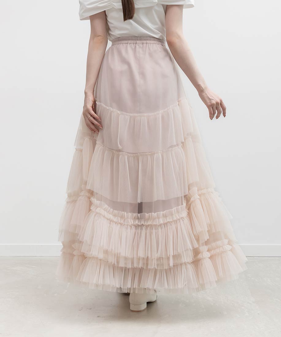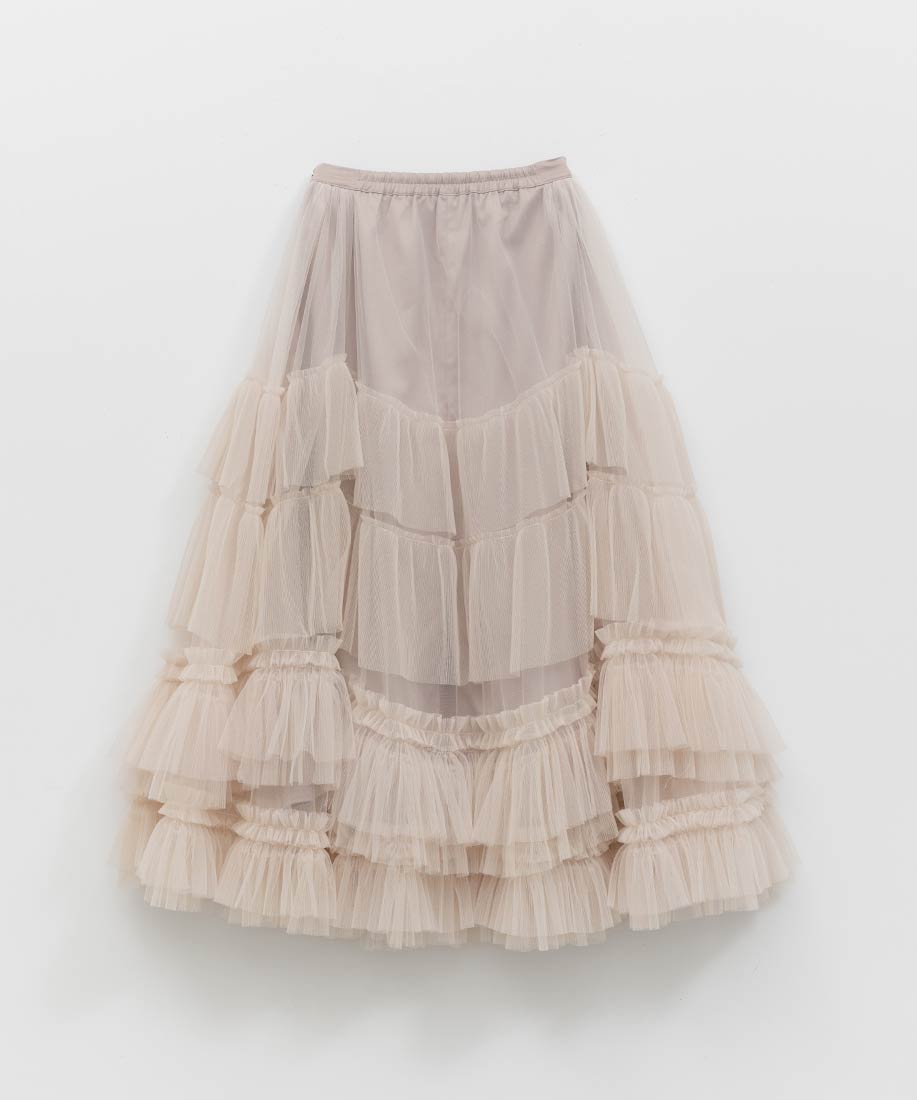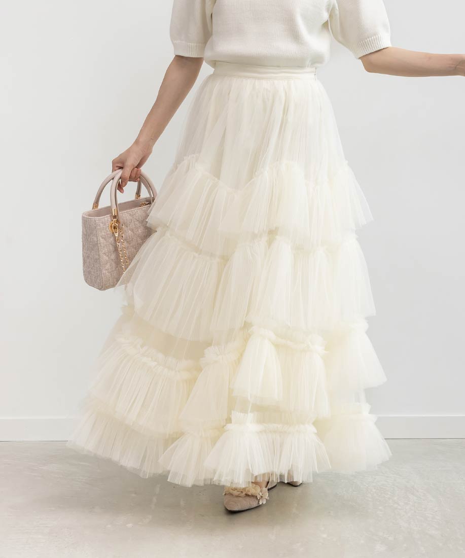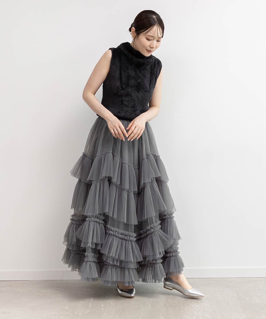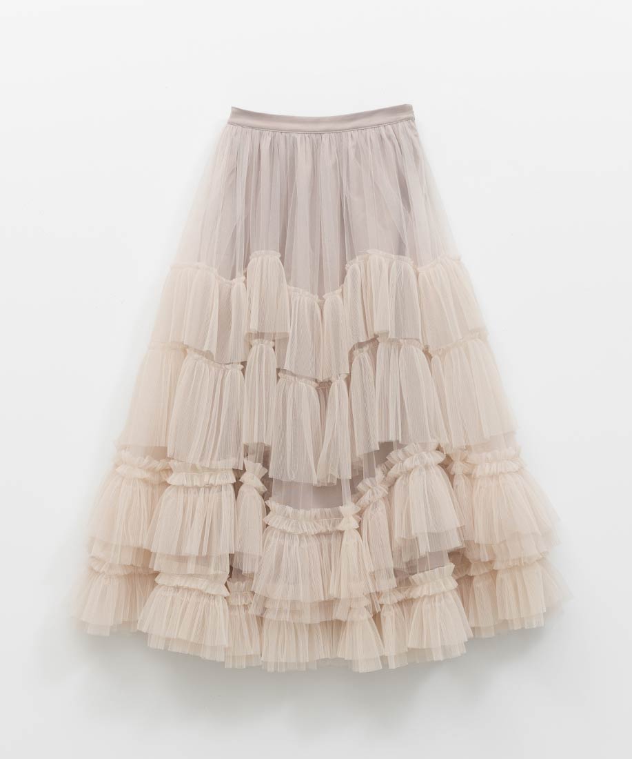 たっぷりと贅沢に施されたプリーツが繊細なチュールスカート。