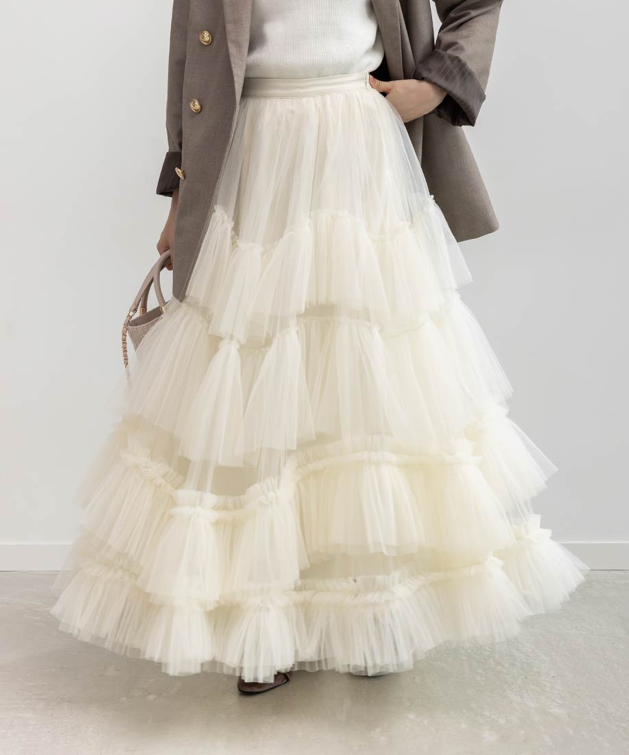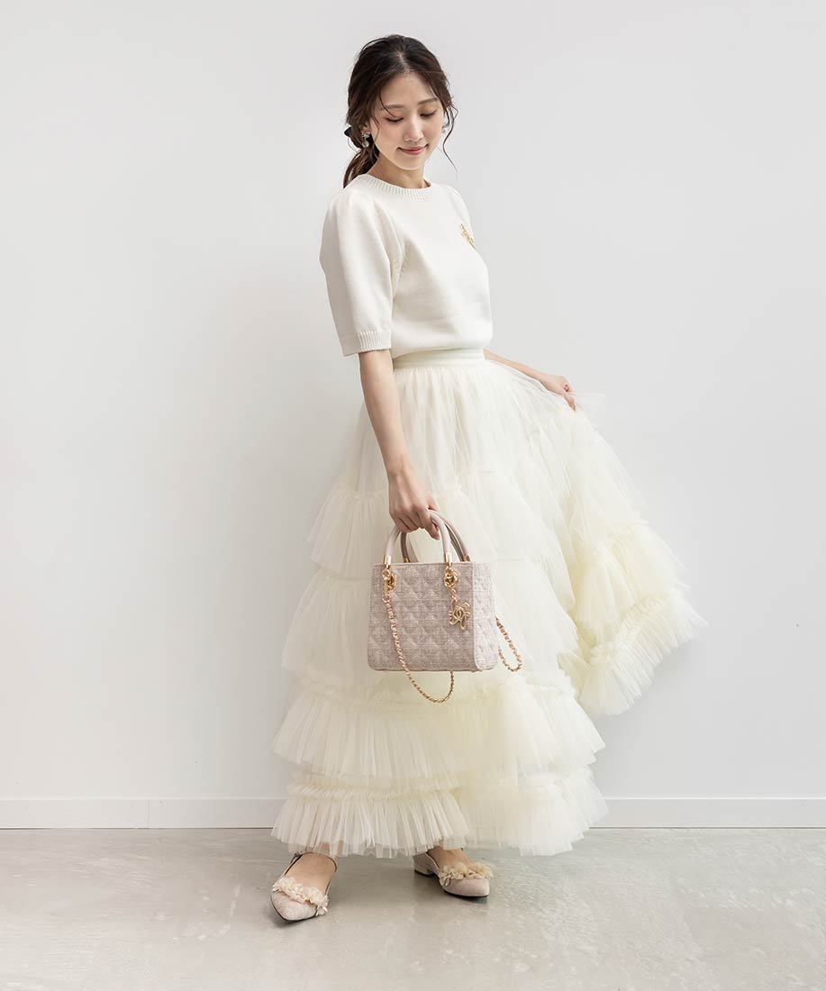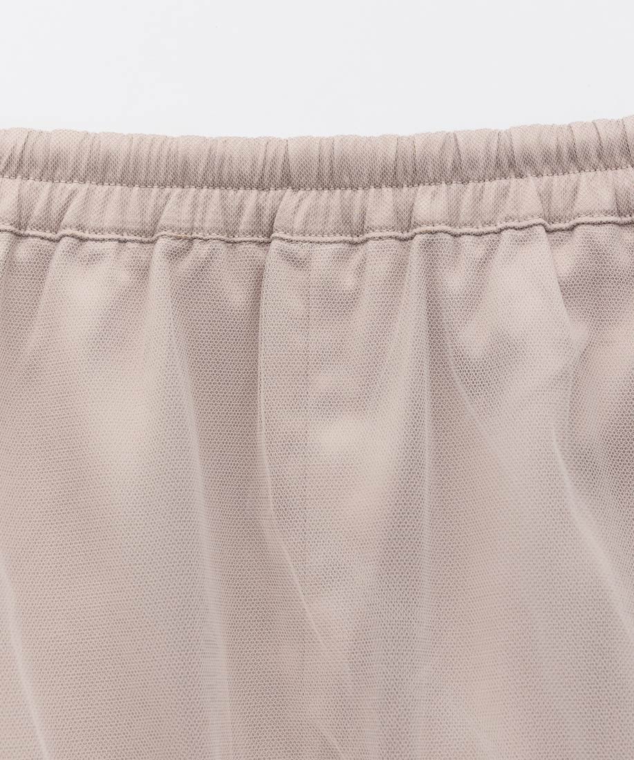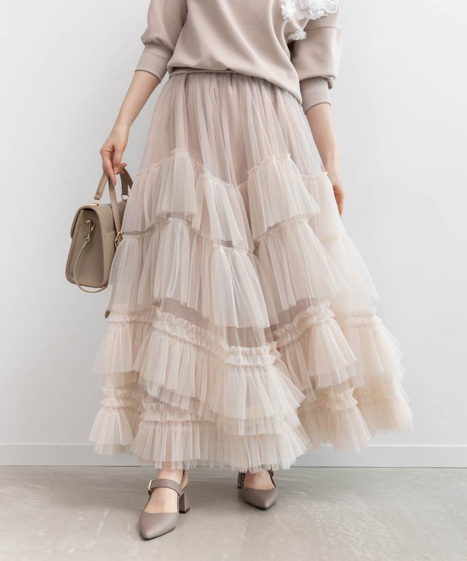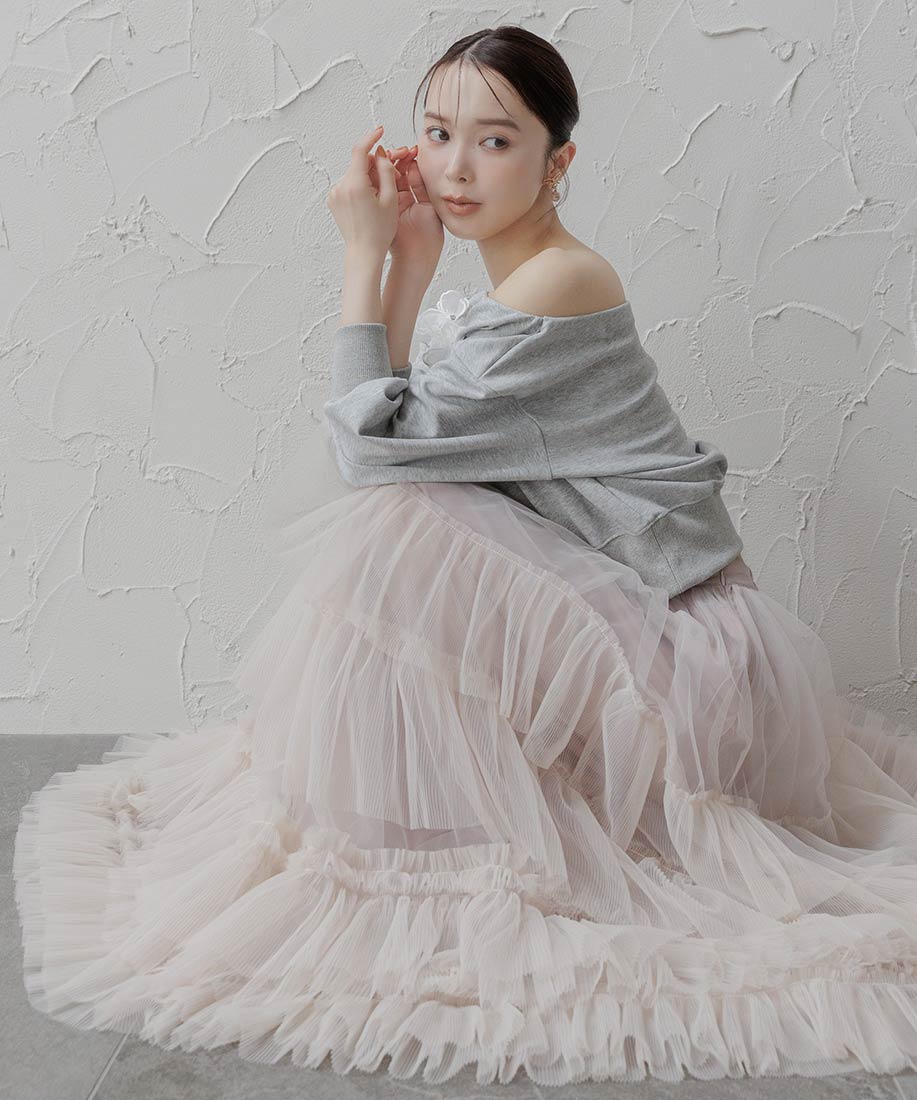たっぷりと贅沢に施されたプリーツが繊細なチュールスカート。
