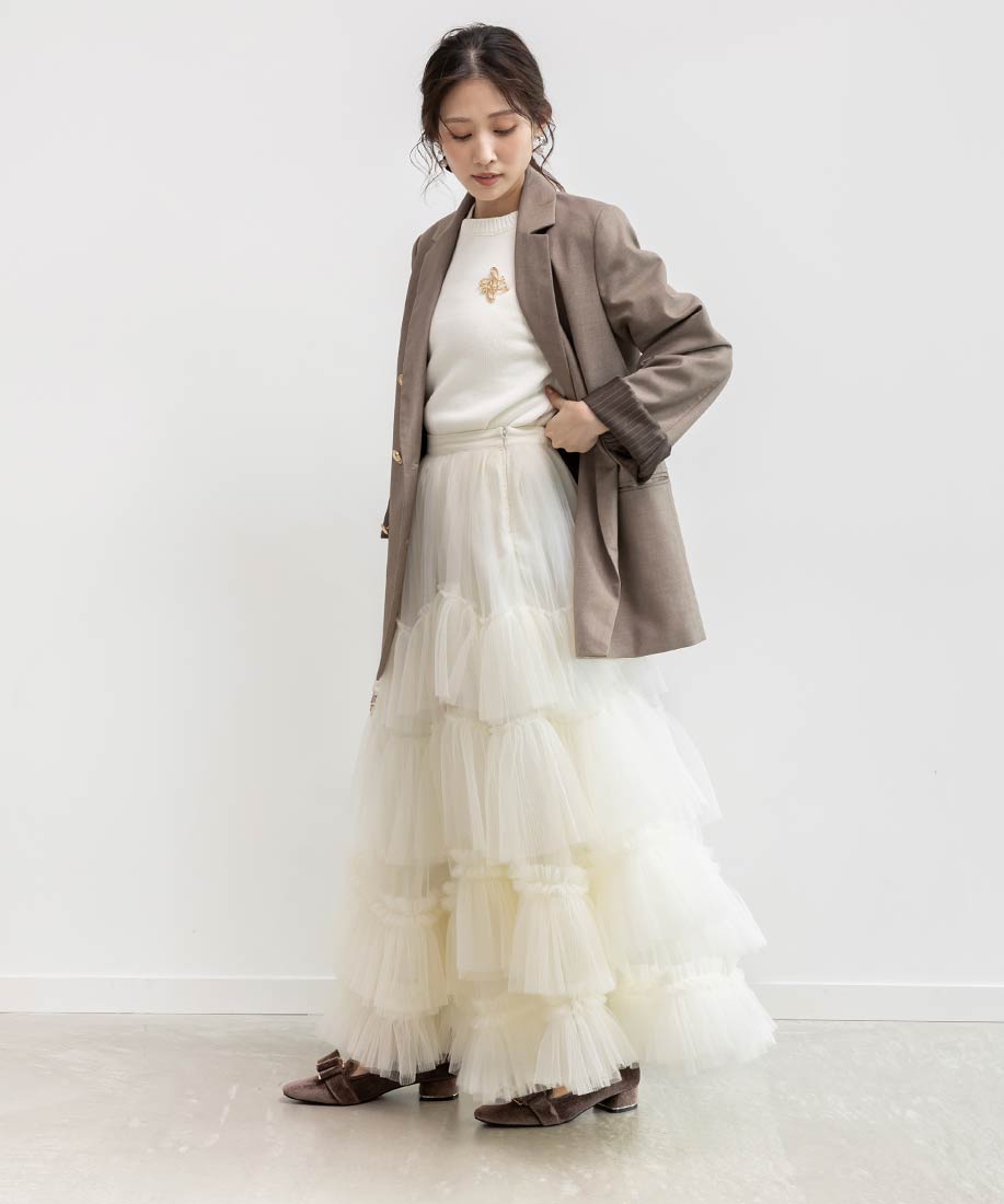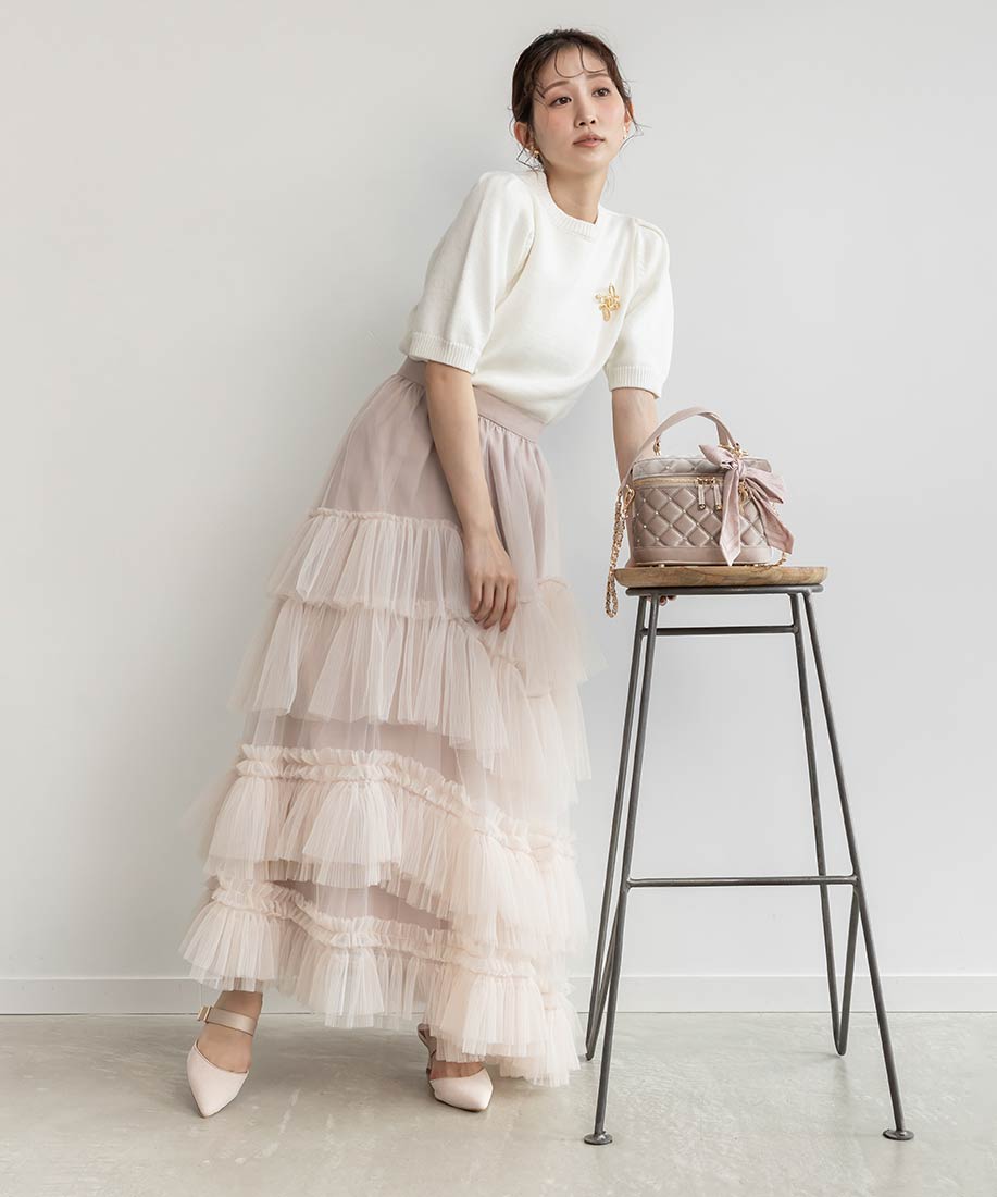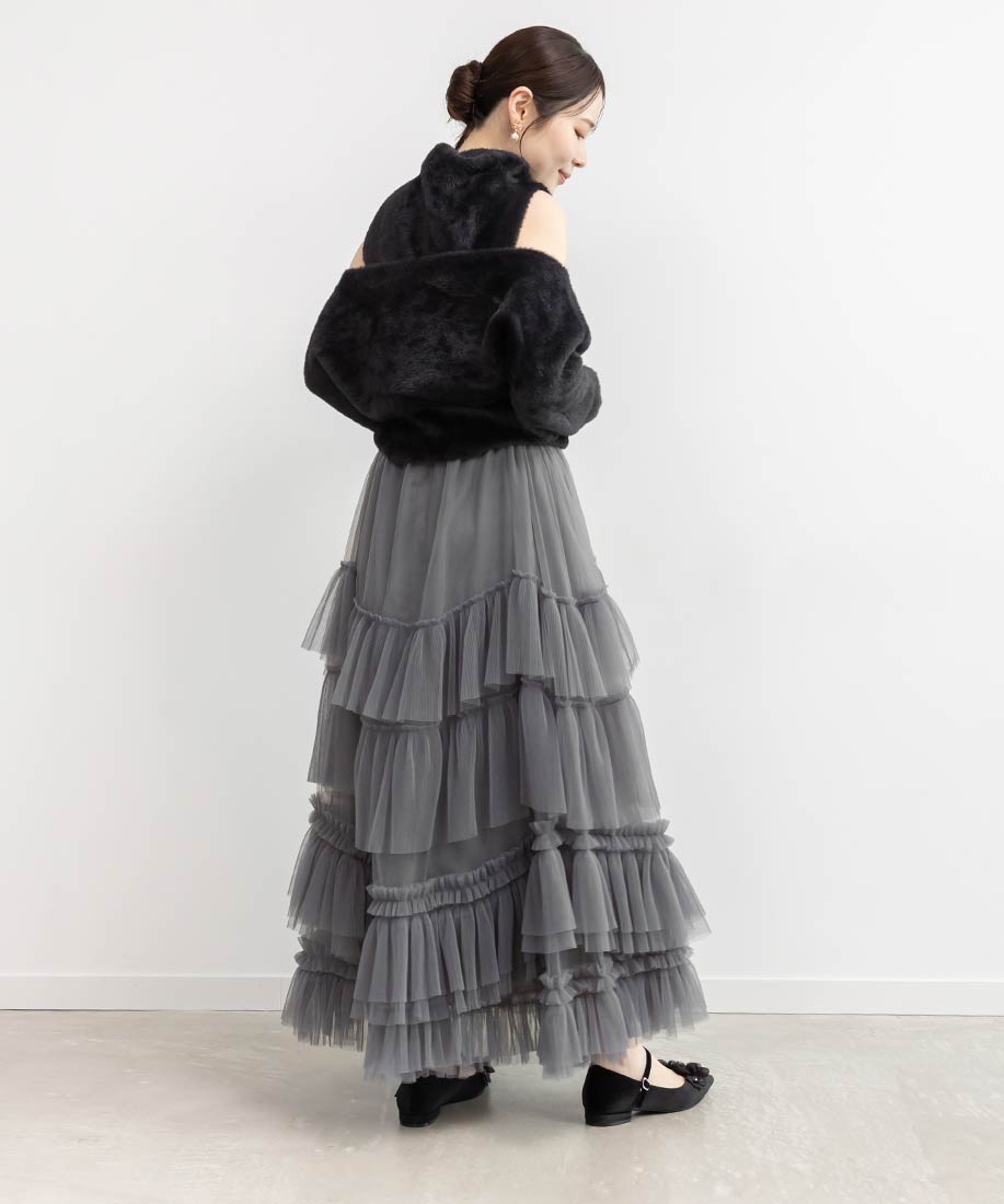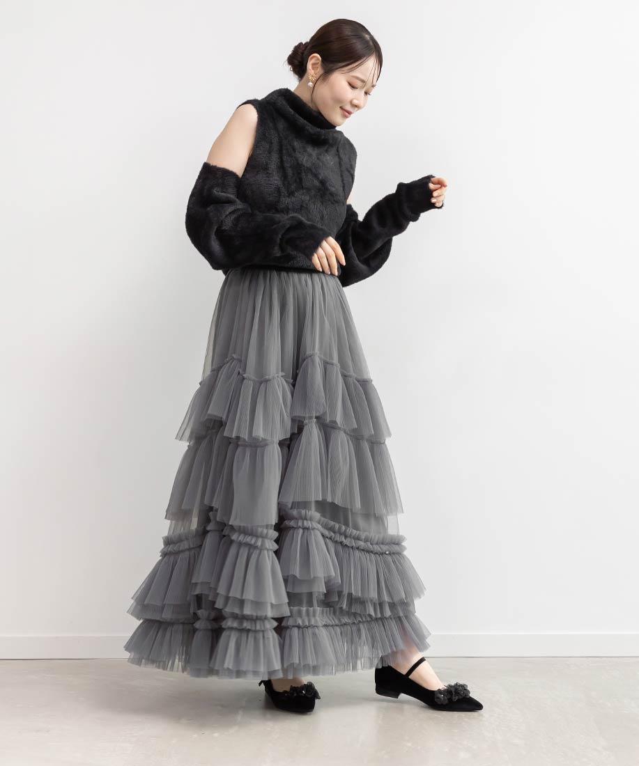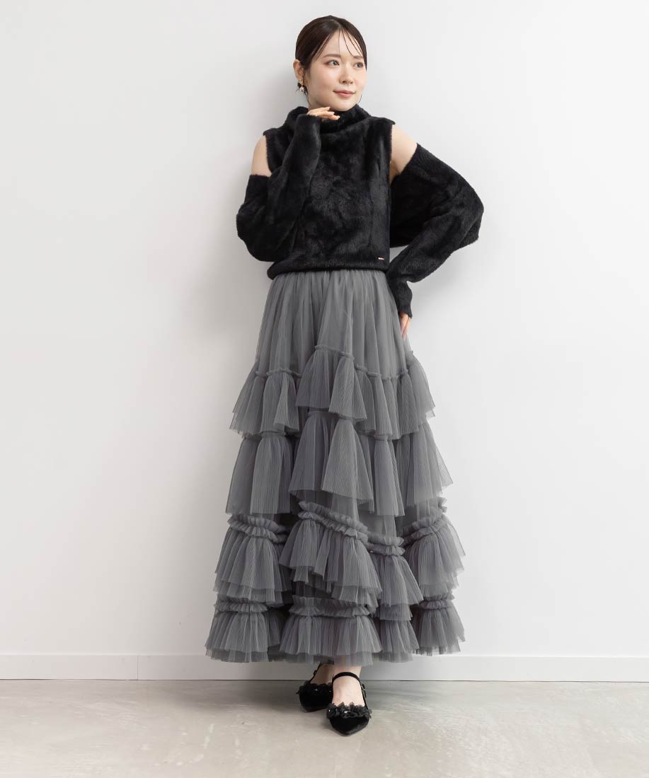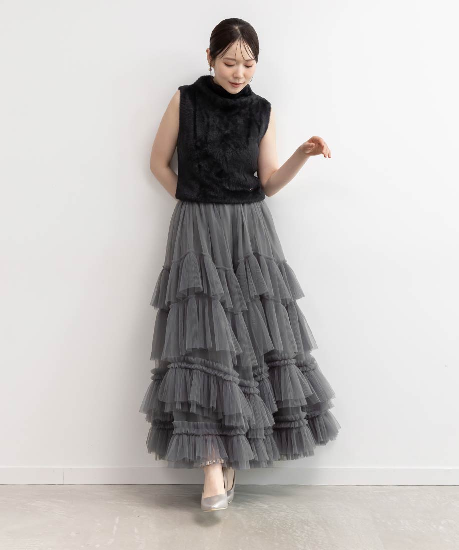 たっぷりと贅沢に施されたプリーツが繊細なチュールスカート。