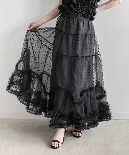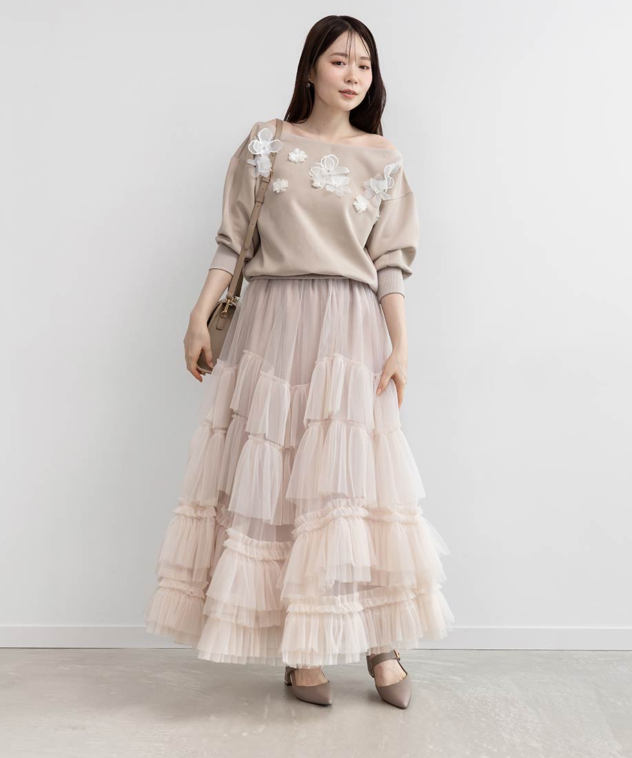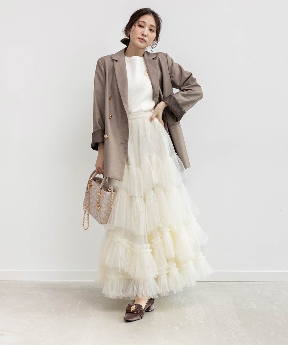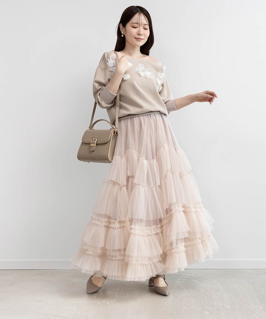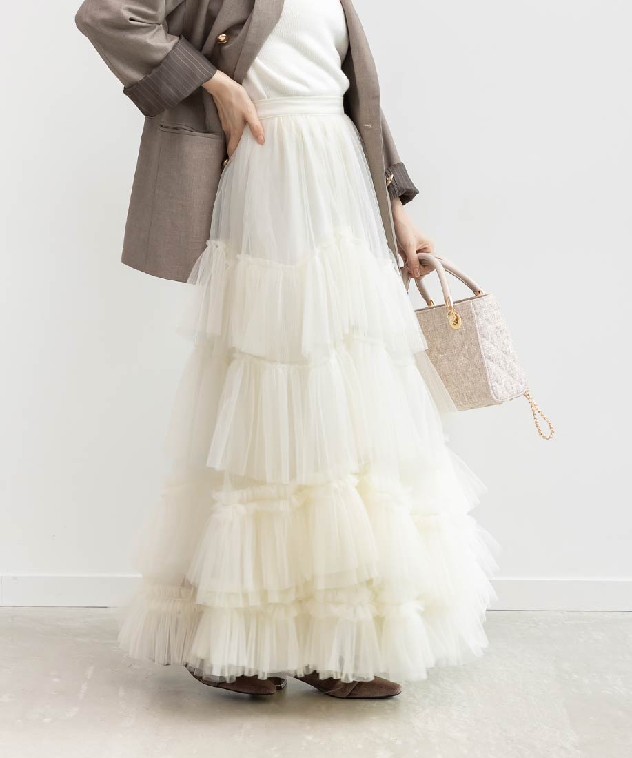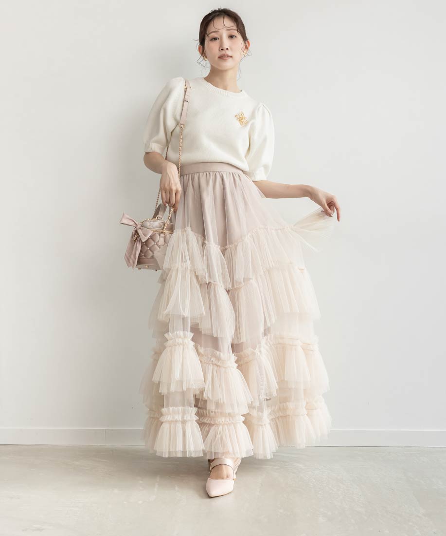 たっぷりと贅沢に施されたプリーツが繊細なチュールスカート。