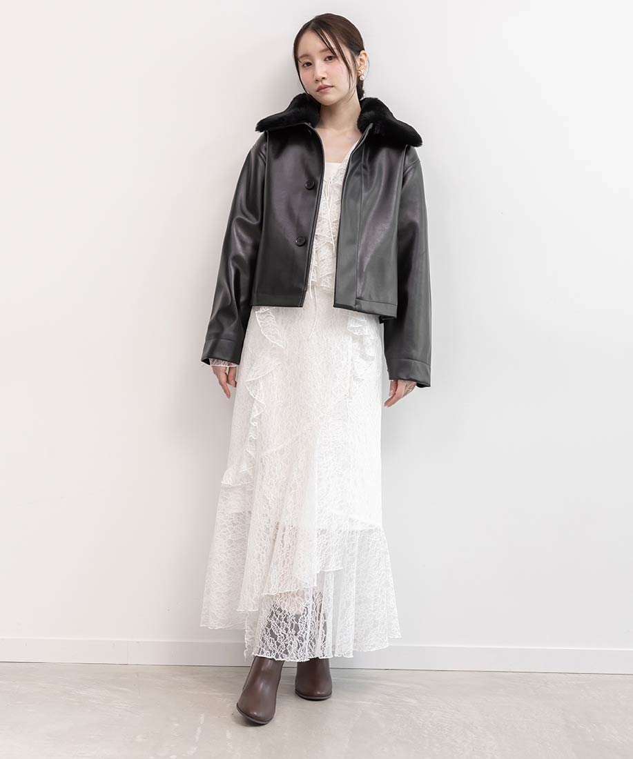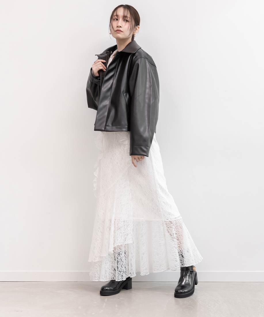 同素材のラッフルレースフリルブラウスとセットアップで着用するのもおすすめです。